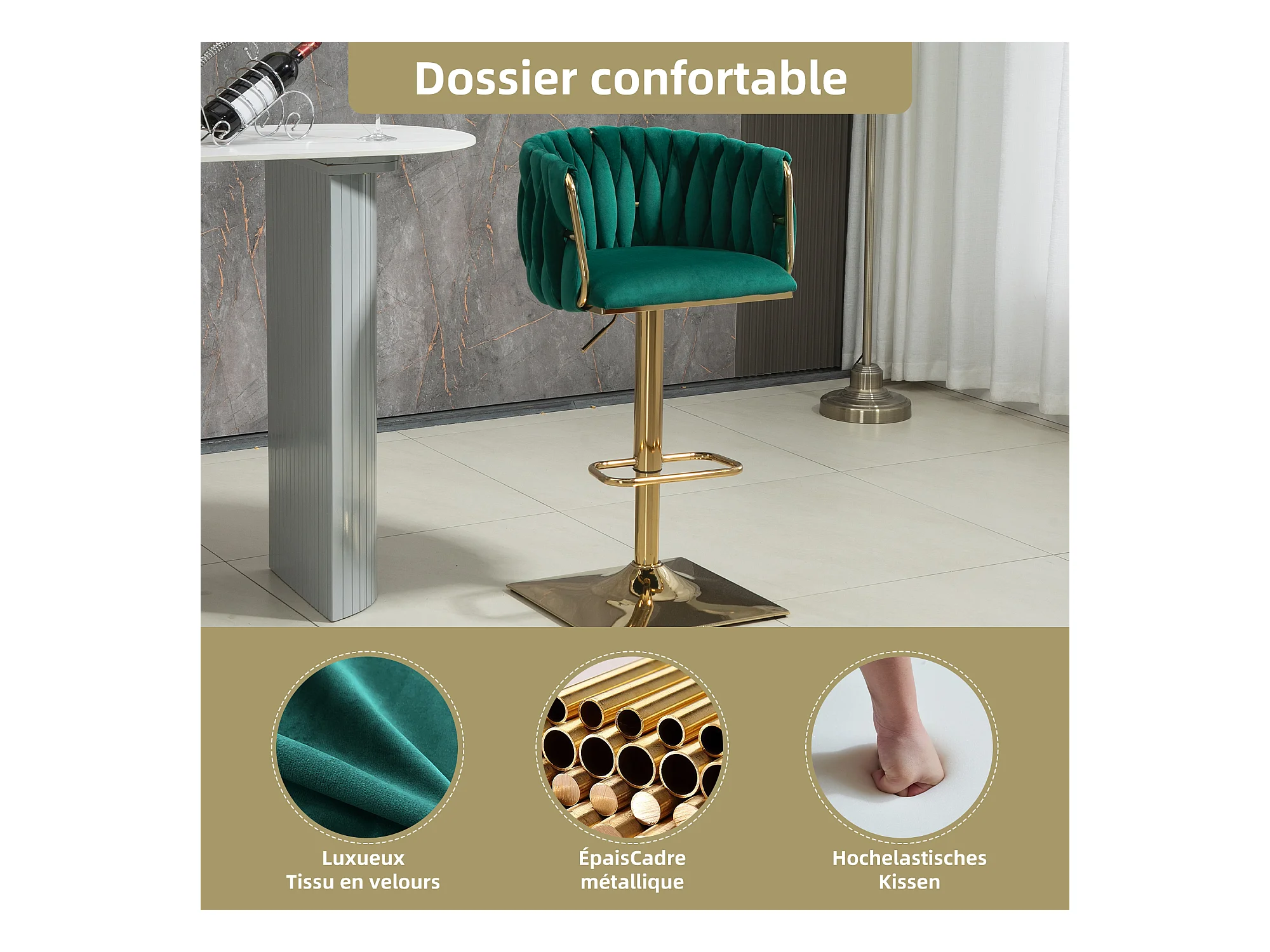 Lot de 2 Tabourets de Bar Tressés en Vert - Pieds en Métal Doré - Repose-Pieds - Hauteur Réglable - Rotation 360° - Idéal pour Cuisine, Salon ou Bar
