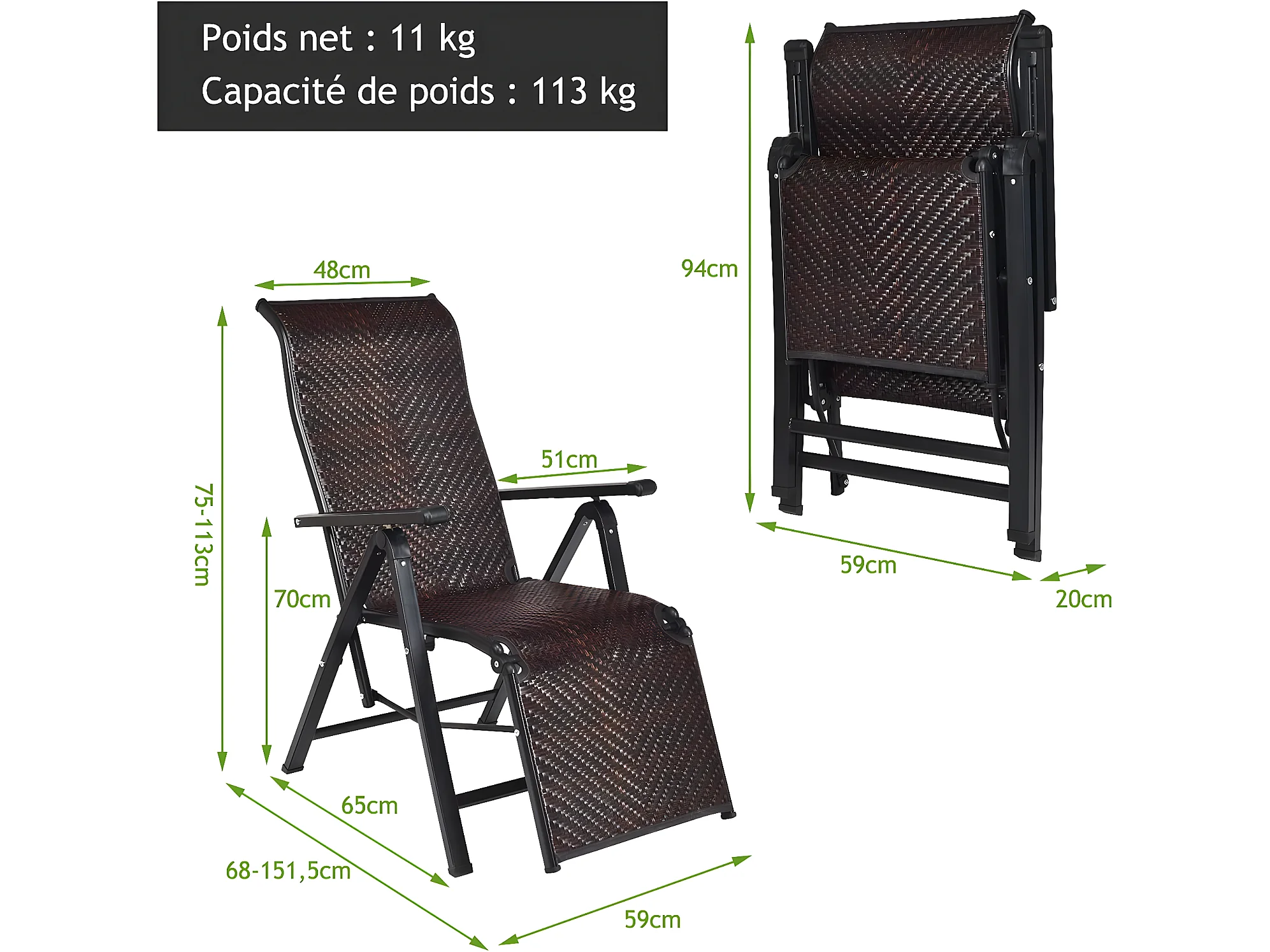 Lot de 2 Transat Chaises Longues de Jardin en Rotin et fibre naturelle avec Position Réglable et Accoudoir, Cadre en Fer, pour, Terrasse, Plage