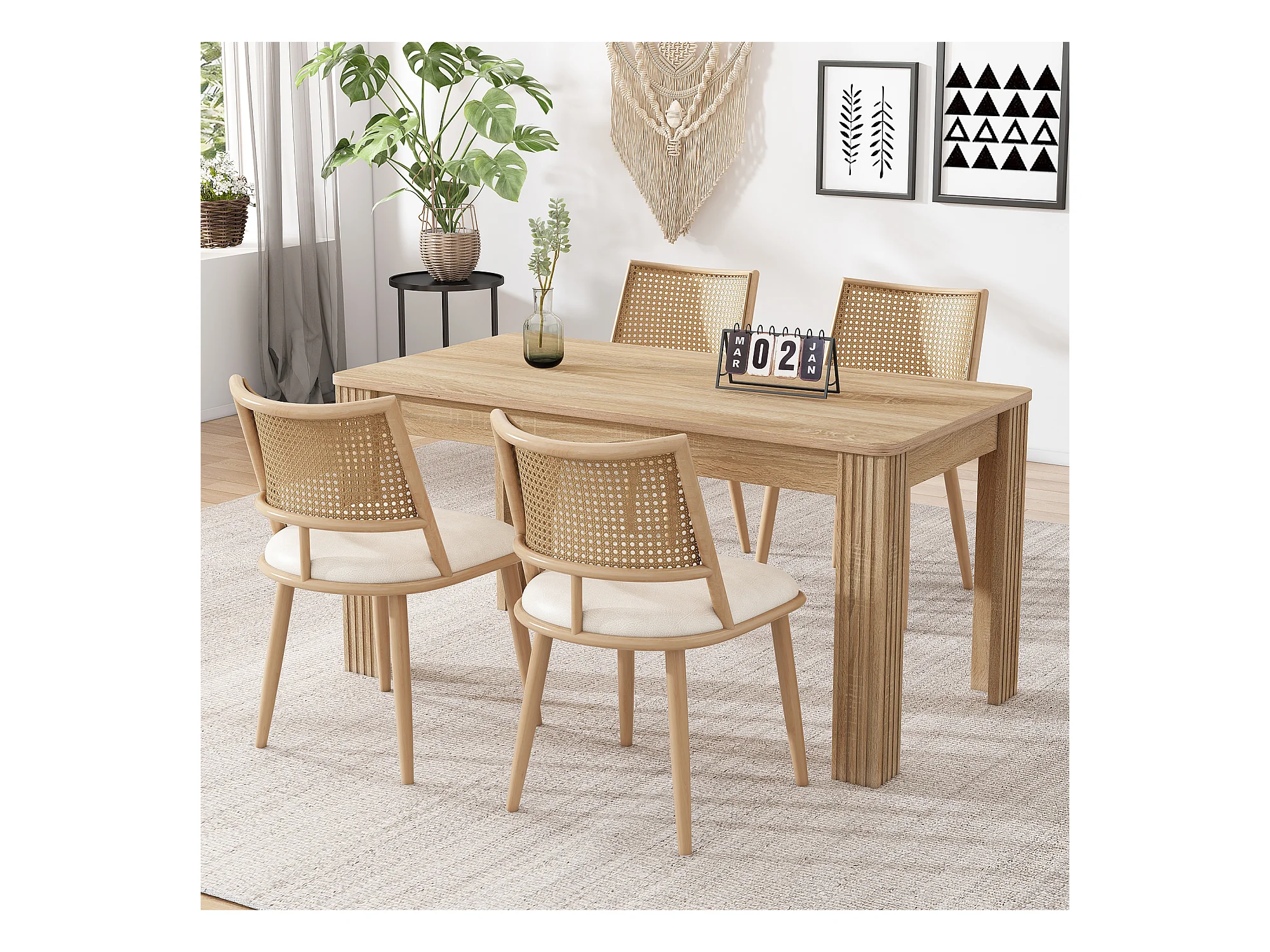 Lot de 4 chaises en rotin et Assise rembourrée en PU, beige
