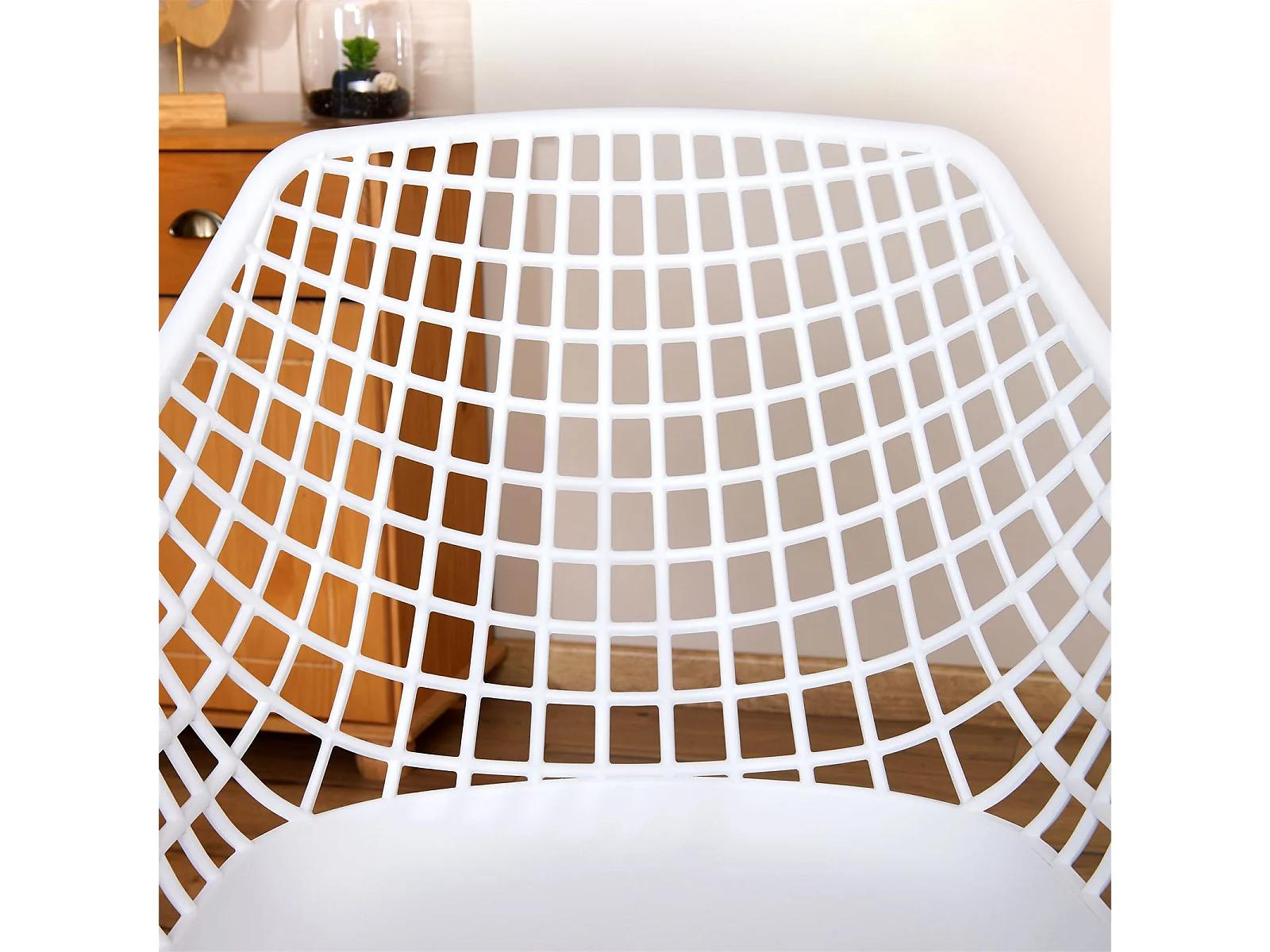 Lot de 4 chaises LUCIA pour salle à mange design retro avec accoudoirs, coque en plastique blanc et pieds en métal décor chêne