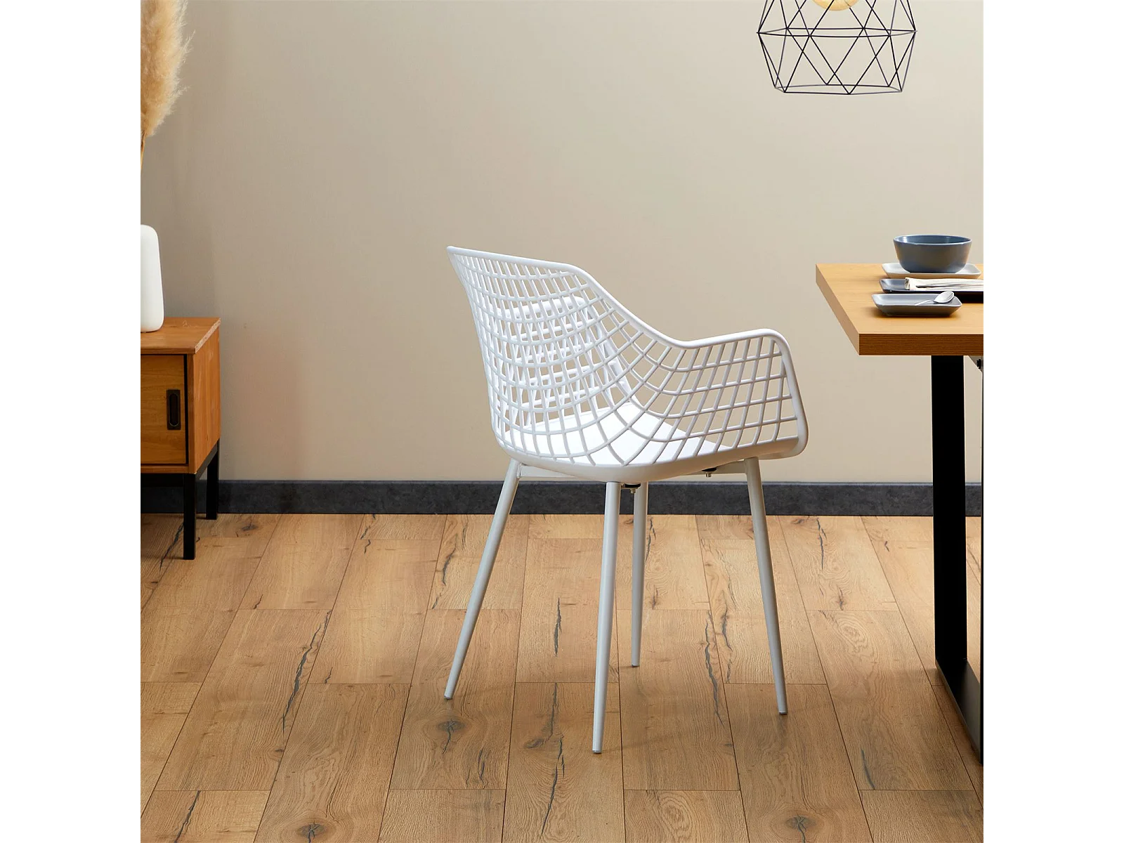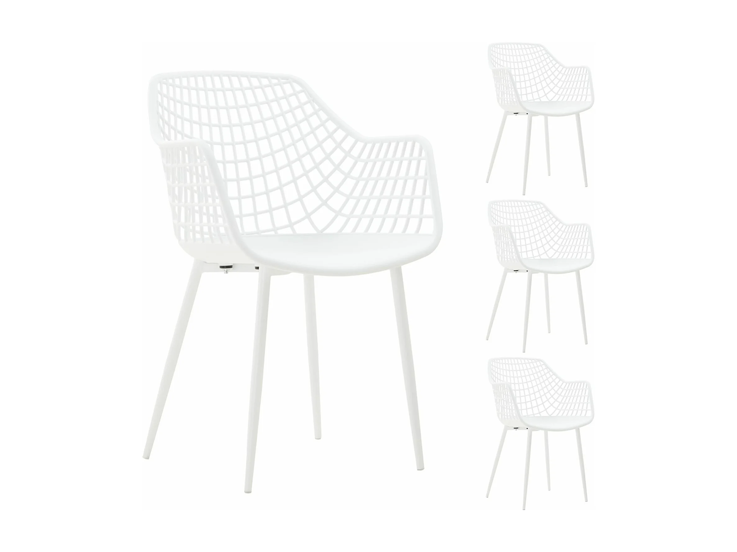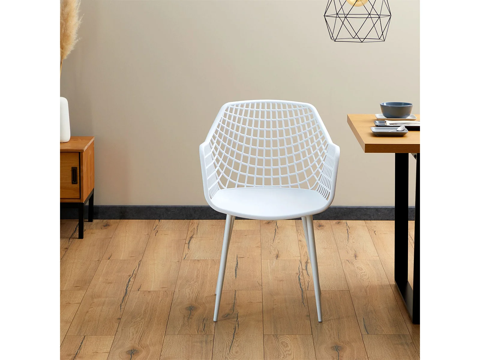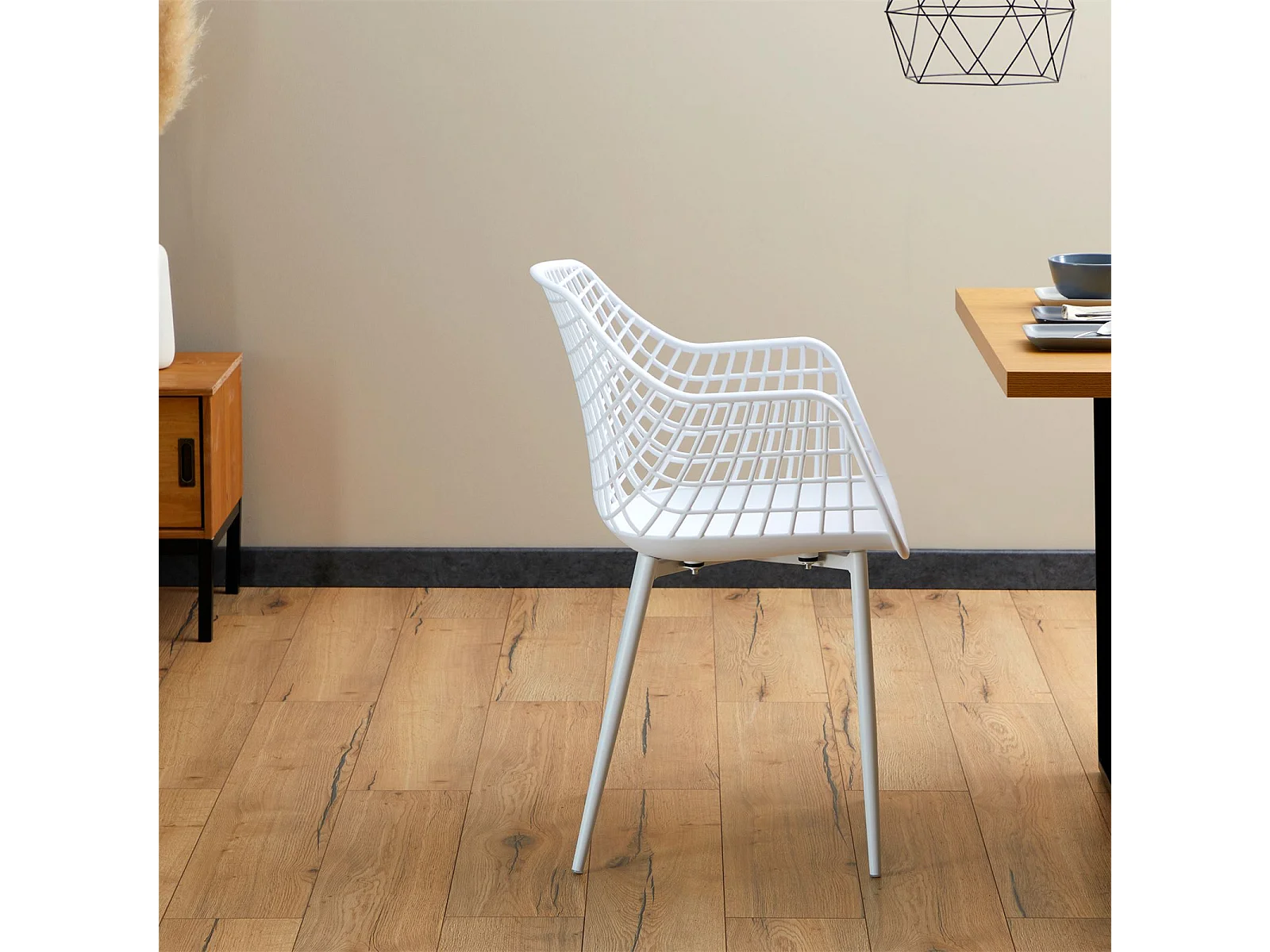 Lot de 4 chaises LUCIA pour salle à manger ou cuisine au design retro, en plastique blanc et 4 pieds en métal laqué blanc