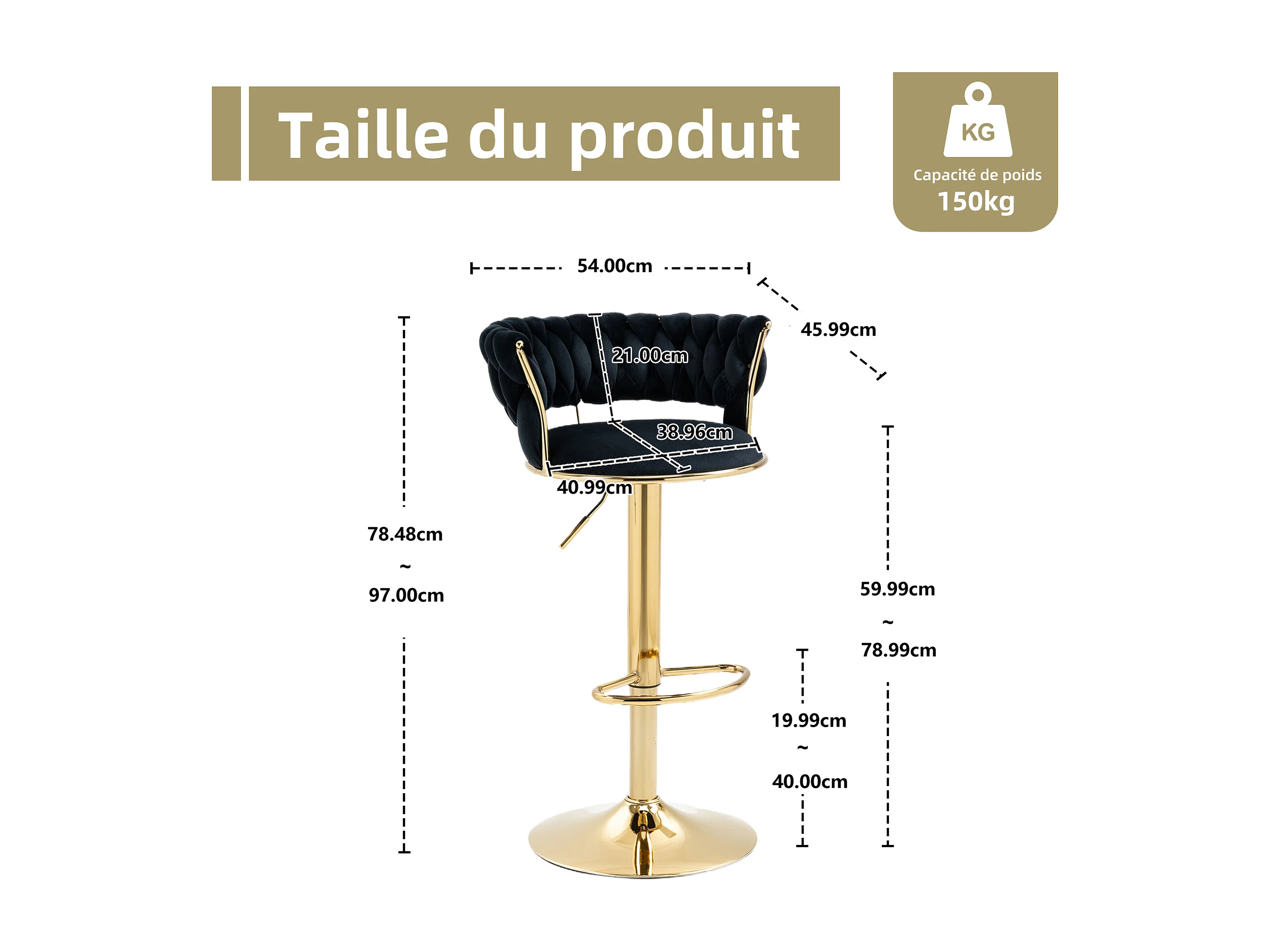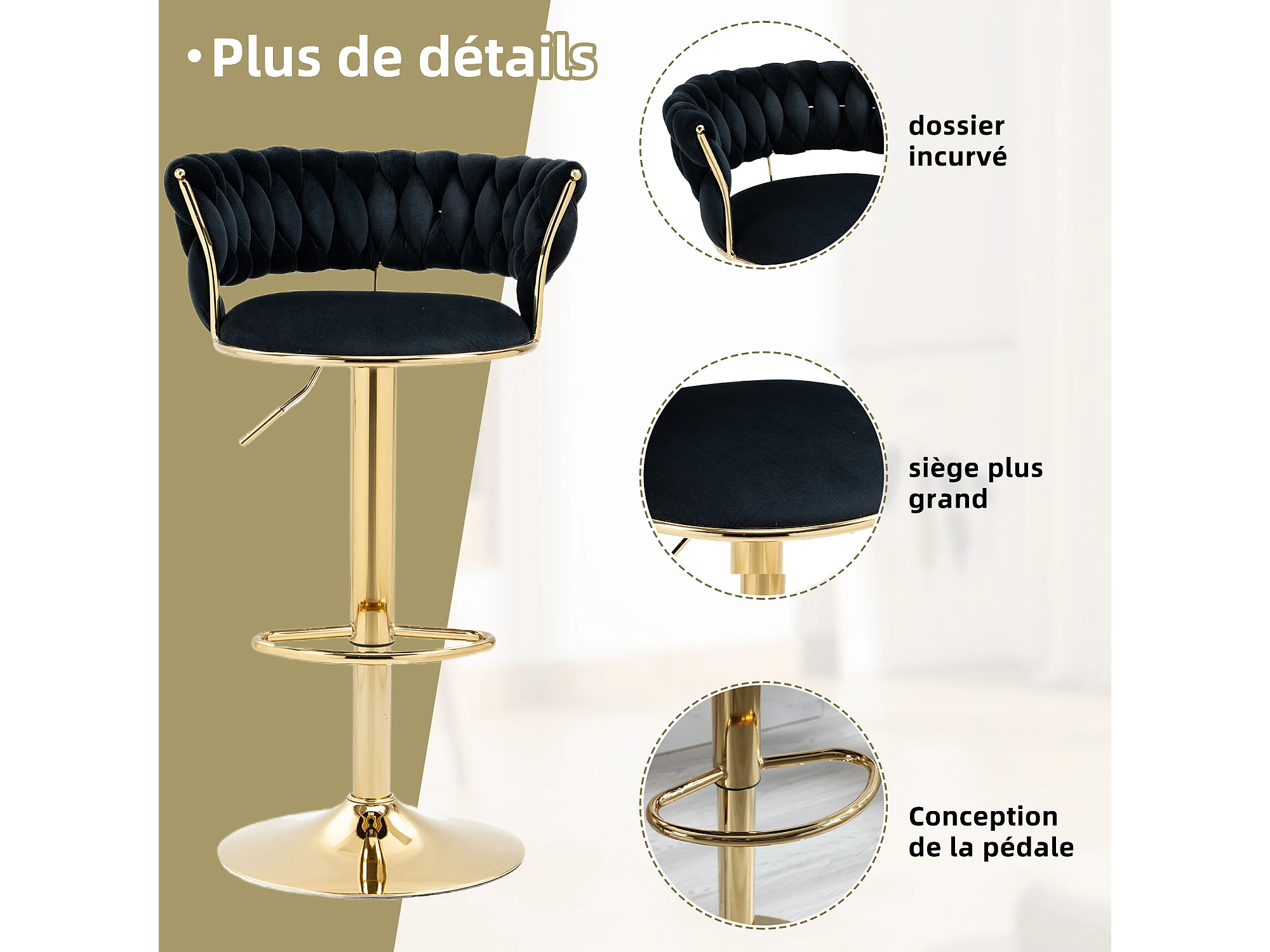 Lot de 4 Tabourets de Bar – Assise Tissée Noire – Pieds Dorés – Hauteur Réglable – 360° Rotatifs – Idéal pour Cuisine et Bar