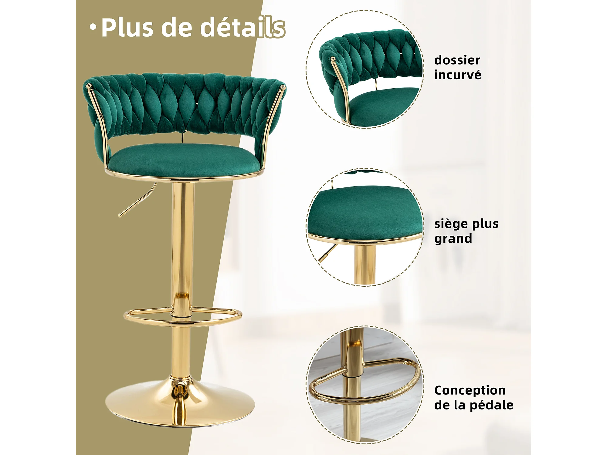 Lot de 4 Tabourets de Bar – Assise Tissée Verte – Pieds Dorés – Hauteur Réglable – 360° Rotatifs – Idéal pour Cuisine et Bar