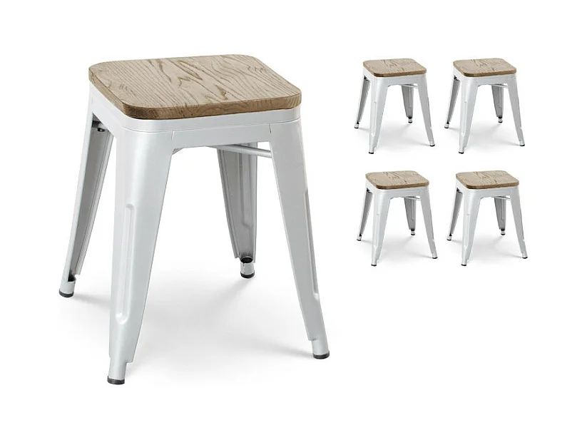 Lot de 4 tabourets en métal blanc mat style industriel et assise en bois clair - Hauteur 46 cm