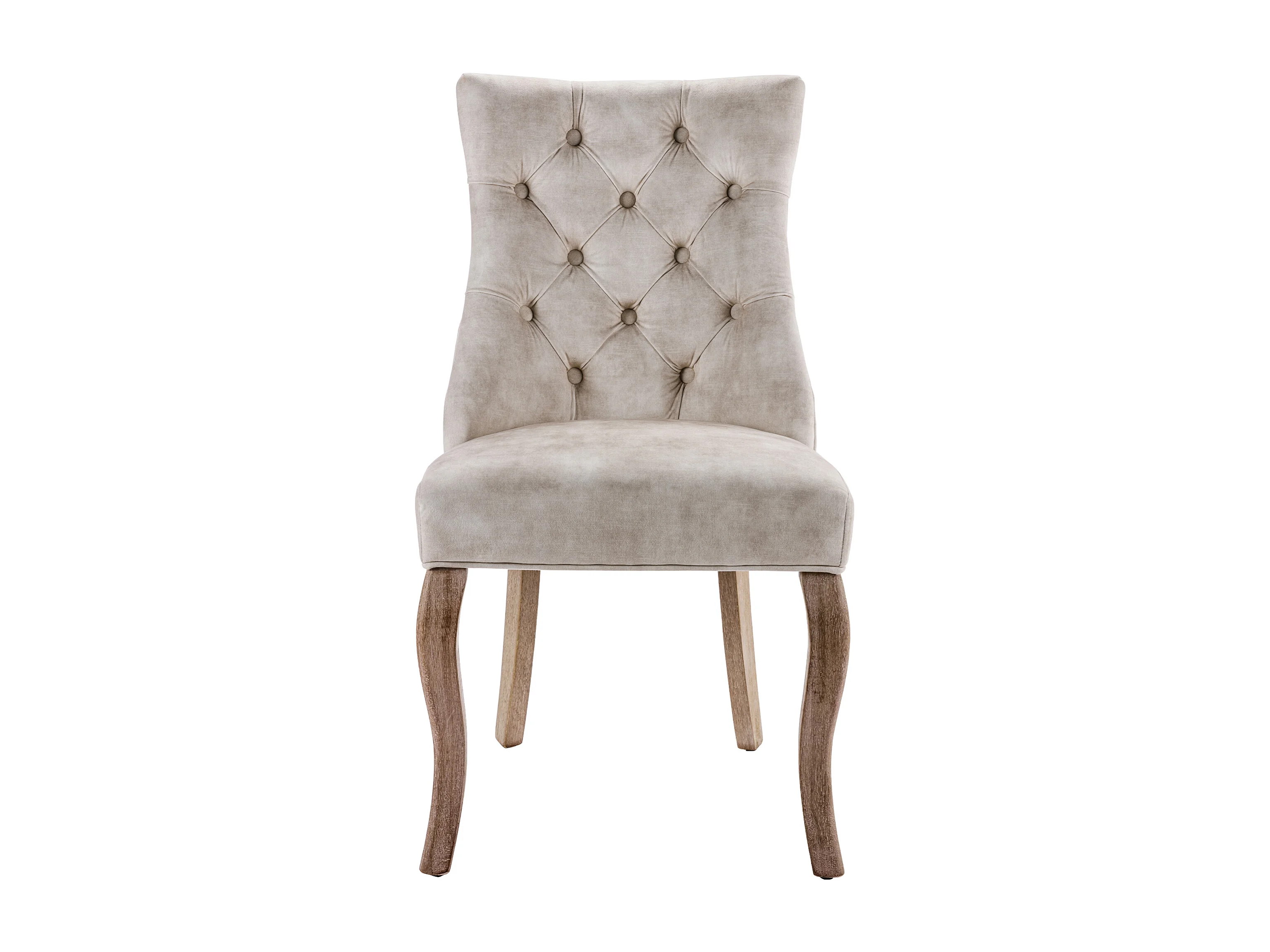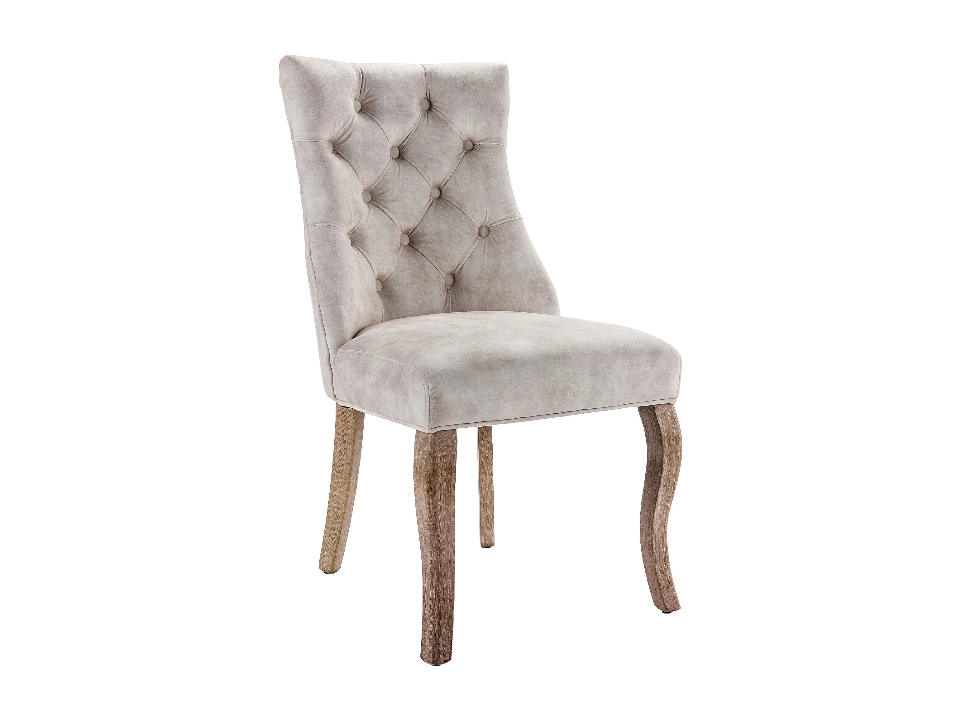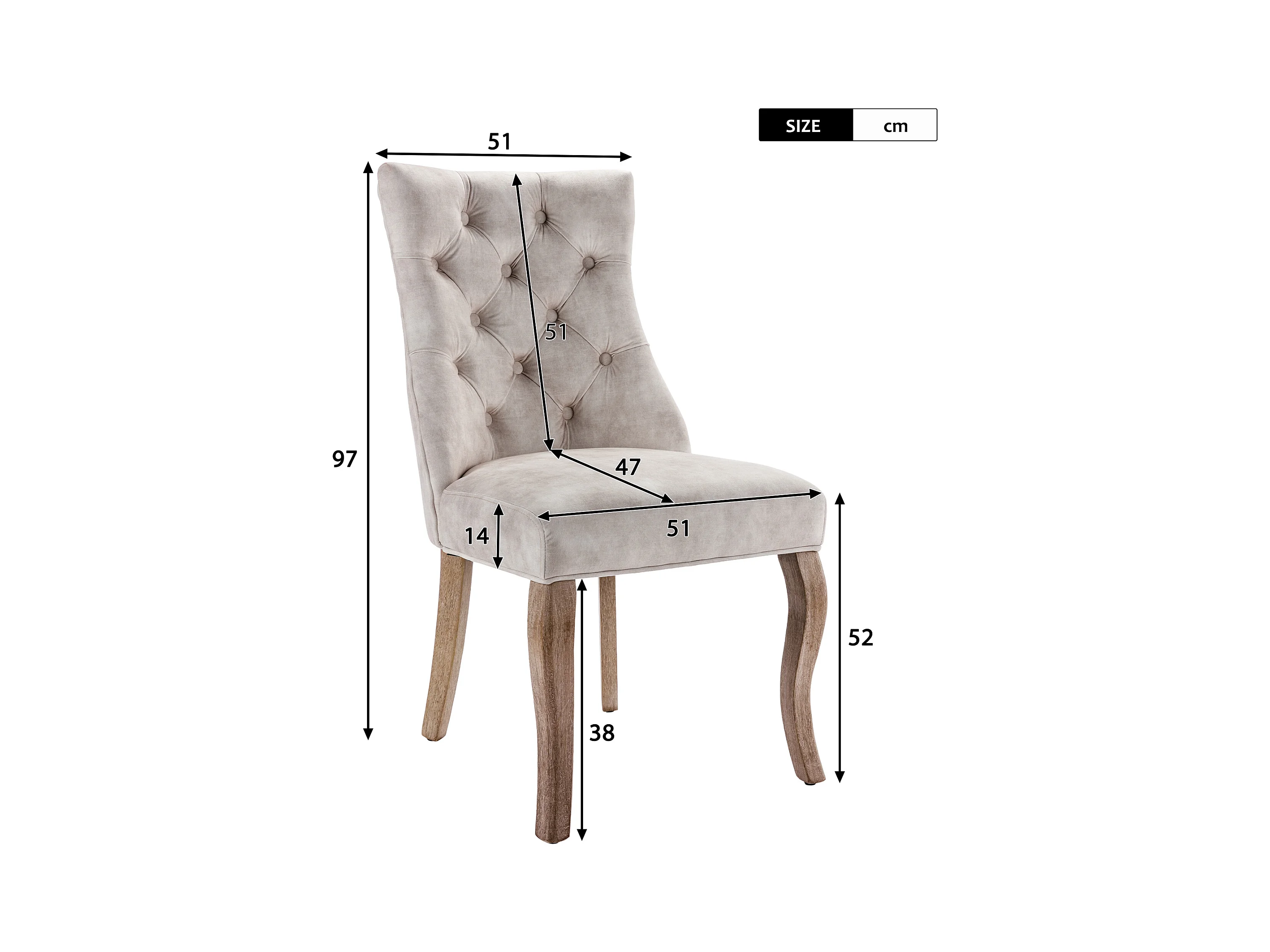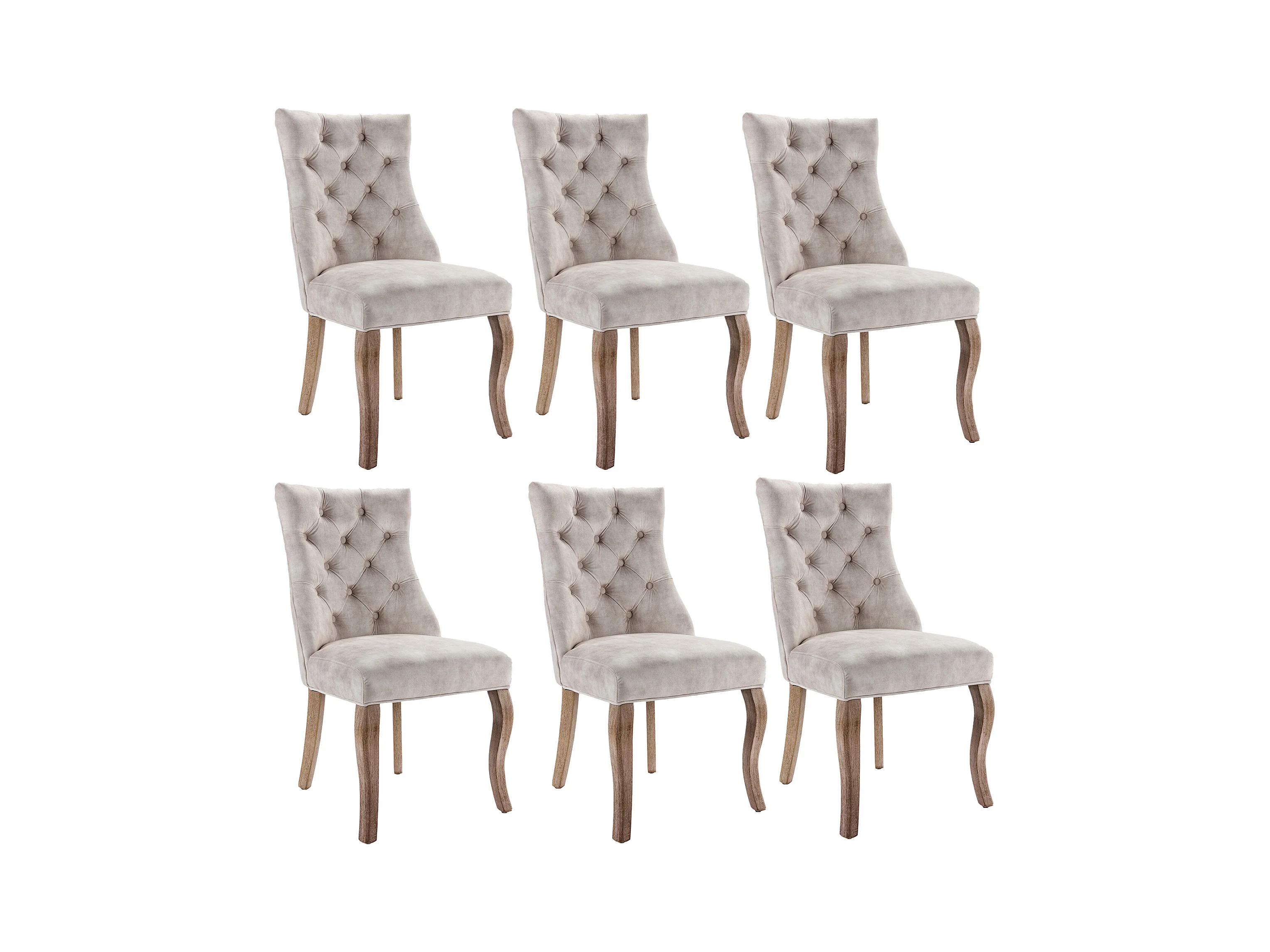 Lot de 6 chaises en velours beige clair avec pieds en bois courbés, boutons décoratifs