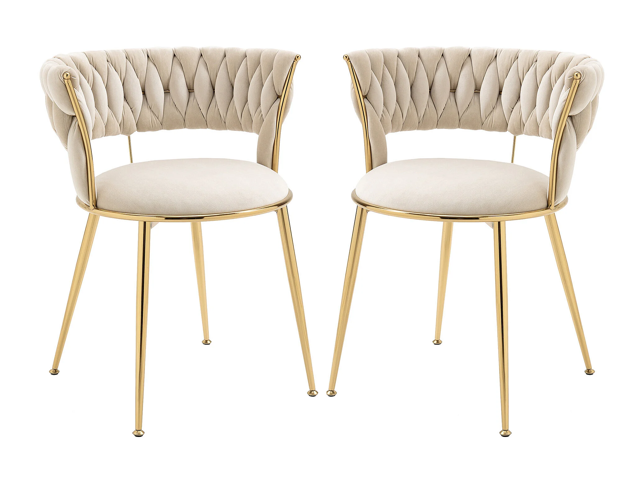 Lot de 6 chaises en velours ivoire - dossier ajouré tressé et pieds dorés - Idéales pour intérieur chic et contemporain