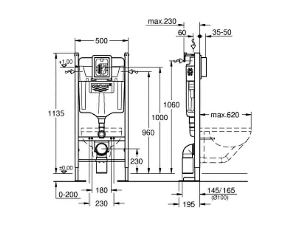 Lot WC modèle suspendu VILLEROY ET BOCH Universo TwistFlush blanc + bâti et plaque blanche GROHE