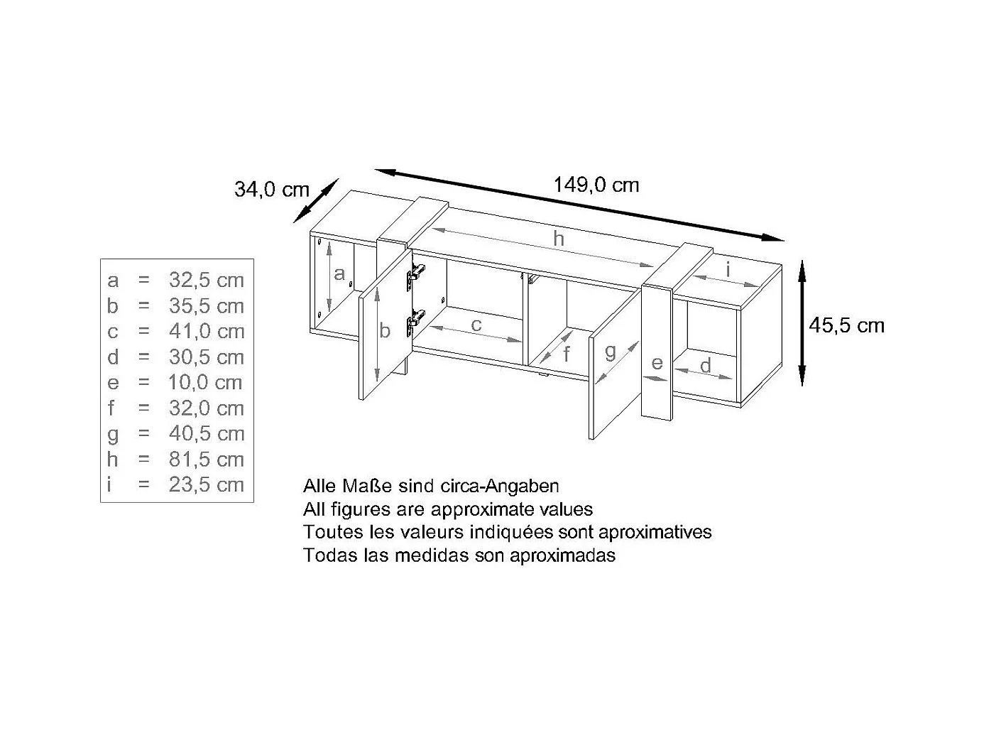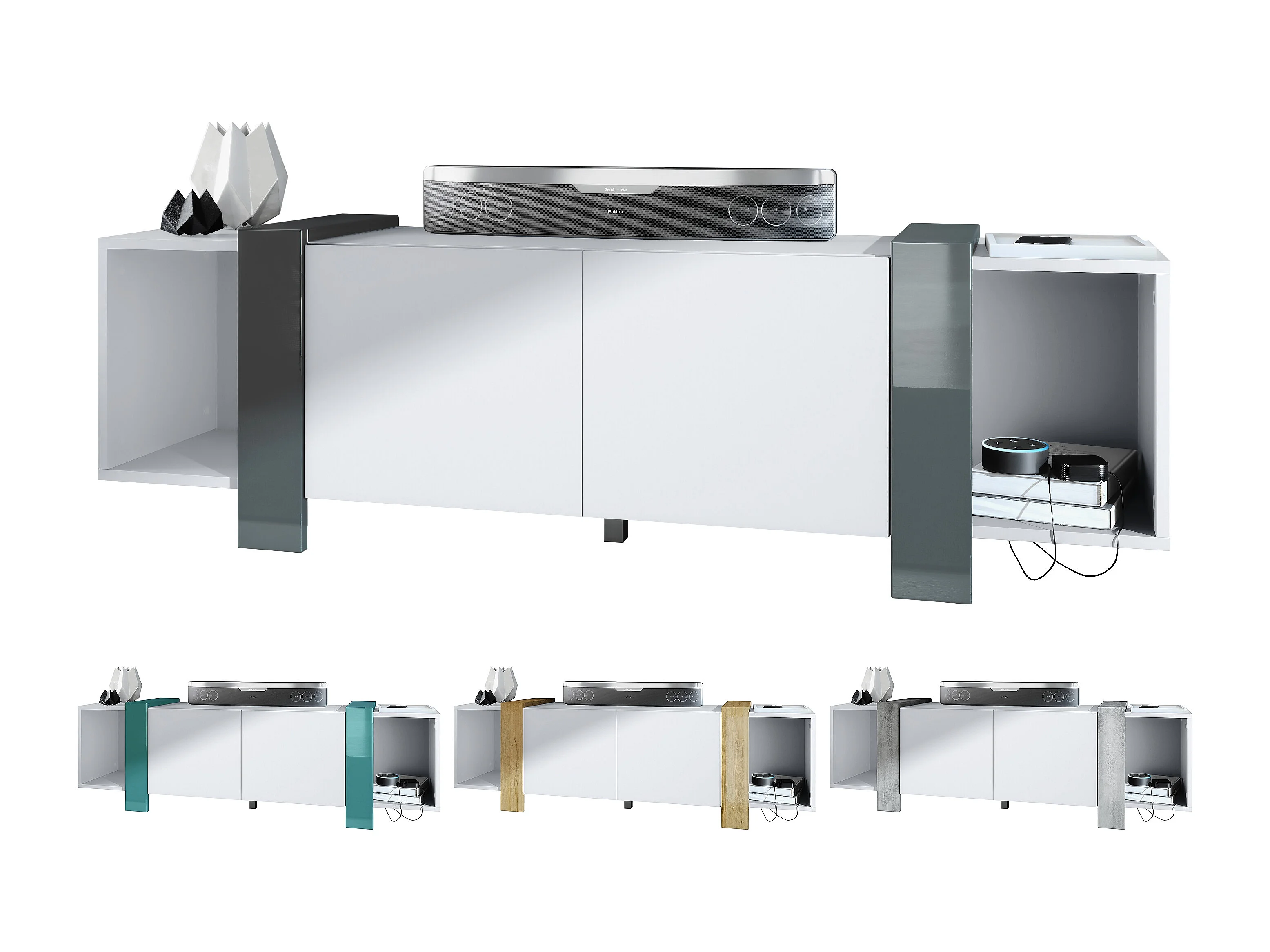 Lowboard Ida 149 x 45,5 x 34 cm Buffet TV avec 4 compartiments et portes PTO, caisson en blanc mat, façades en Noir haute brillance | Grand choix de couleurs