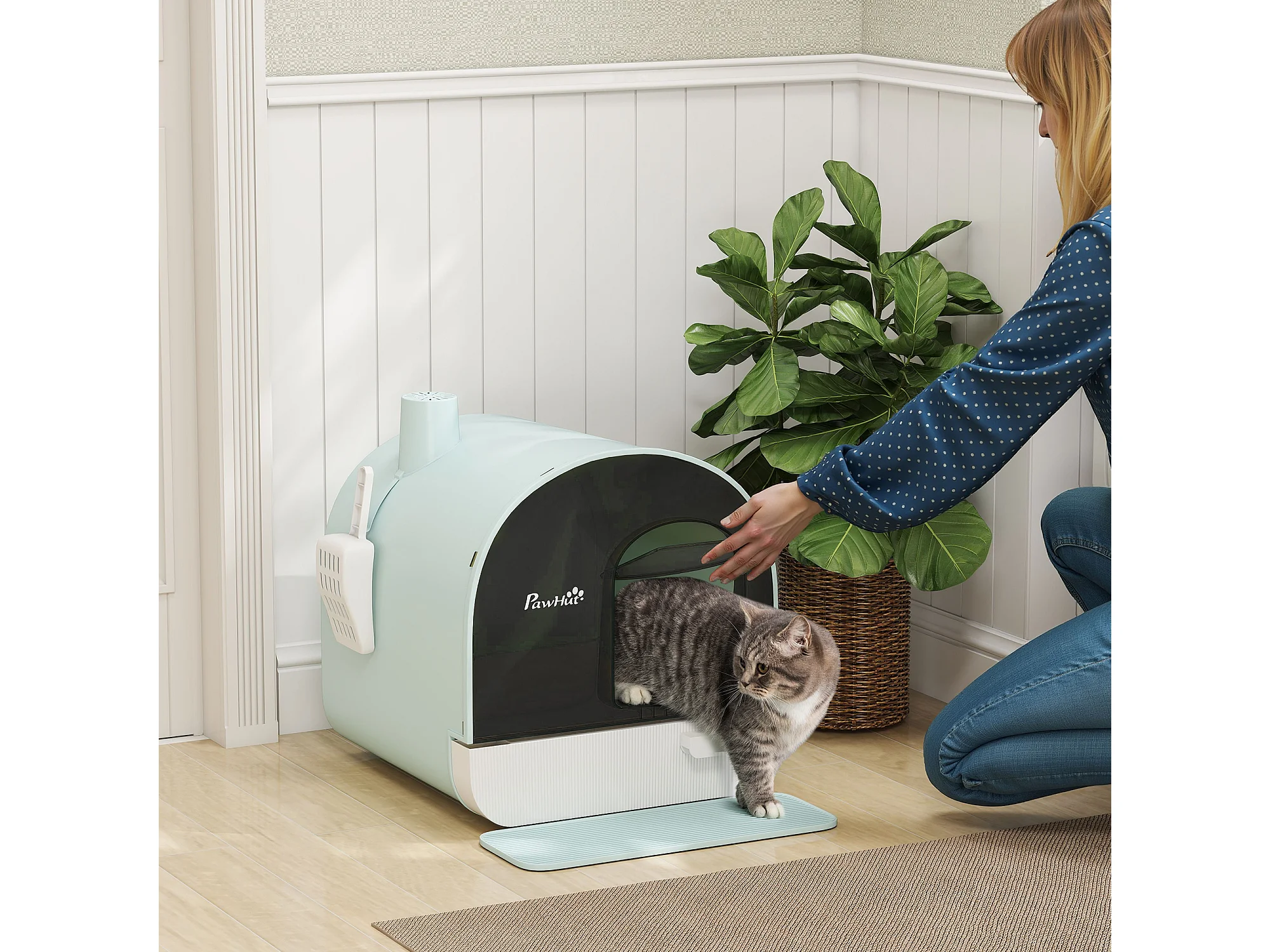 Maison de toilette chat design maisonnette porte battante pelle filtre tapis bleu