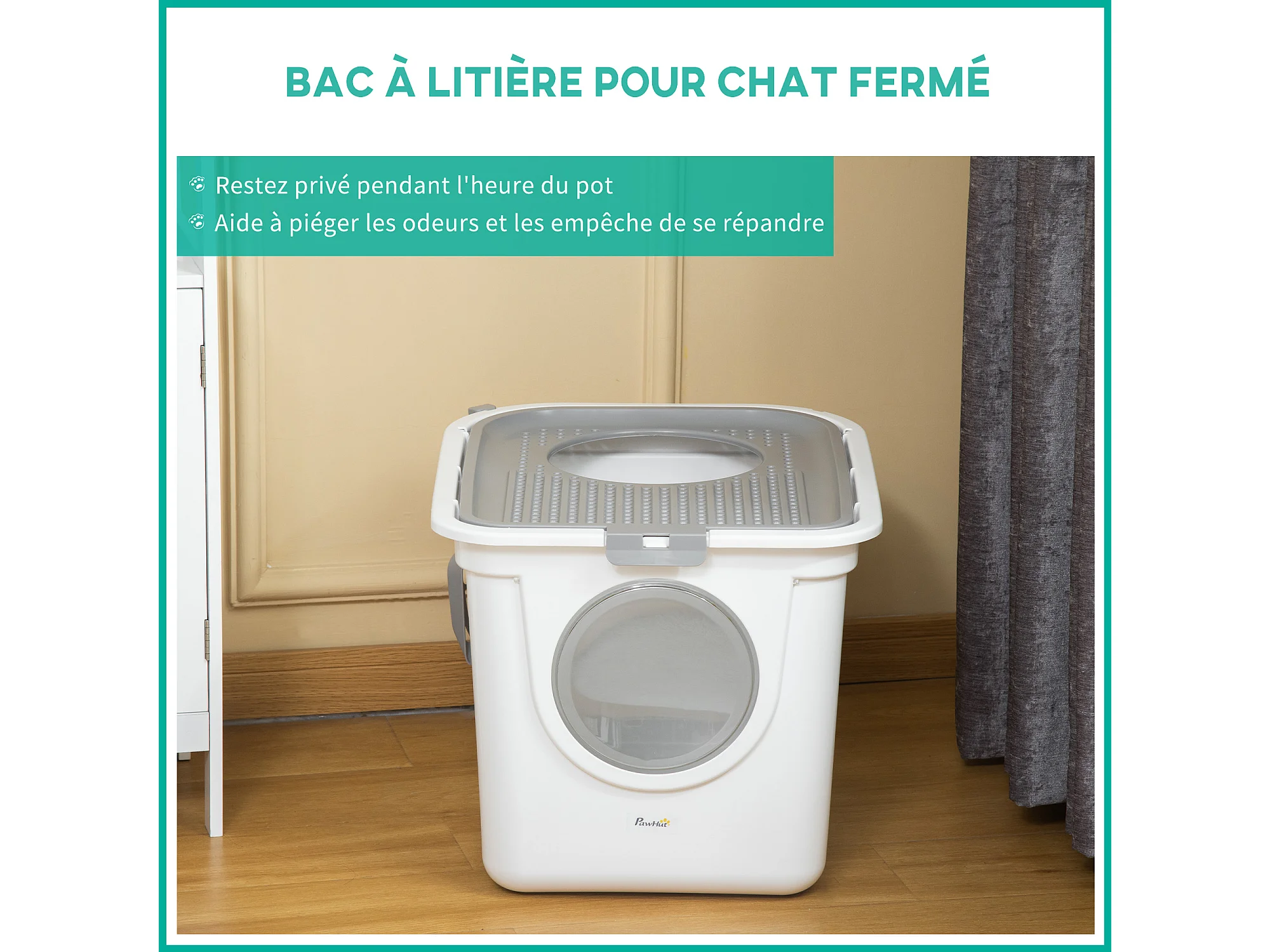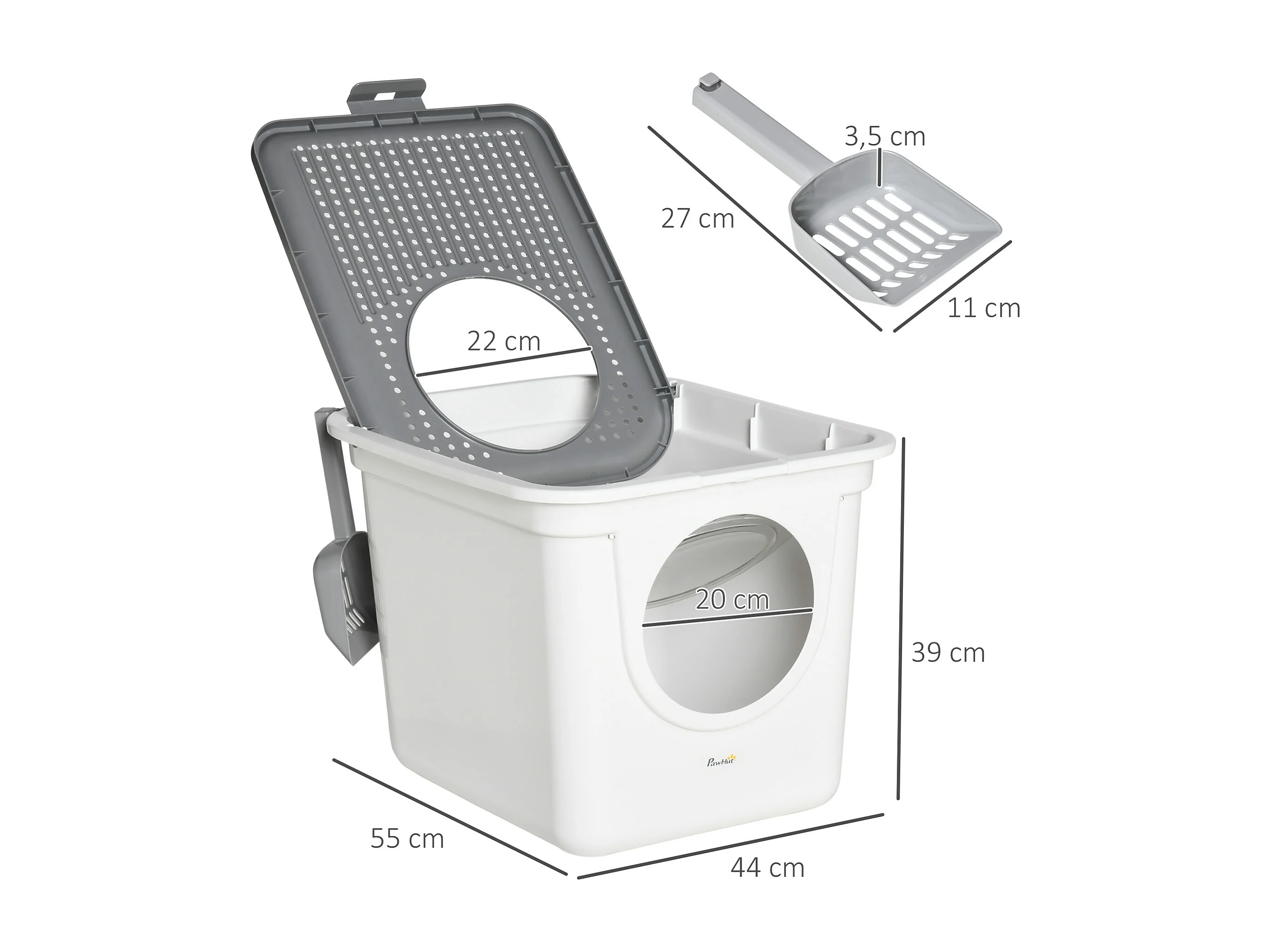 Maison de toilette litière pour chat double porte battante et supérieure - pelle incluse - blanc gris