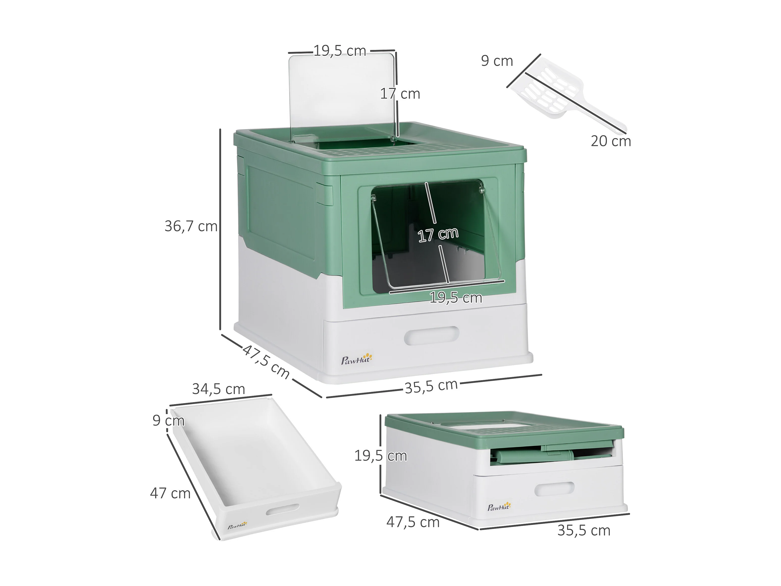 Maison de toilette pliable pour chat - tiroir à litière coulissant, porte battante et trappe transparente, pelle - blanc vert
