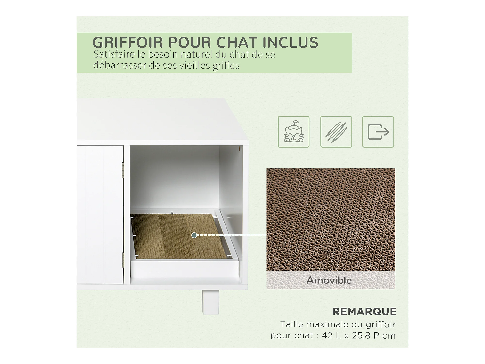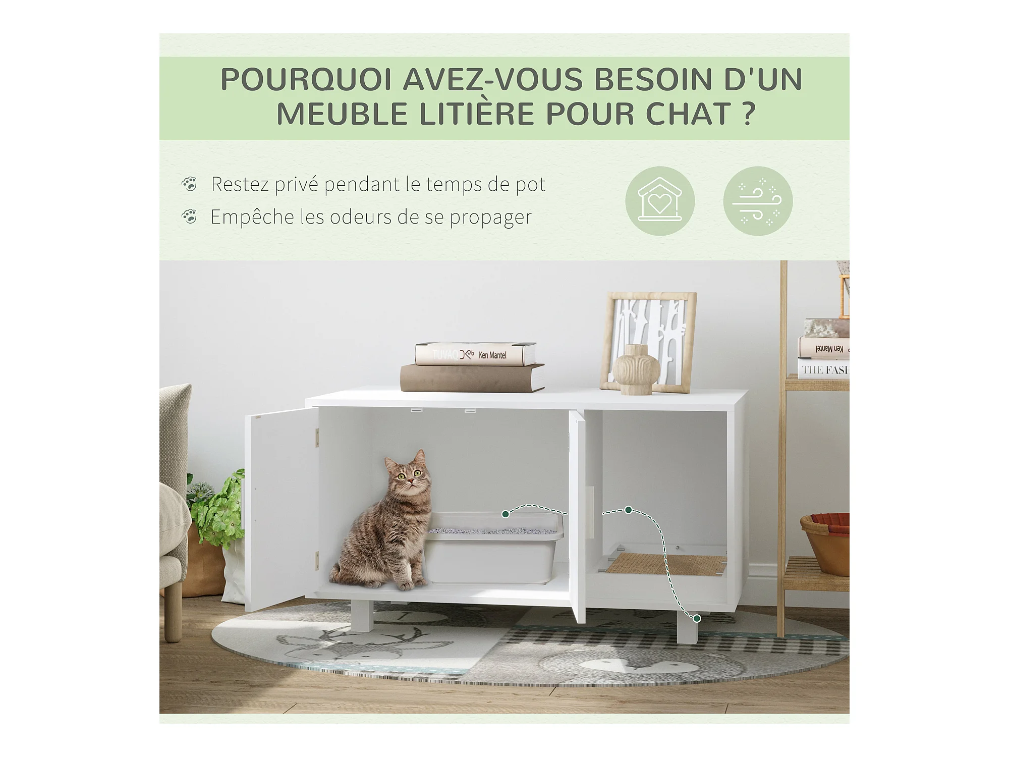 Maison de toilette chat design maisonnette - pelle, 2 désodorisants, plateau coulissant intégrés - blanc vert