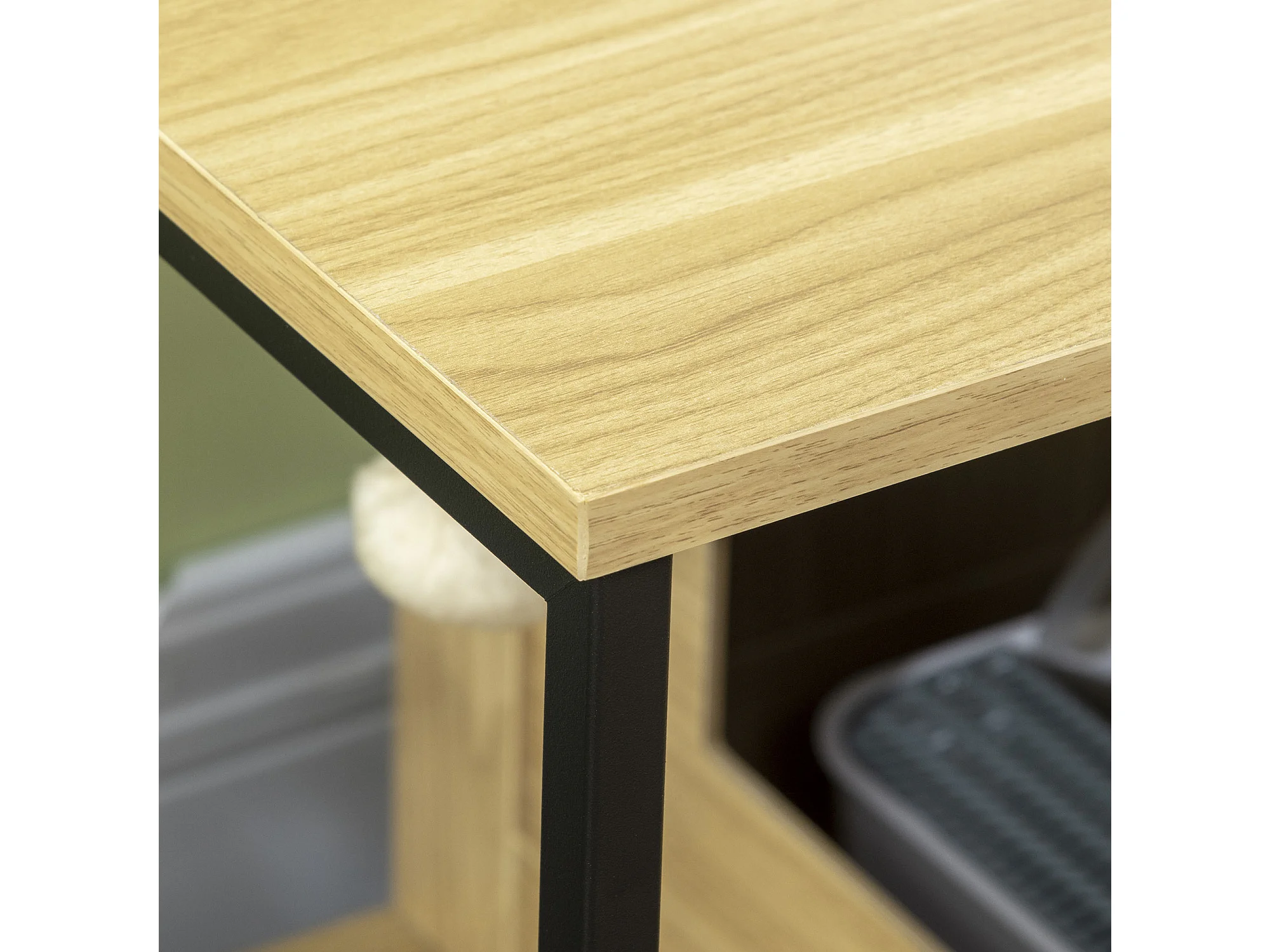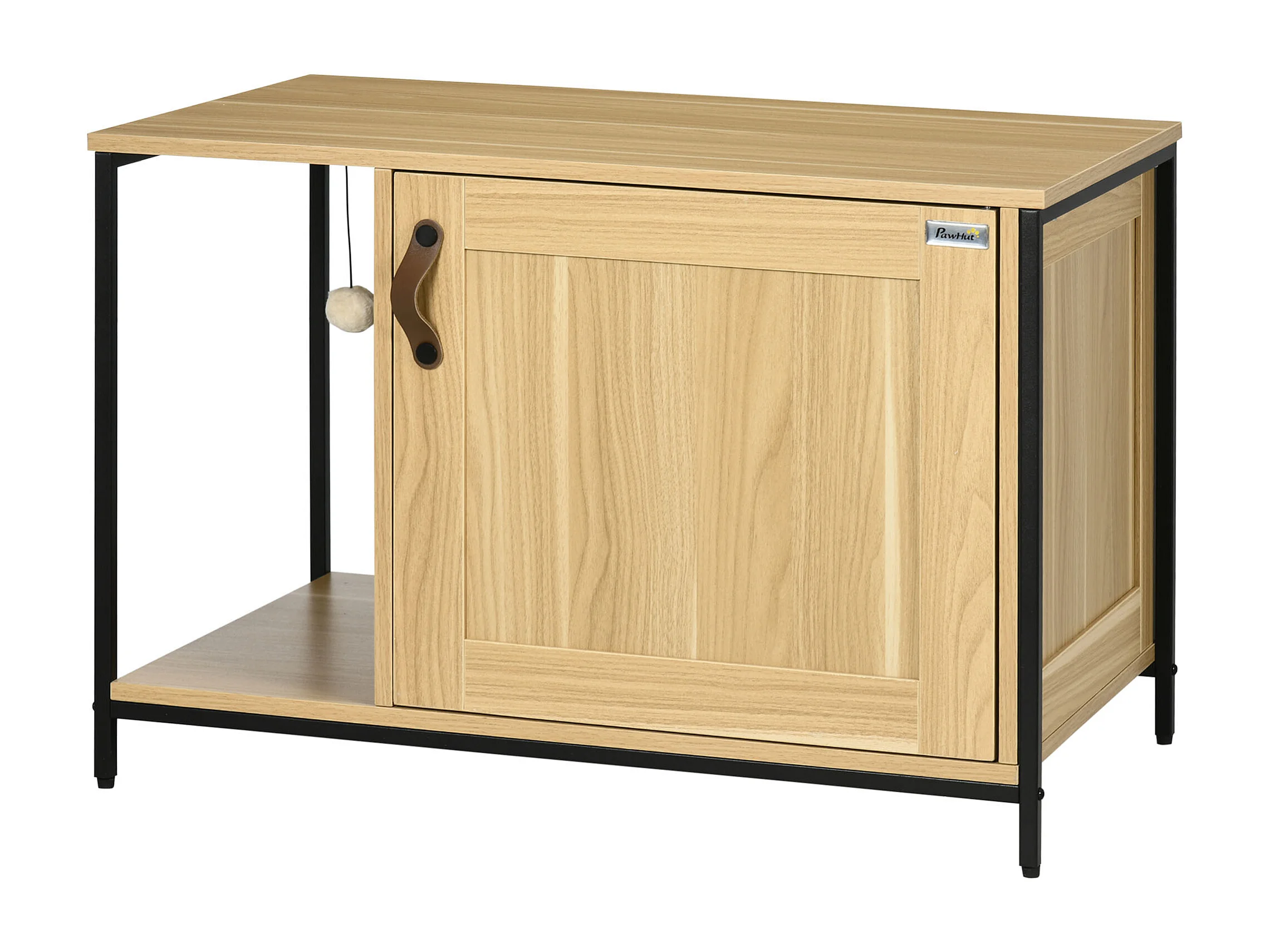 Maison de toilette pour chat style industriel porte entrée latérale boule suspendue châssis acier aspect bois clair