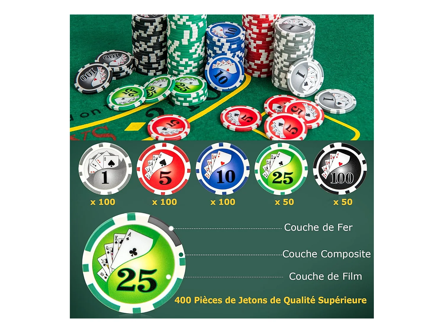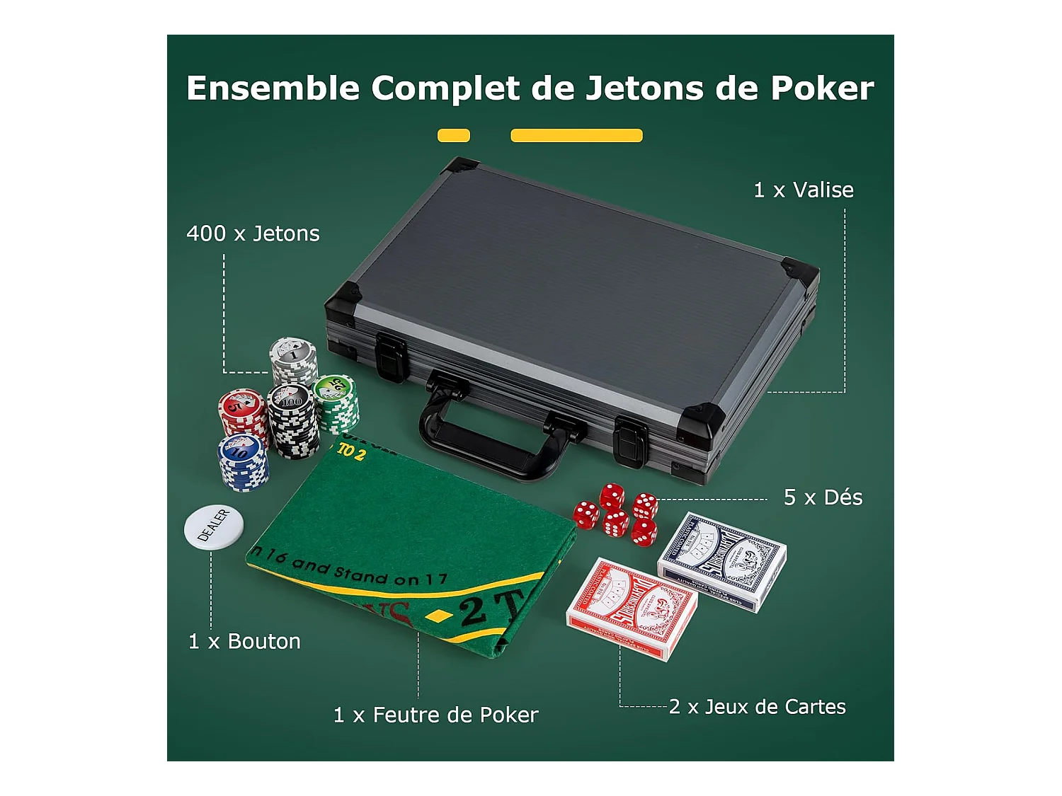 Mallette de Poker en Aluminium avec 400 Jetons & 2 Jeux de Cartes & 5 Dés, Coffret de Poker Verrouillable avec 1 Dealer & Tapis en Feutre & 2 Clés