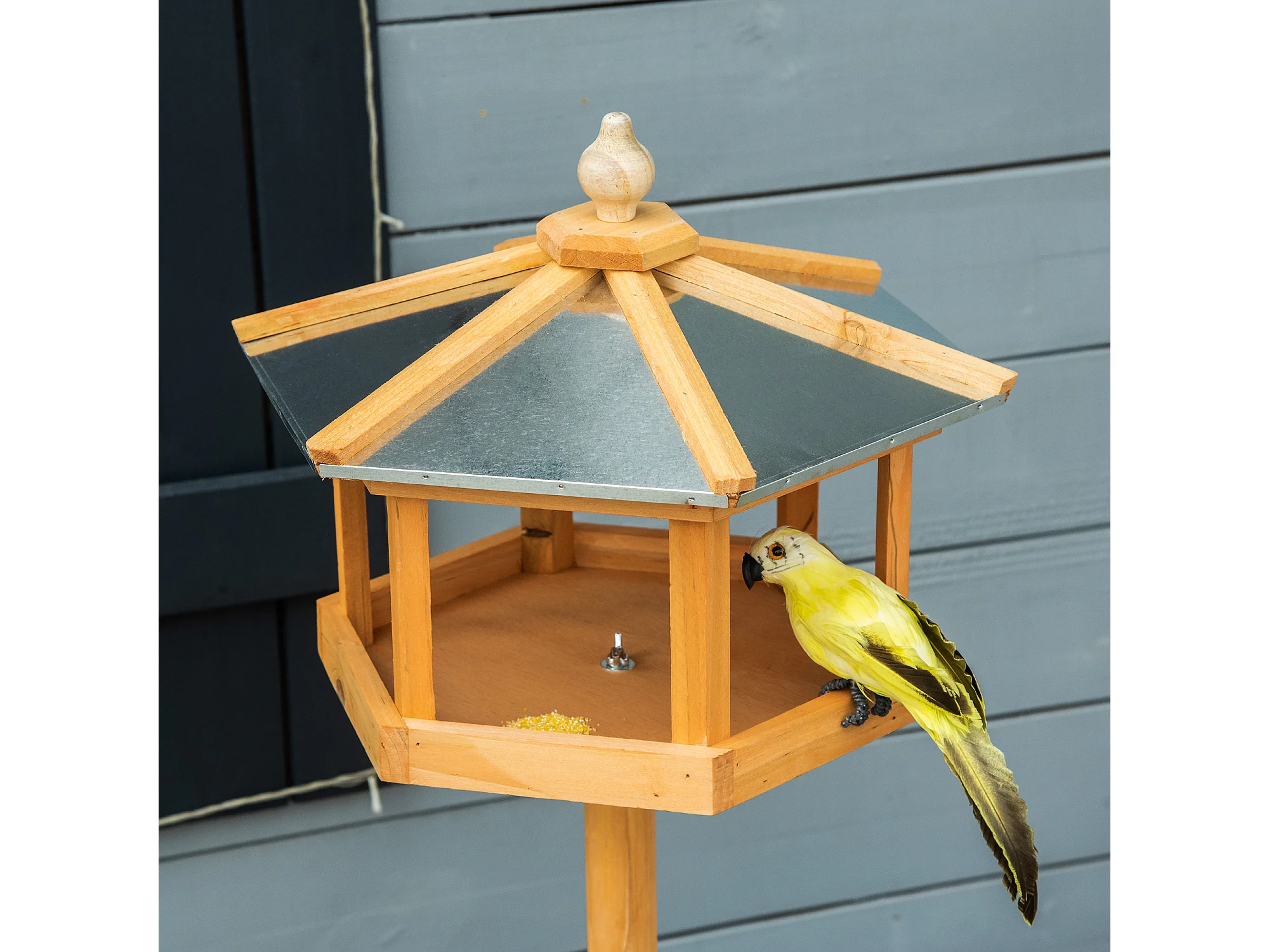 Mangeoire pour oiseaux hexagonale avec toit en zinc, pied stable, bois de sapin, naturel (40x40x113cm)