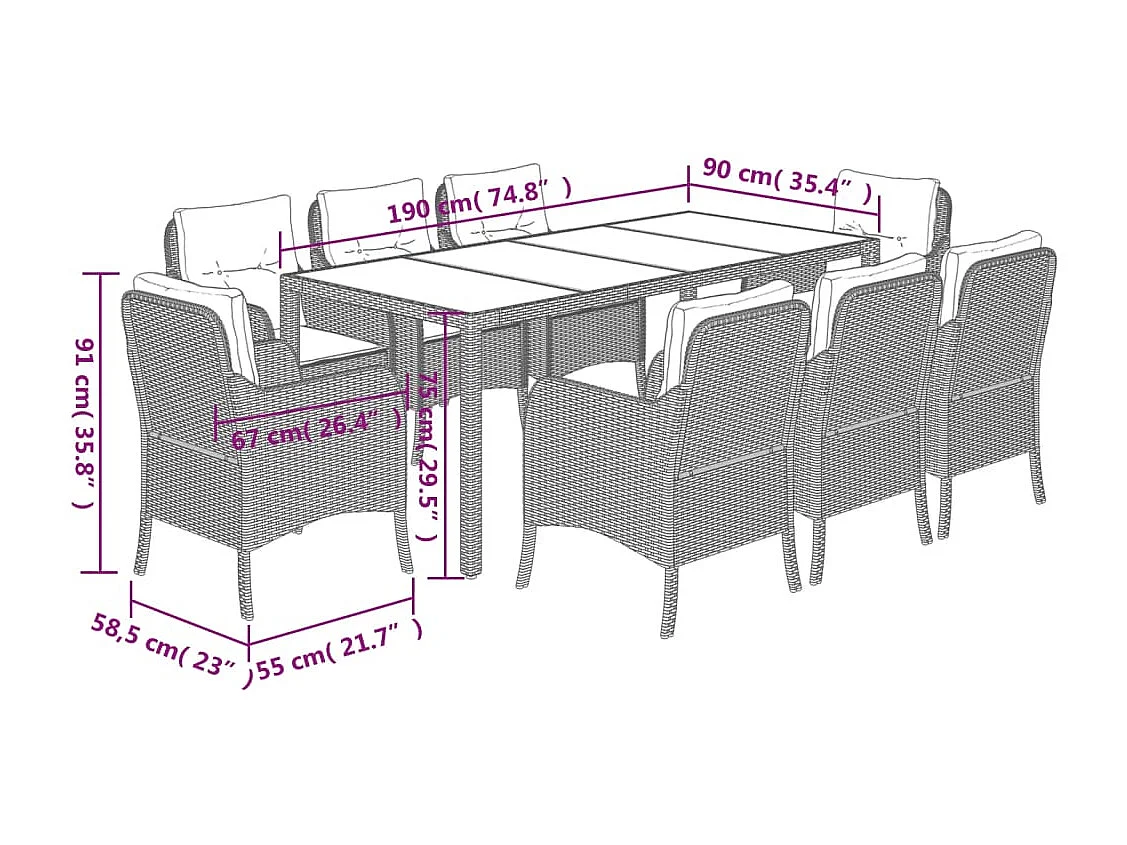 Marco Gianluca Ensemble à manger de jardin 9pcs coussins noir résine tressée