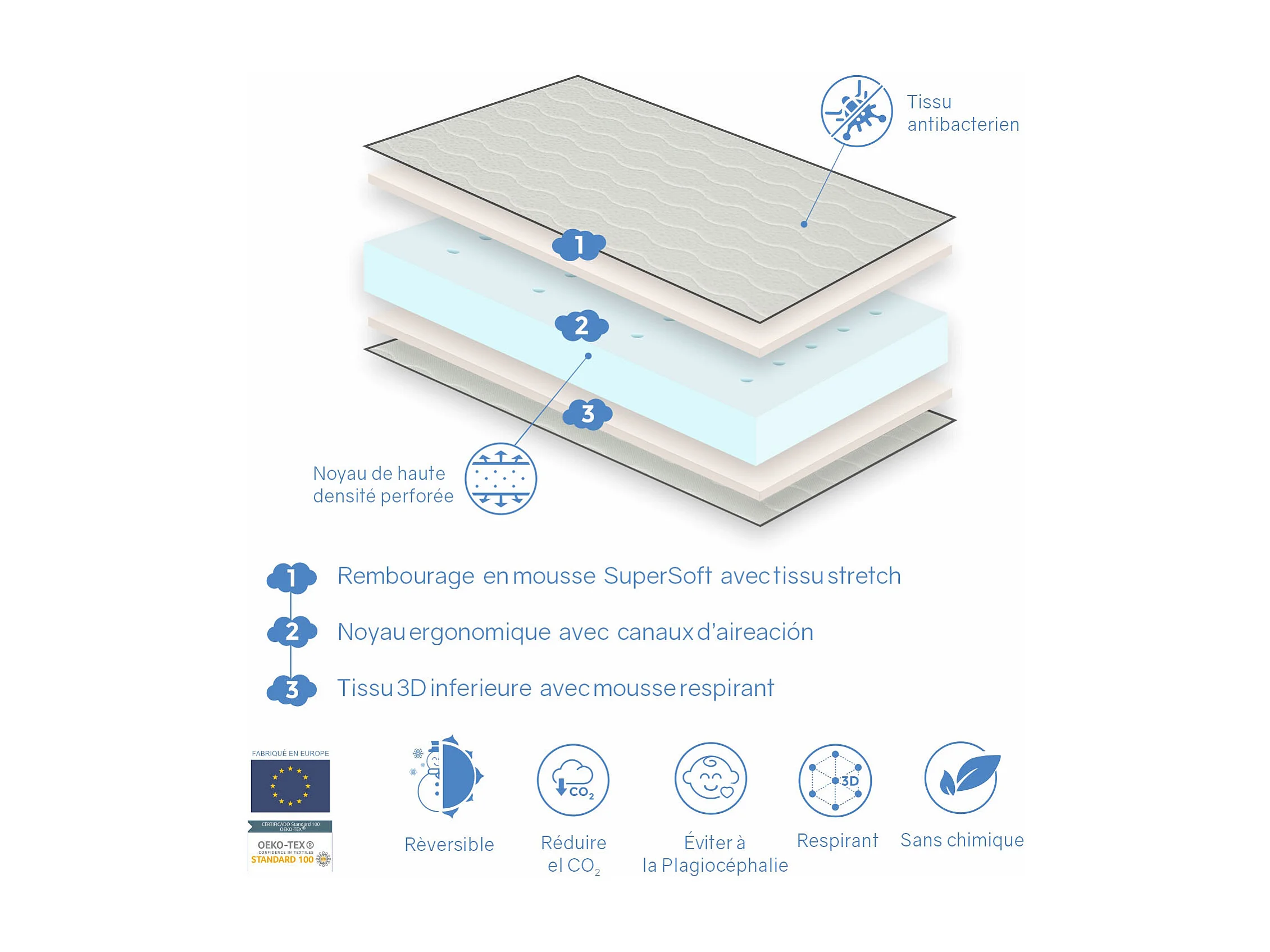 Matelas bebe 60x120 OCEAN BREATHAIR épaisseur 11 CM - Noyau 100 % Lavable, respirant, écologique et recyclable