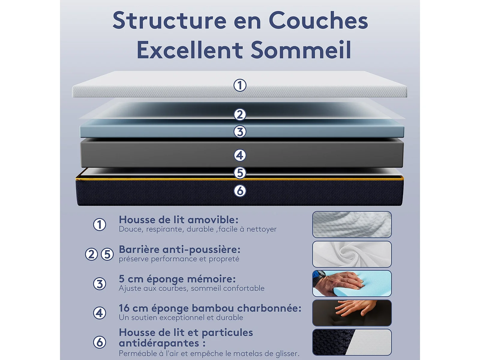 Matelas en mousse à mémoire de forme 90 x 190 cm , épaisseur 21 cm