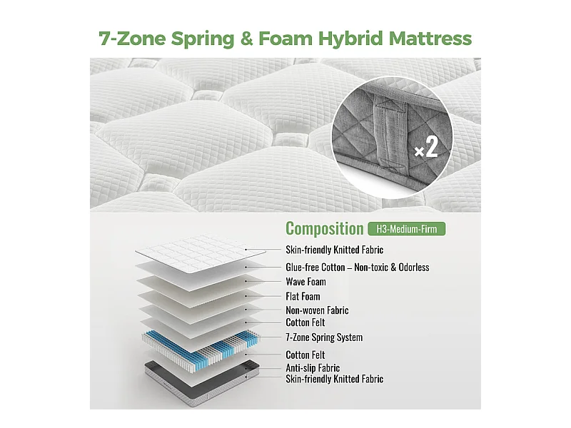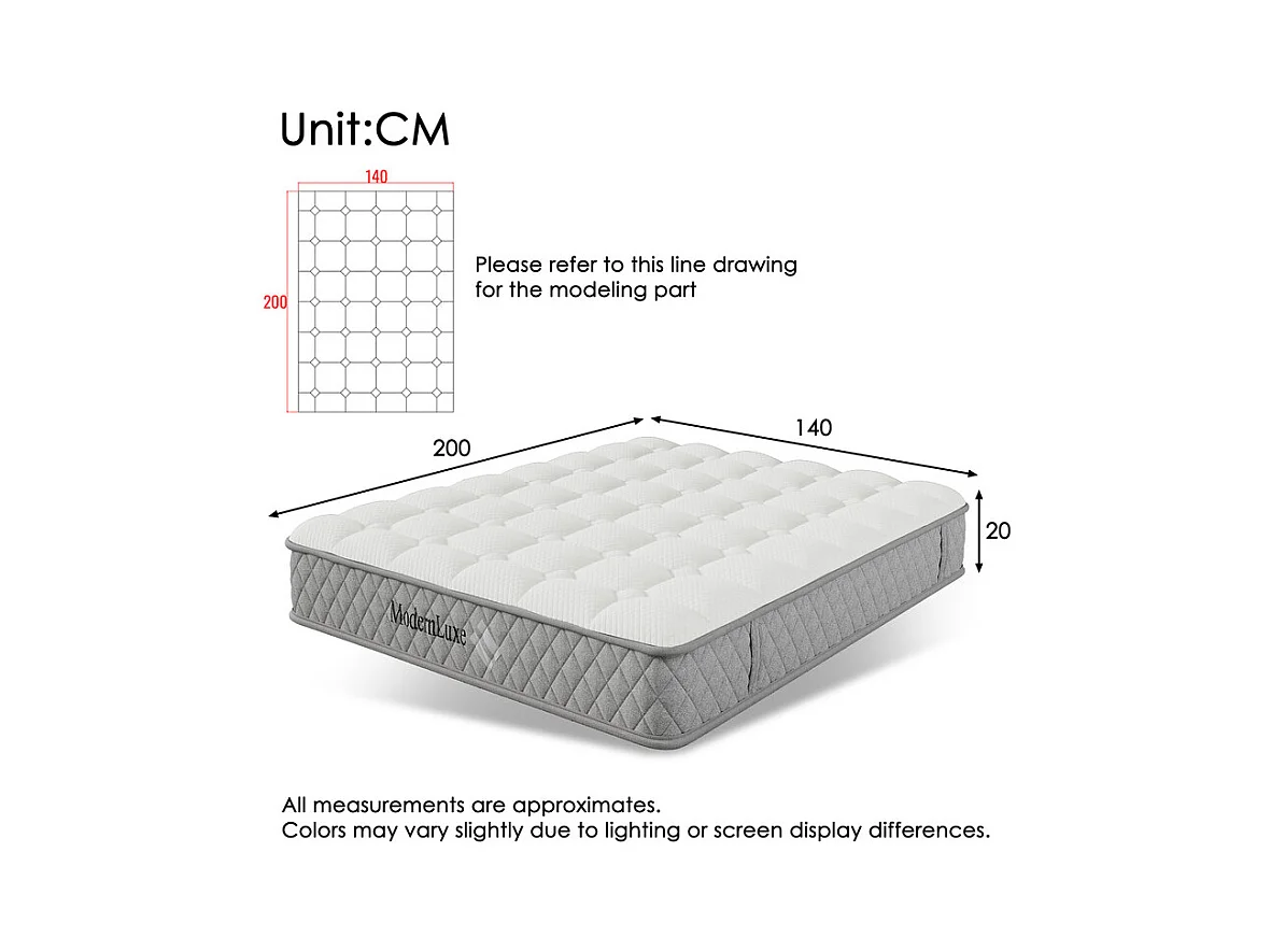 Matelas Orthopédique 140x200 cm anti-feu, avec 4 poignées, OEKO-TEX®, ép.20cm, Respirant, 7 Zones ressorts ensachés