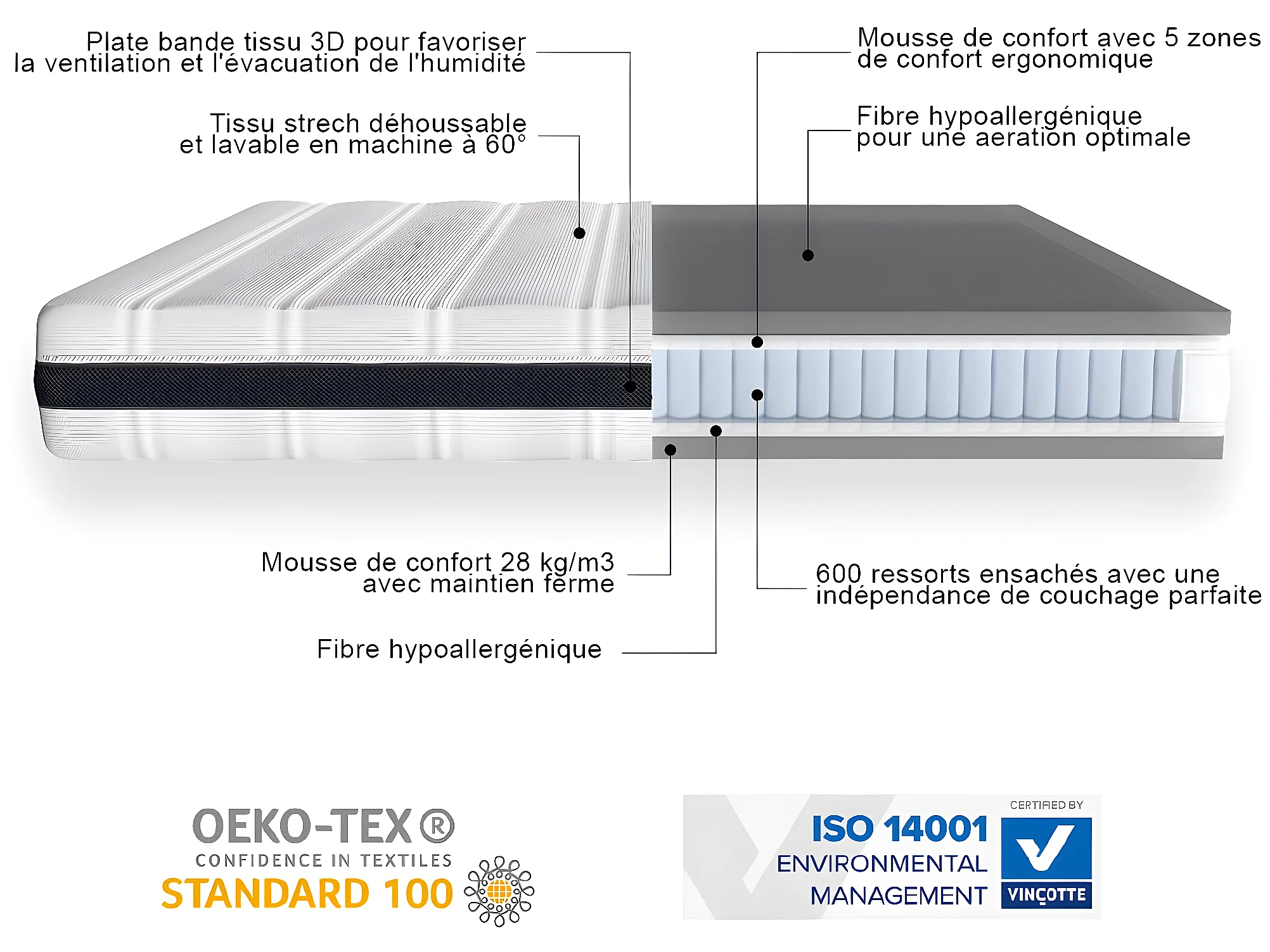 Matelas ressorts ensachés 160x200 Hygiospring - Mousse HR