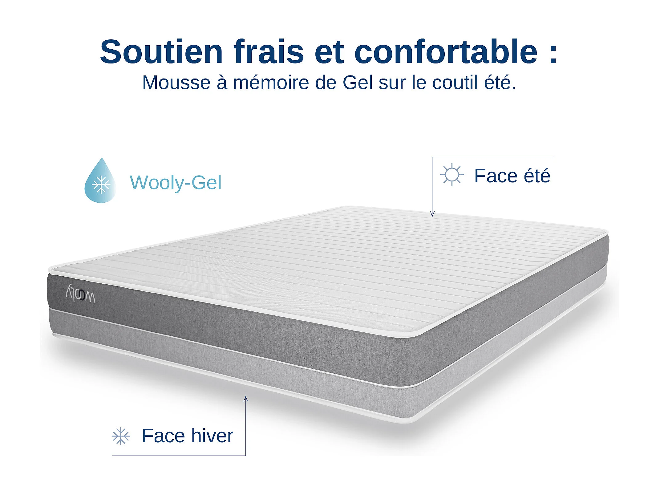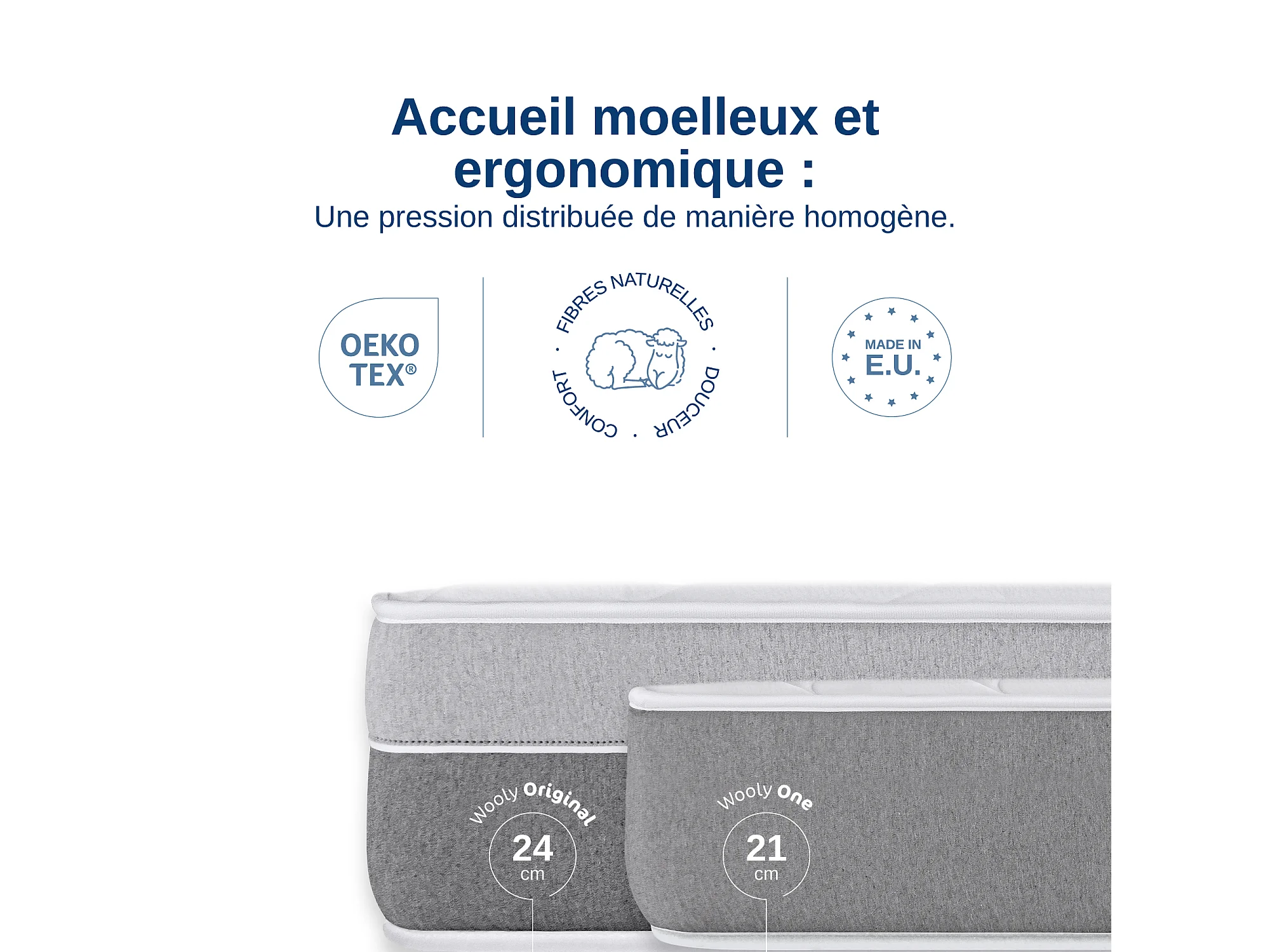 Matelas Wooly Original L 150x190 cm - 24 cm - 12 Couches Confort - Mousse mémoire Carbone - Laine - Latex-HR - 7 Zones - Ferme - Sommeil Réparateur