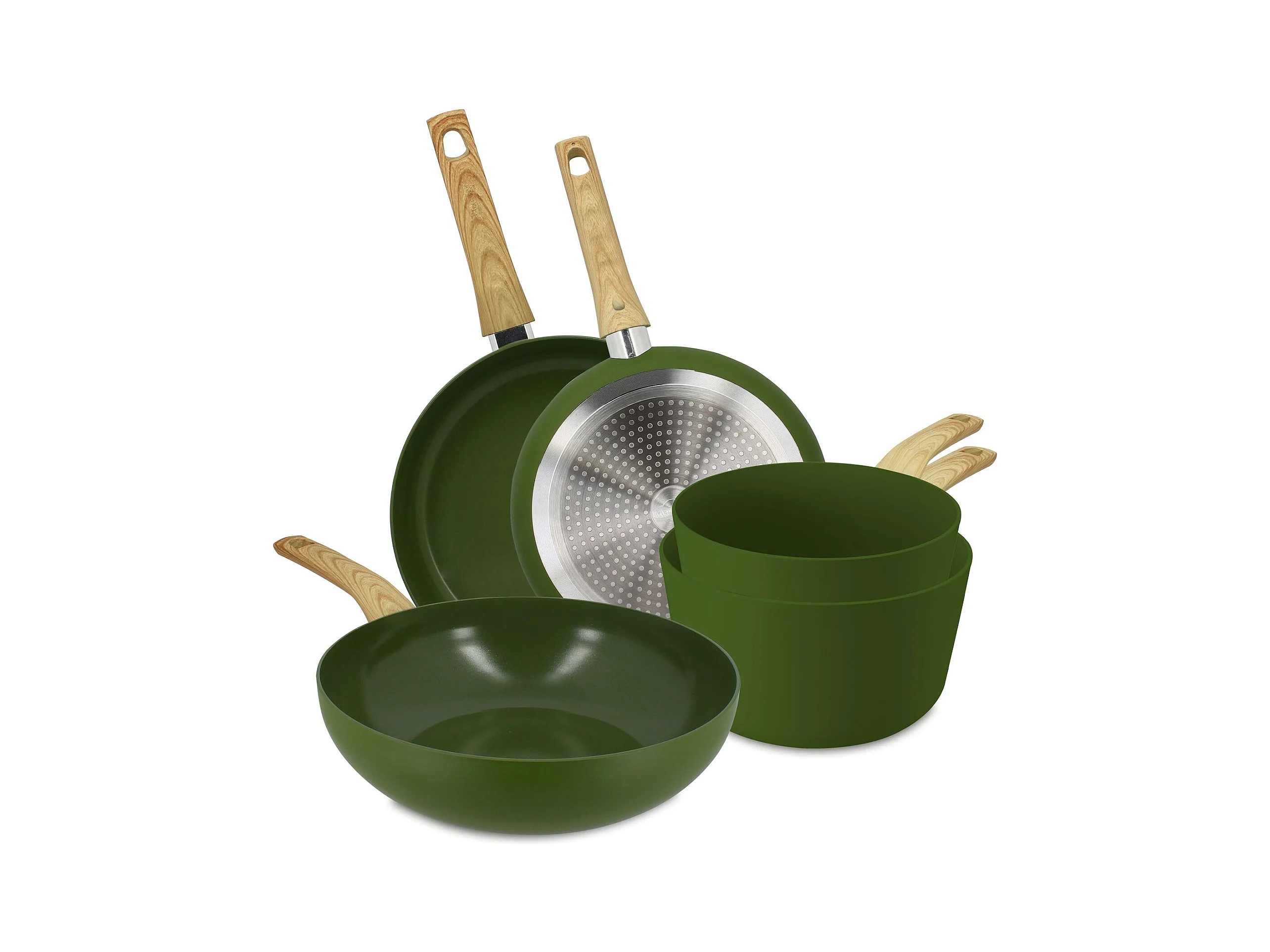 Menastyl - Set 5 Pieces Olive Casserole Poele Wok En Aluminium Induction Revetement Ceramique