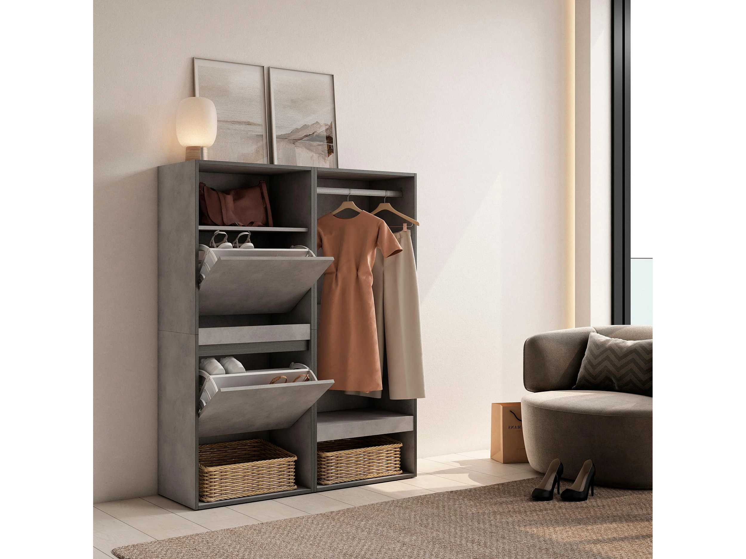 Meuble à Chaussures, 120x35x145 cm, Chambre à coucher, pièce, Vestiaire ouvert, Ciment