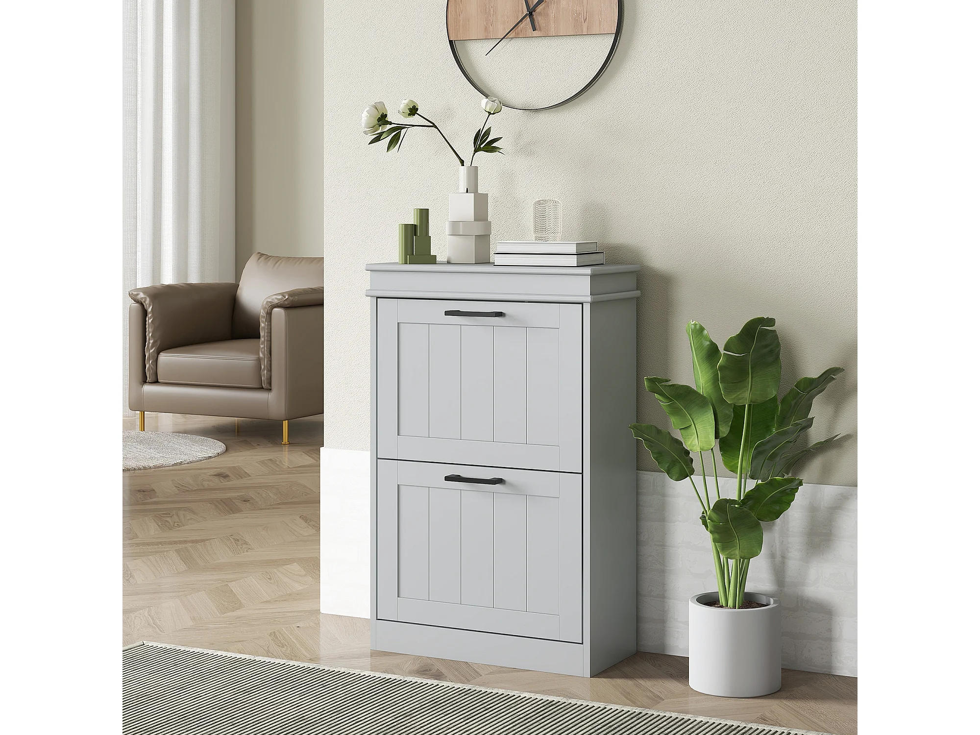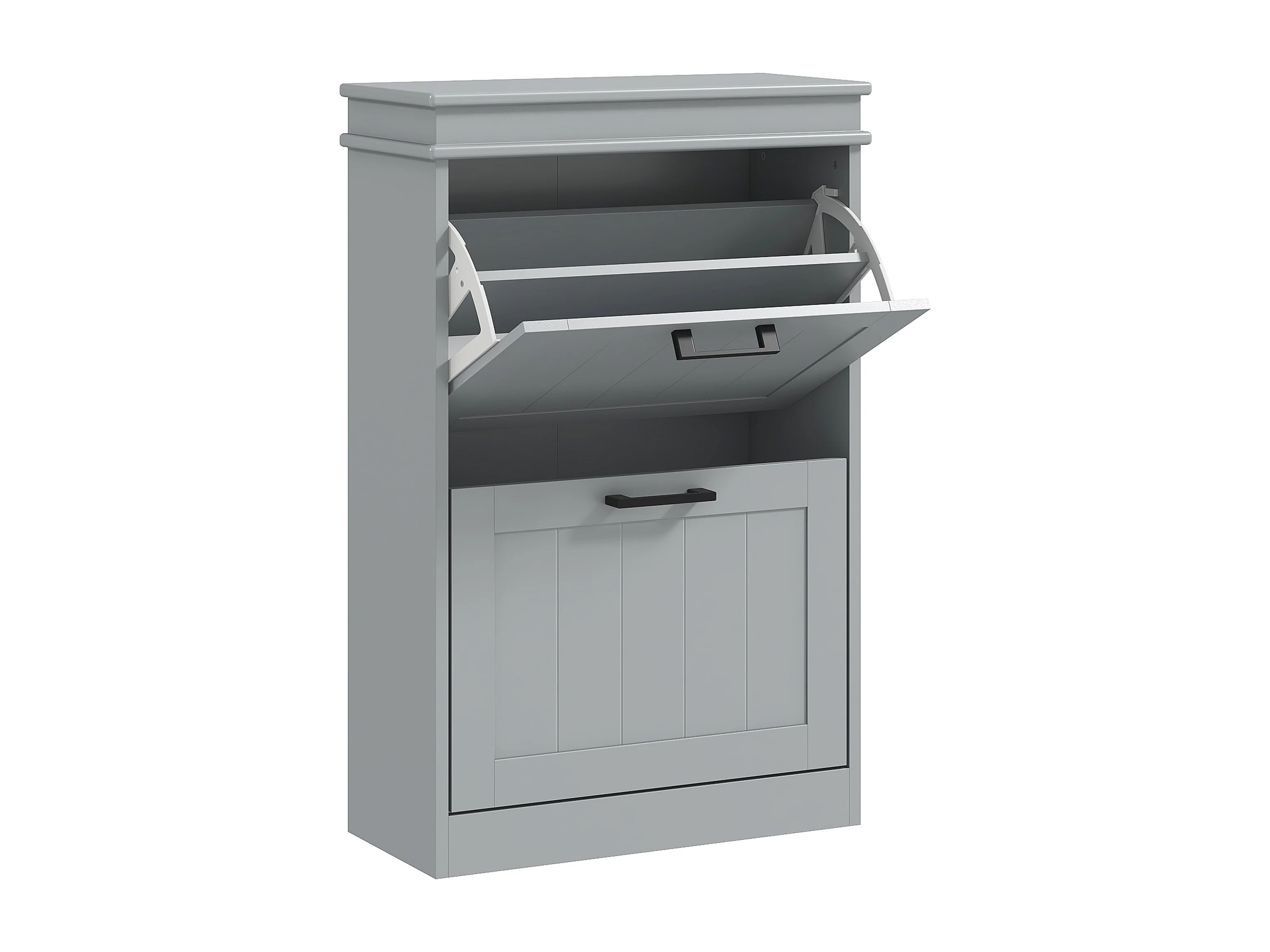 Meuble à chaussures 2 portes abattants 2 étagères poignées métal noir MDF gris