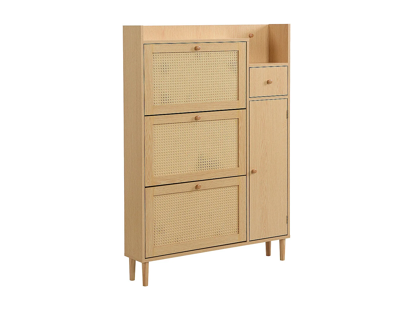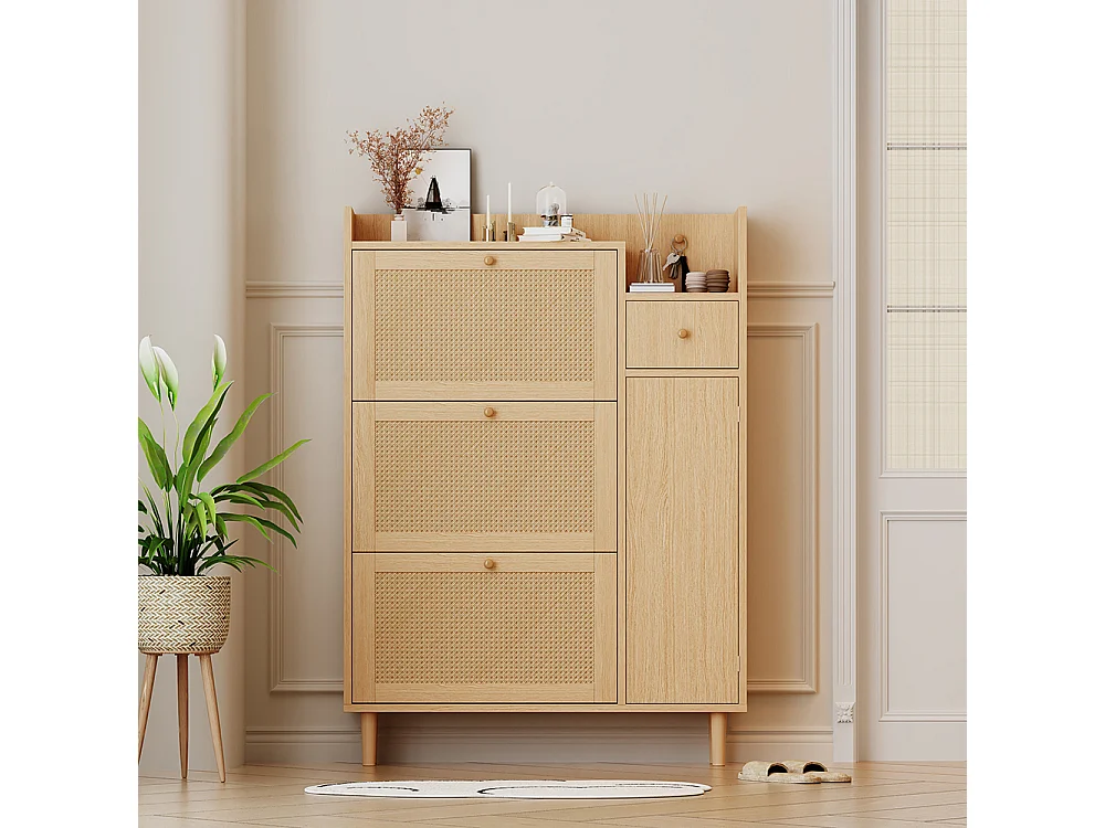 Meuble à chaussures en bois et rotin - 3 portes abattants et 1 tiroir - étagère réglable - Naturel
