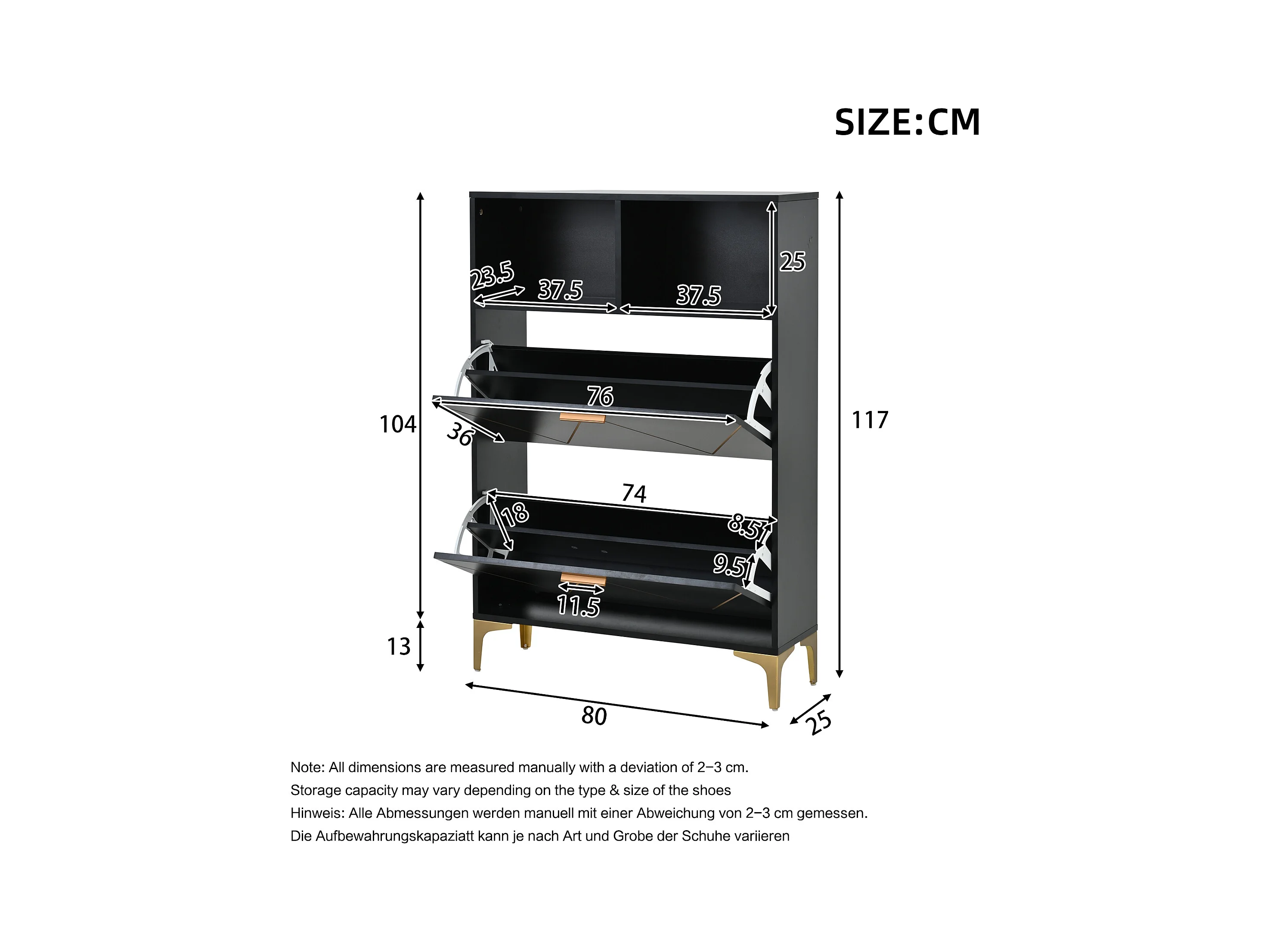 Meuble à chaussures 80x25x117cm - avec 4 portes abattantes - avec 4 étagères semi-ouvertes - MDF + Métal - Noir