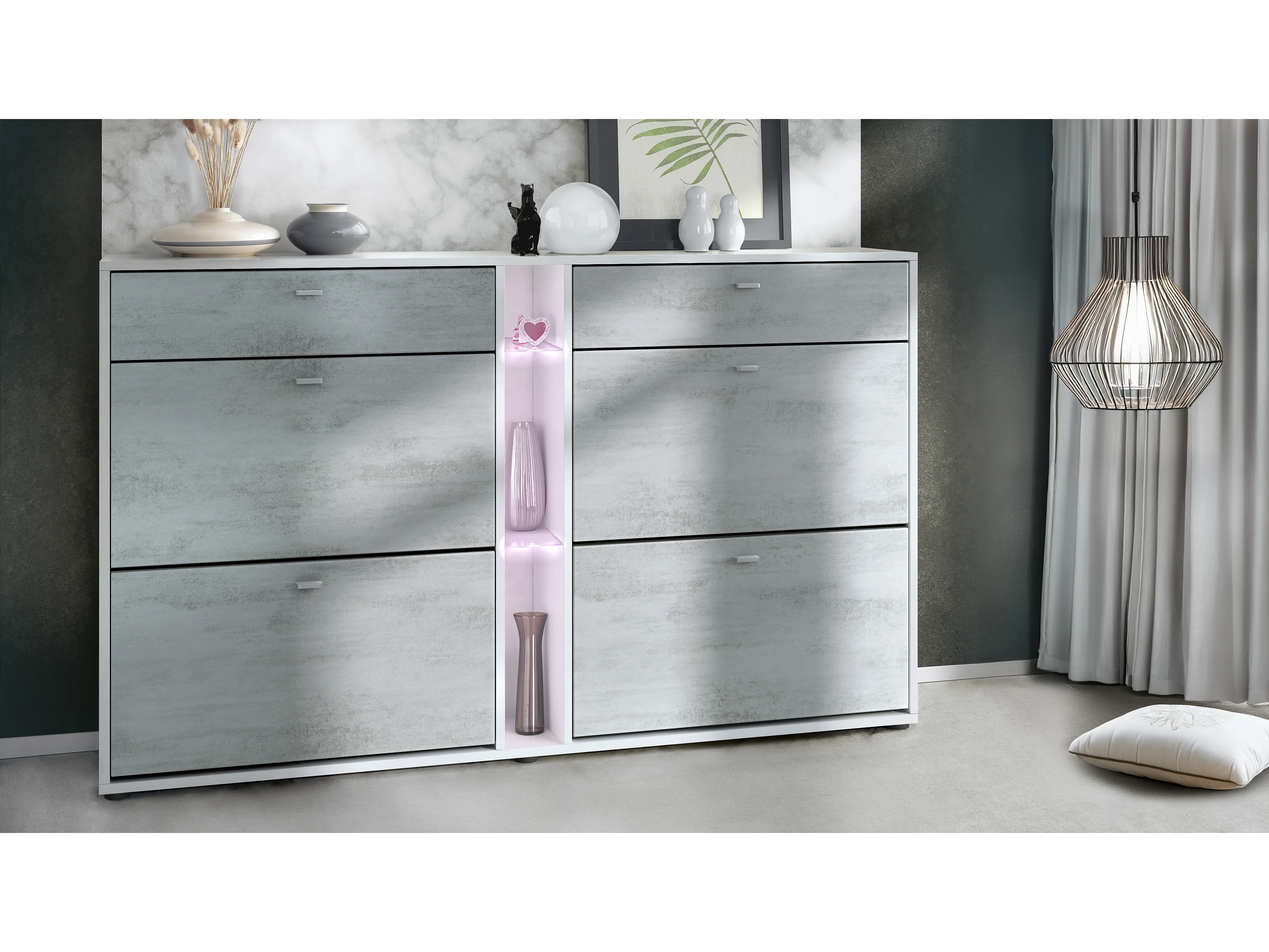 Meuble à chaussures à bascule Today 155,5 x 95 x 28 cm, avec un éclairage LED blanc, corps en Blanc mat, façades en aspect béton oxyde