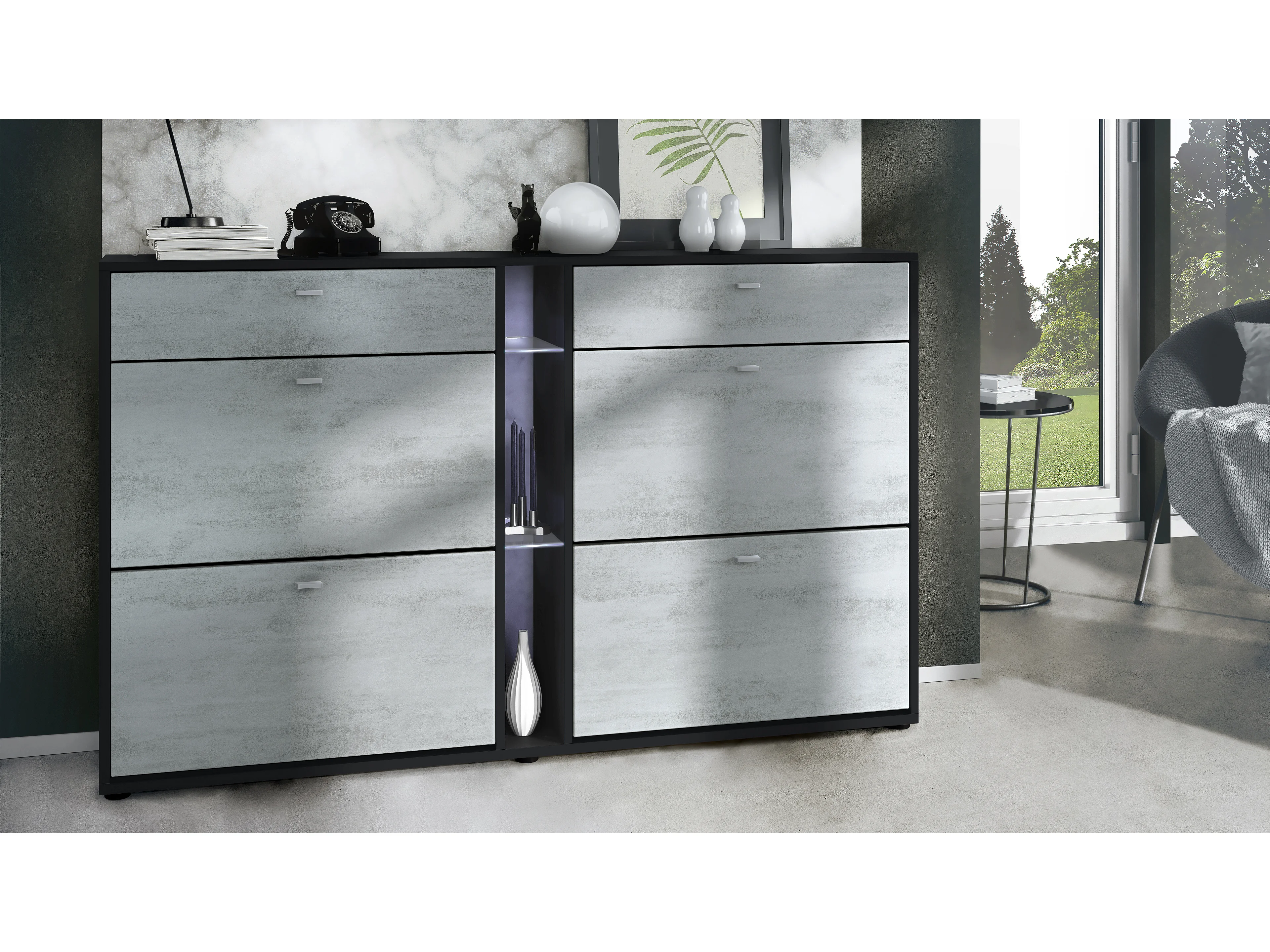 Meuble à chaussures à bascule Today 155,5 x 95 x 28 cm, avec un éclairage LED blanc, corps en Noir mat, façades en aspect béton oxyde