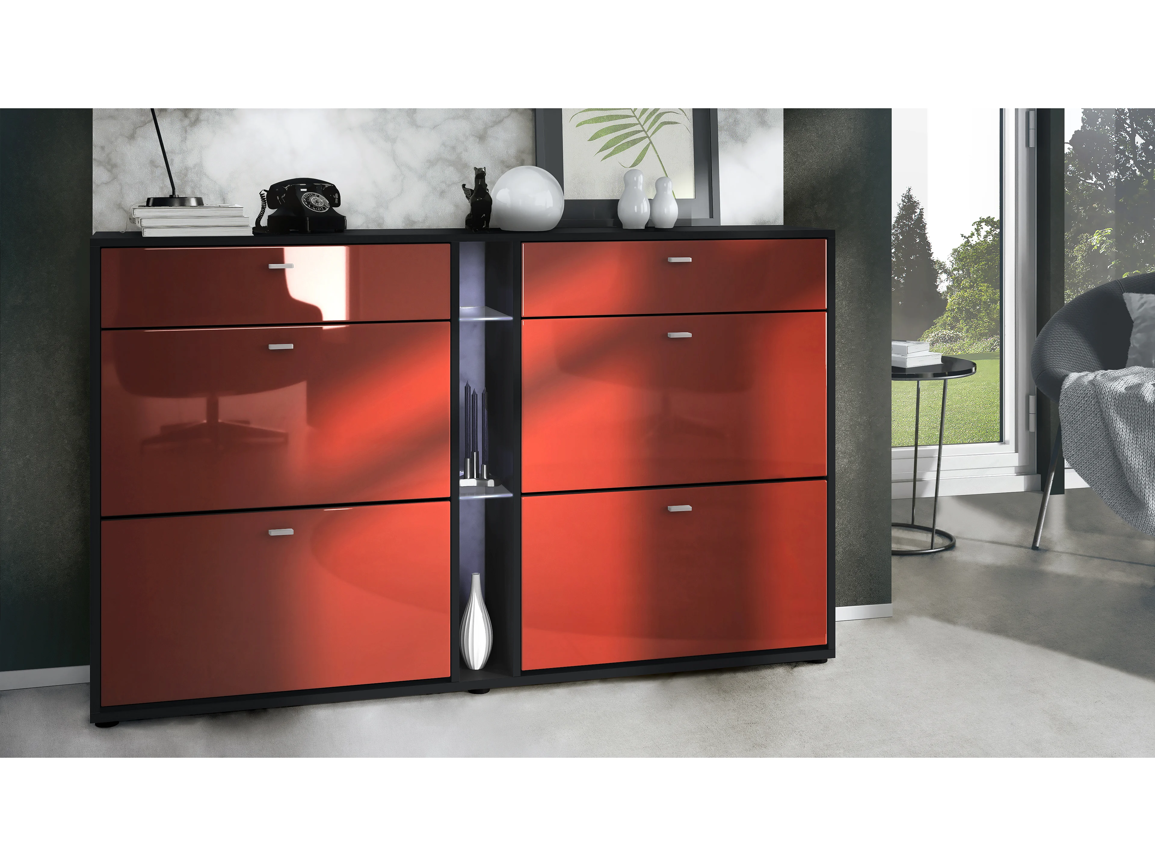 Meuble à chaussures à bascule Today 155,5 x 95 x 28 cm, avec un éclairage LED blanc, corps en Noir mat, façades en bordeaux haute brillance