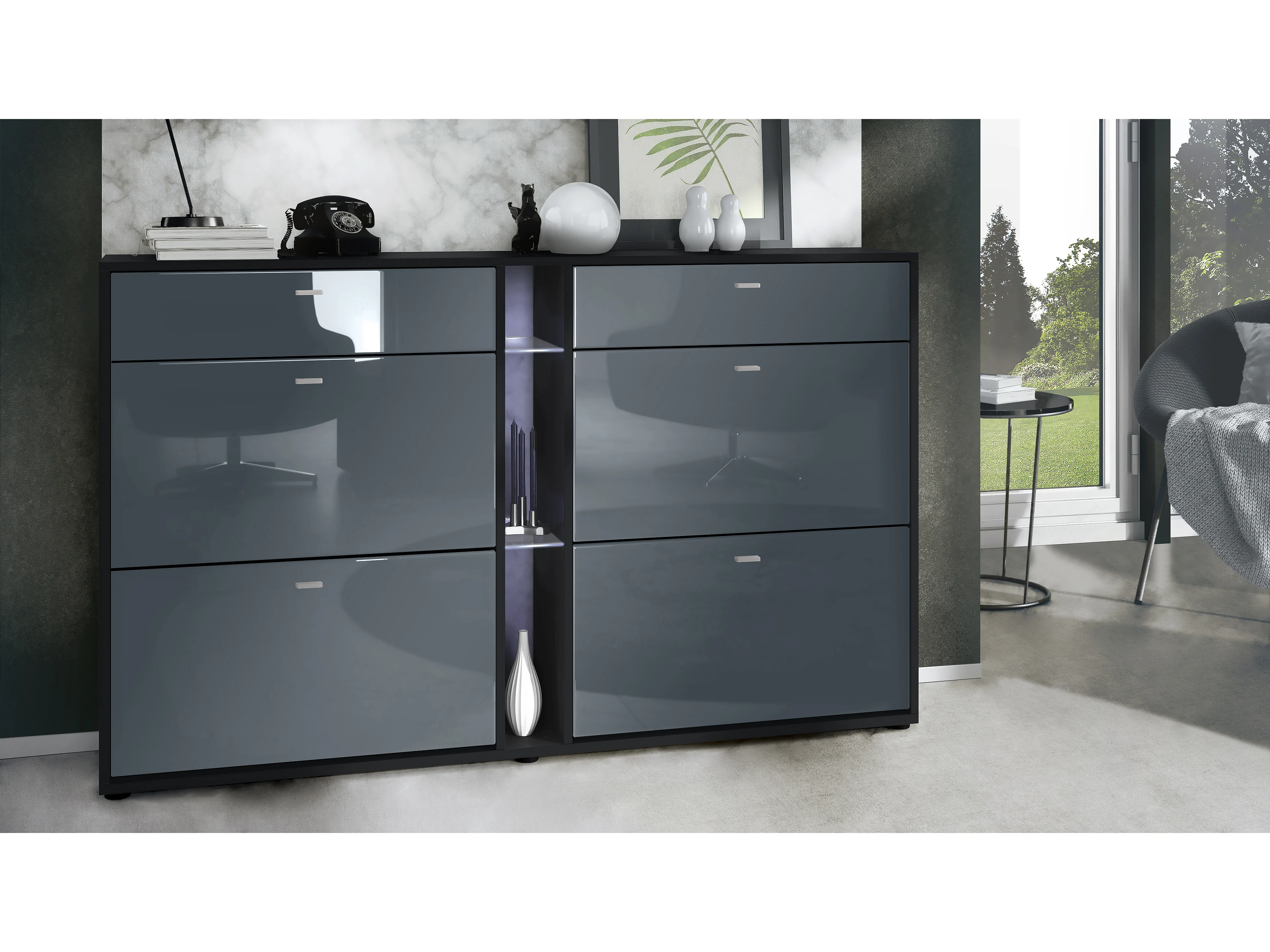 Meuble à chaussures à bascule Today 155,5 x 95 x 28 cm, avec un éclairage LED blanc, corps en Noir mat, façades en gris haute brillance
