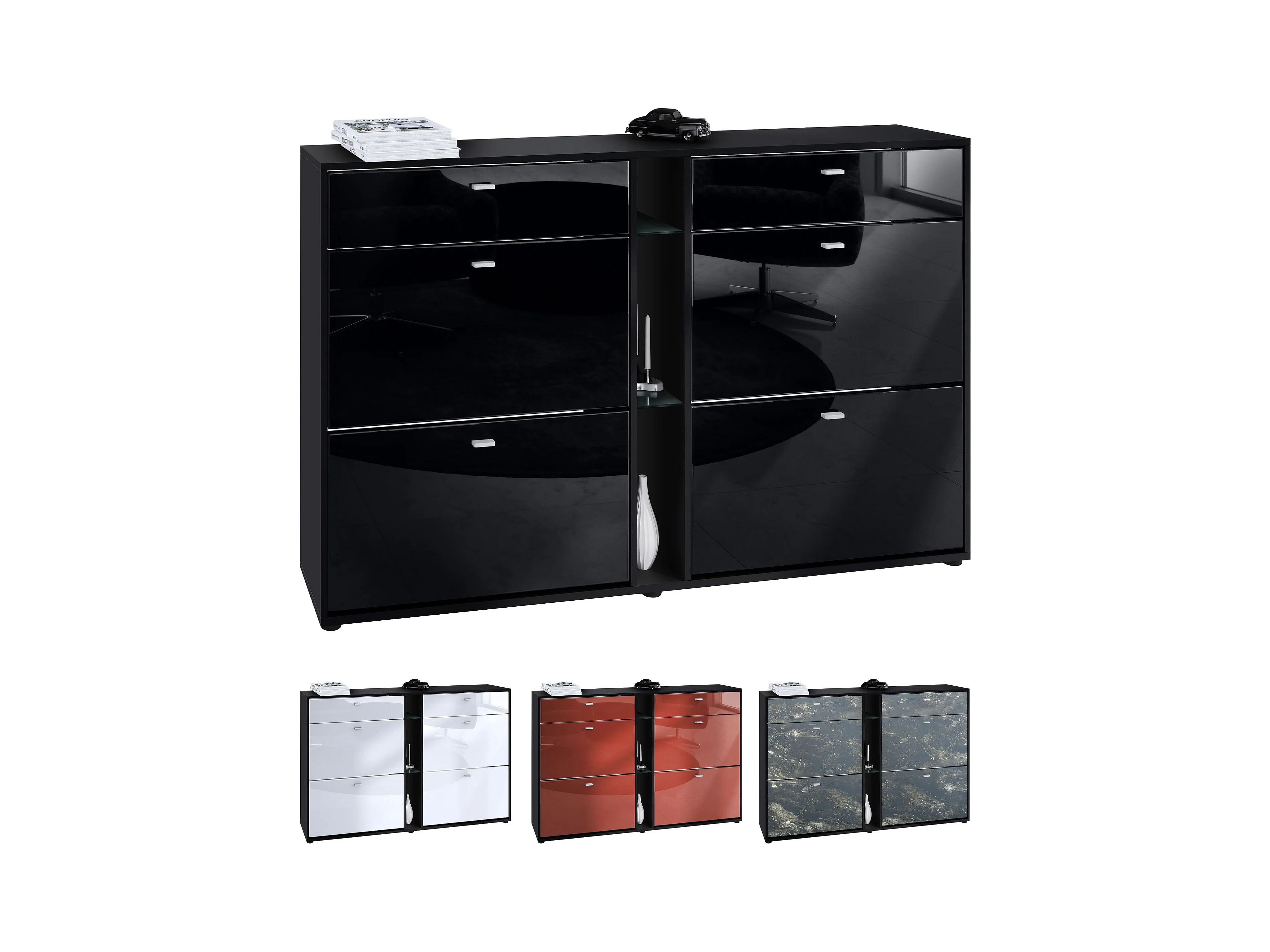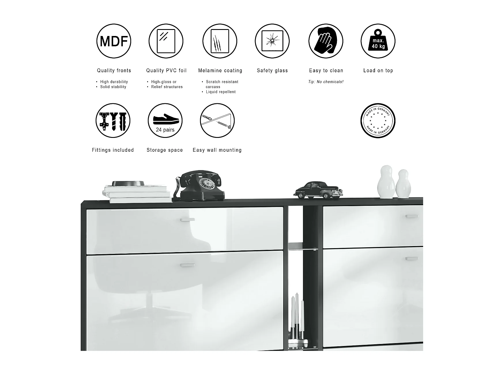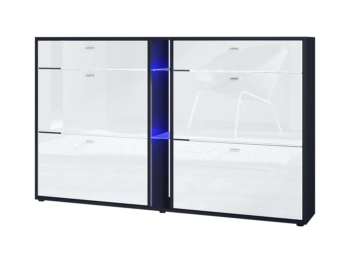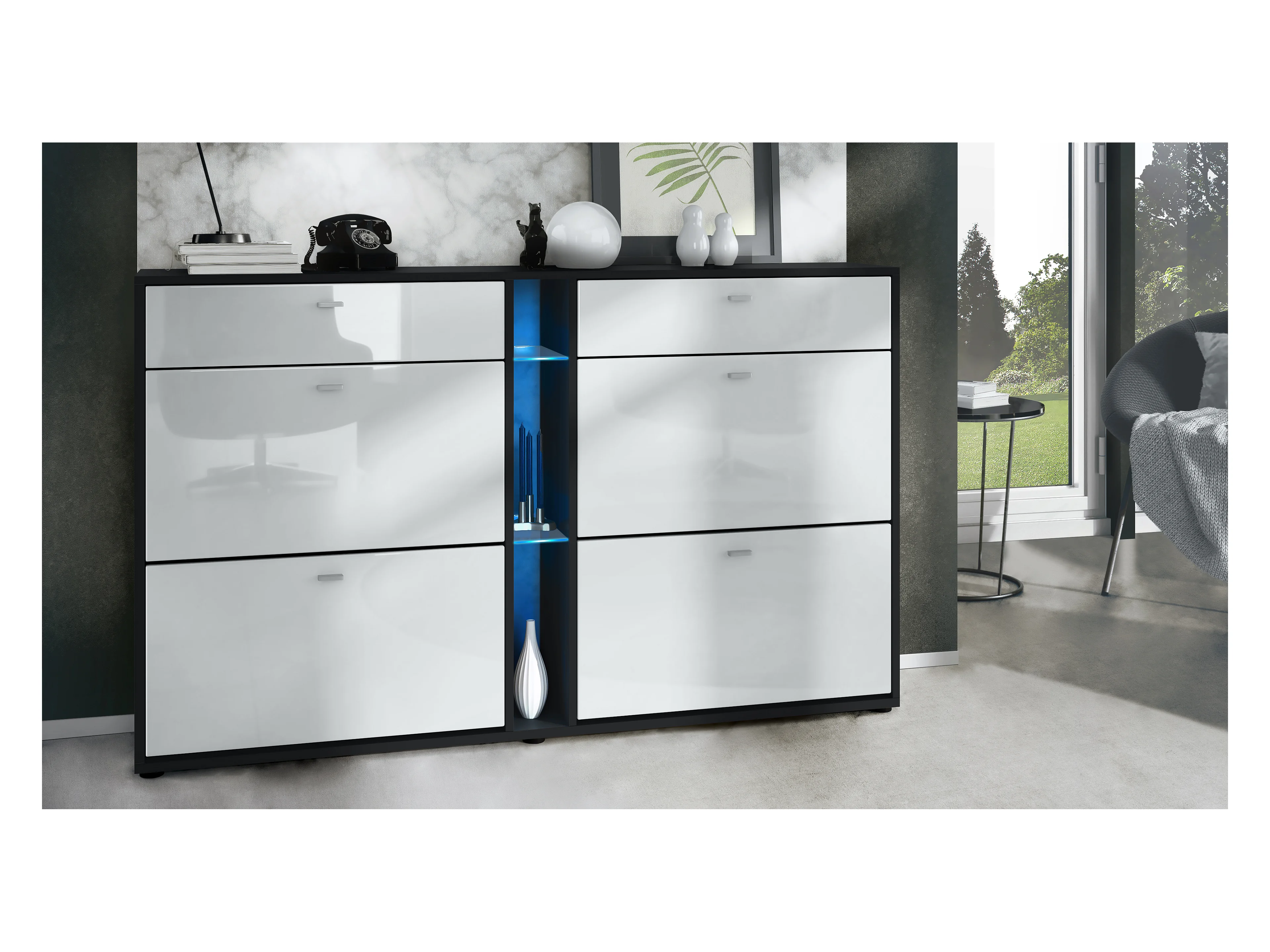 Meuble à chaussures à bascule Today 155,5 x 95 x 28 cm, avec un éclairage LED bleu, corps en Noir mat, façades en blanc haute brillance