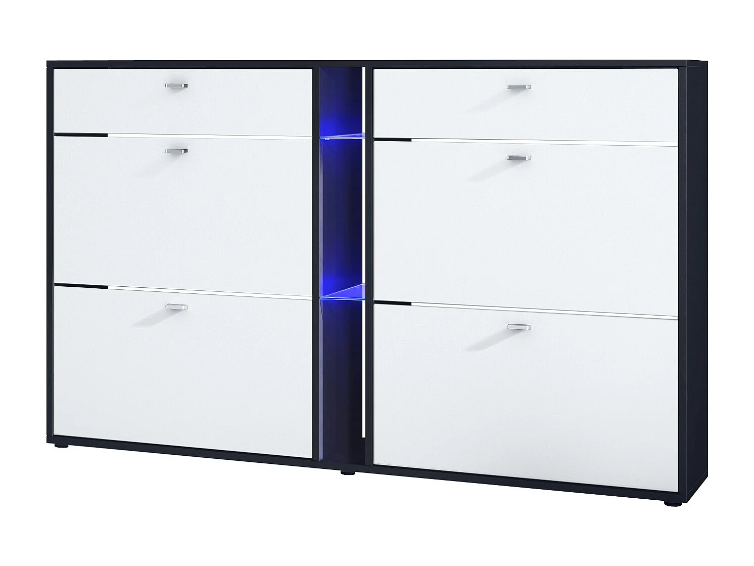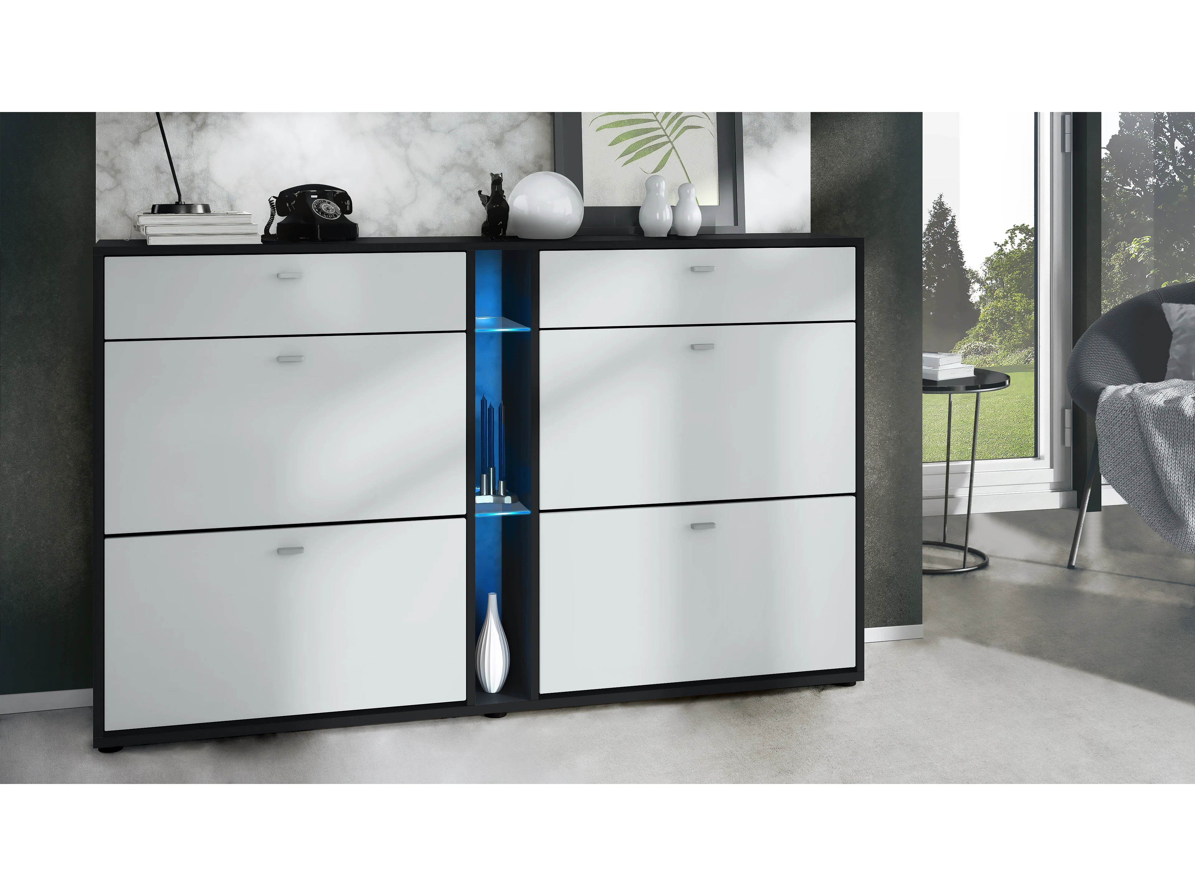 Meuble à chaussures à bascule Today 155,5 x 95 x 28 cm, avec un éclairage LED bleu, corps en Noir mat, façades en blanc mat