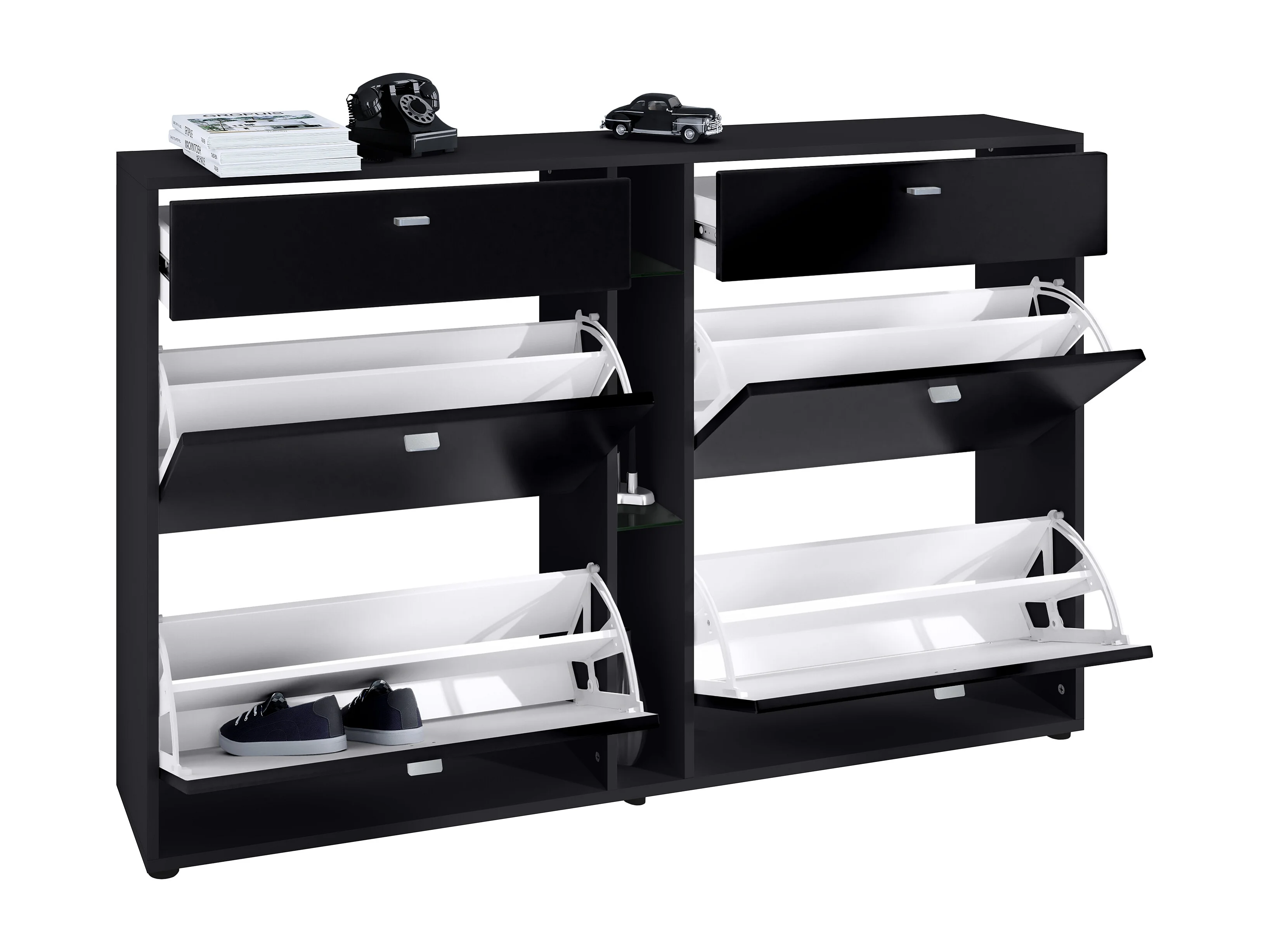 Meuble à chaussures à bascule Today 155,5 x 95 x 28 cm, avec un éclairage LED bleu, corps en Noir mat, façades en noir haute brillance