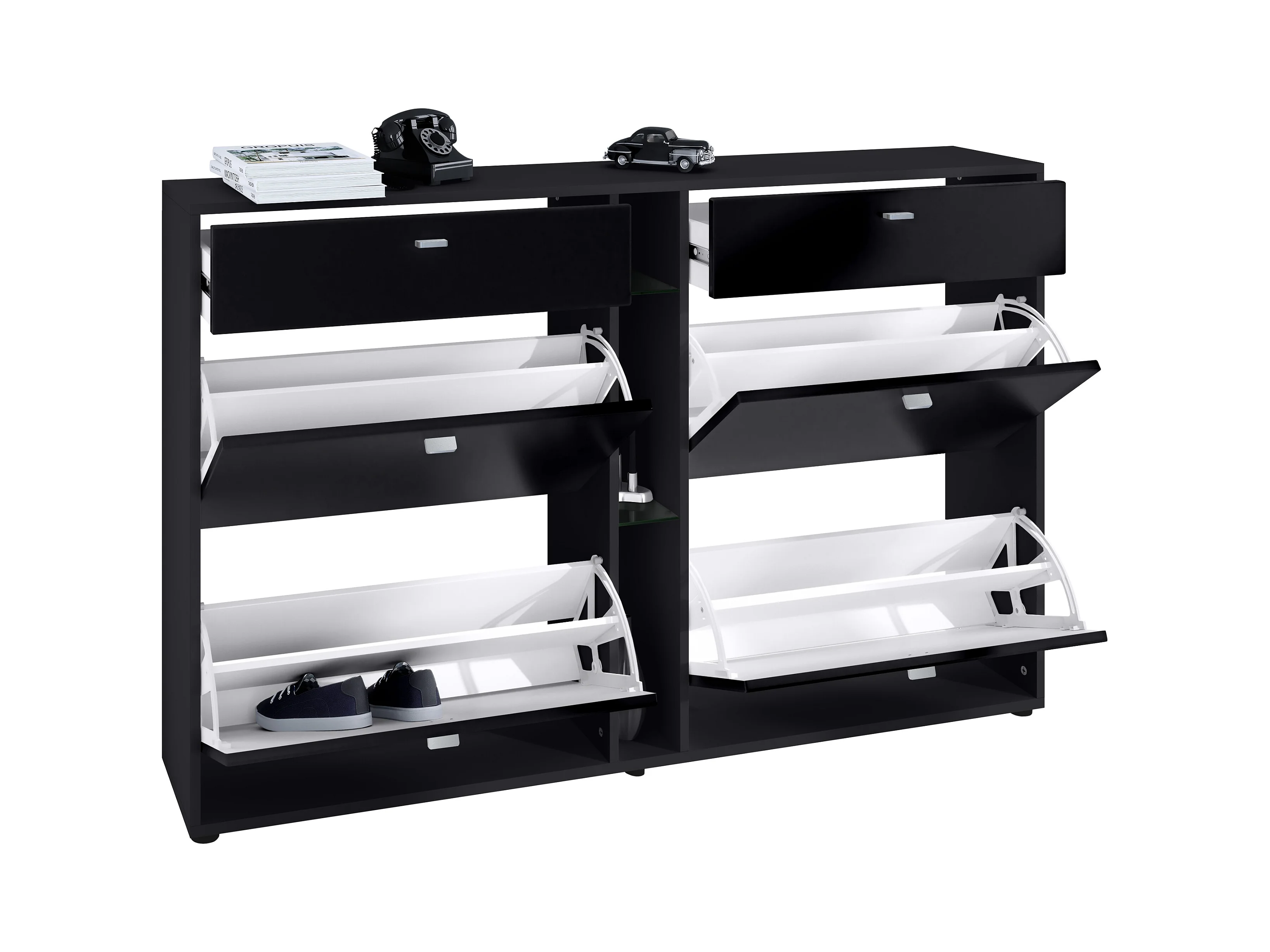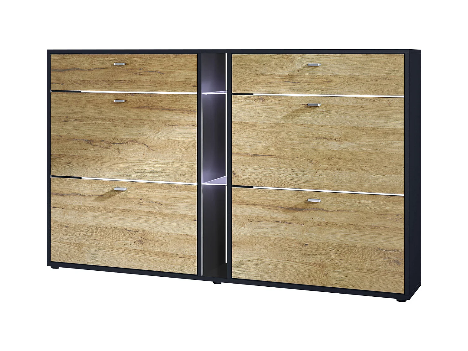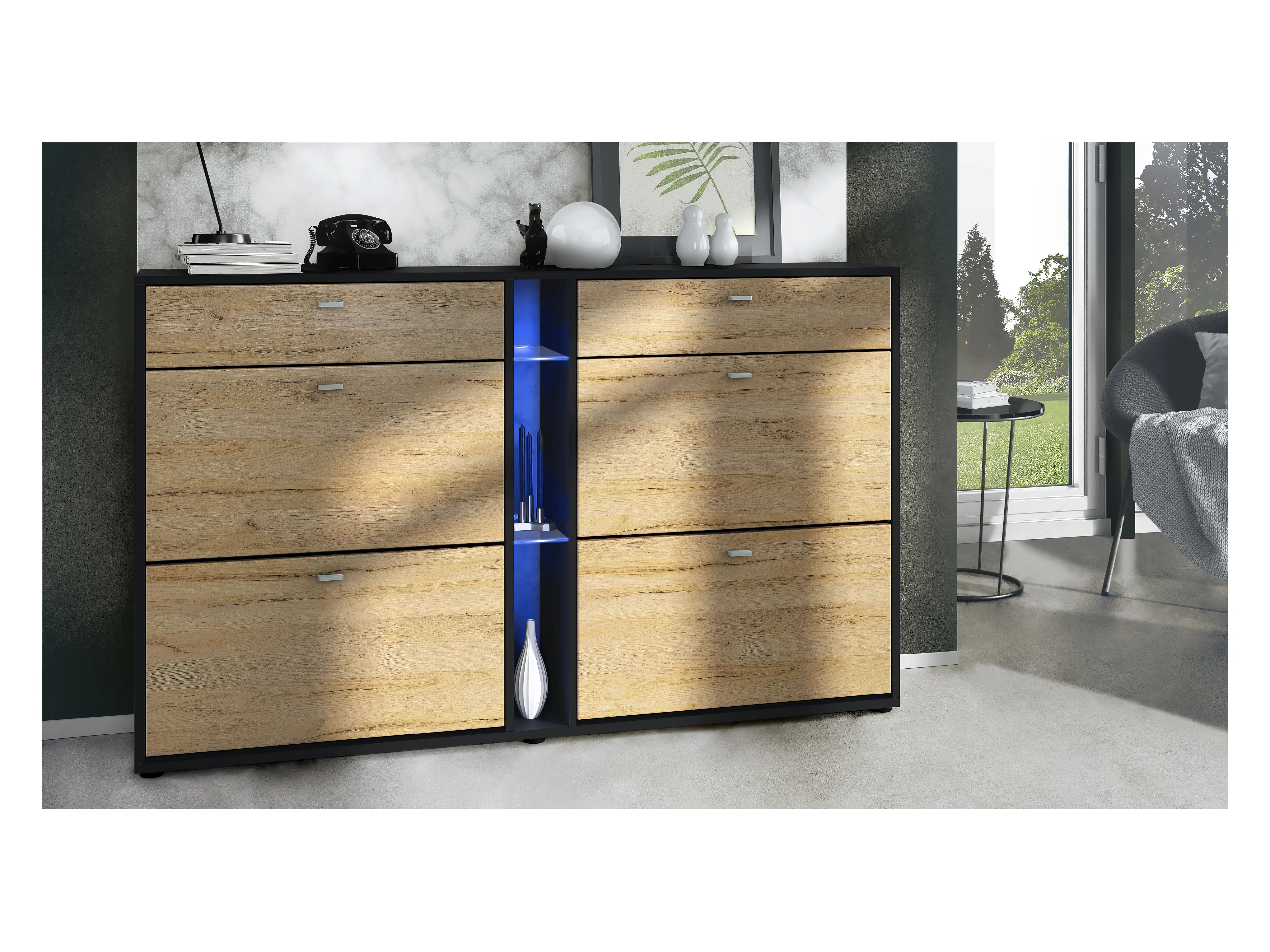 Meuble à chaussures à bascule Today 155,5 x 95 x 28 cm, avec un éclairage LED RGB, corps en Noir mat, façades en chêne nature