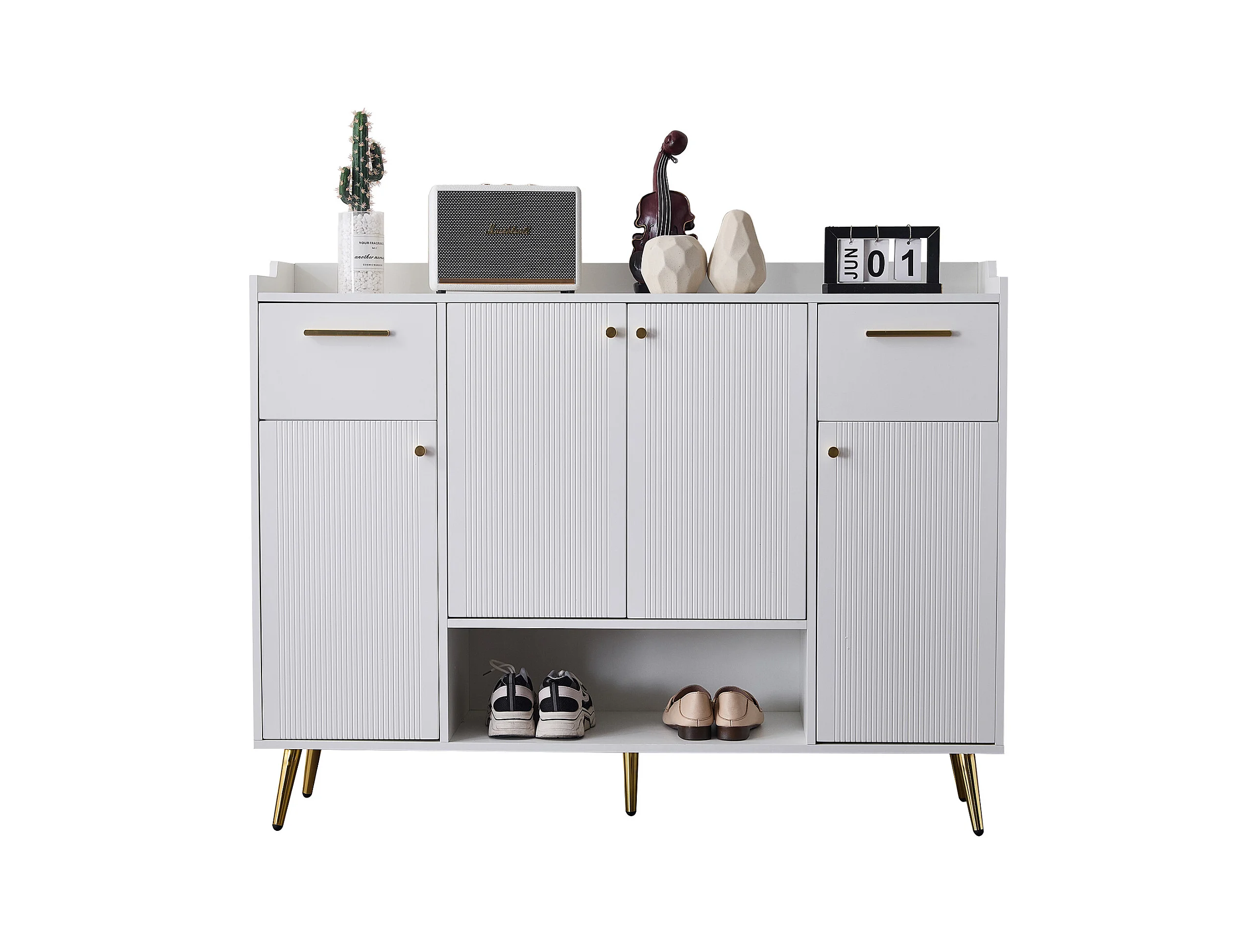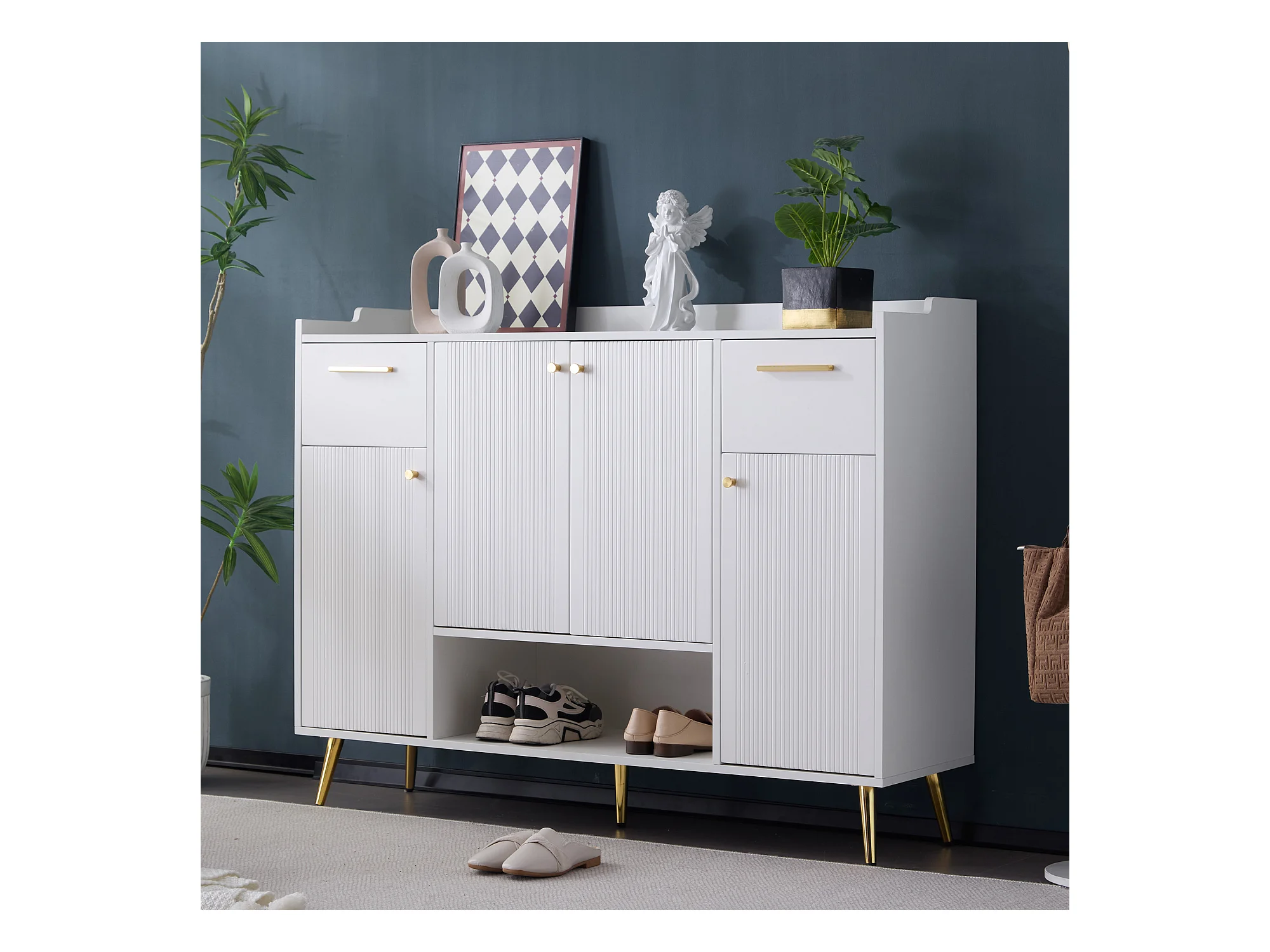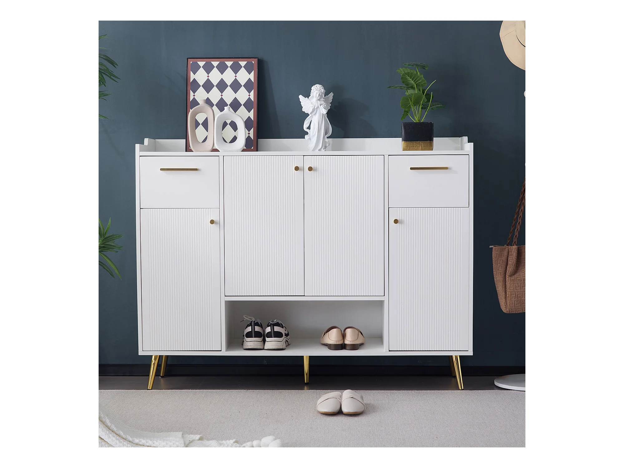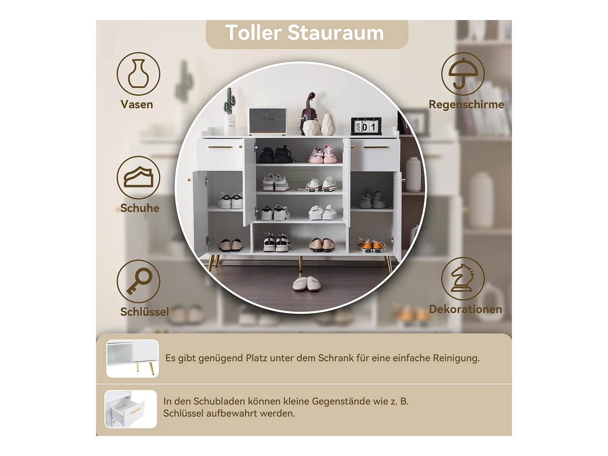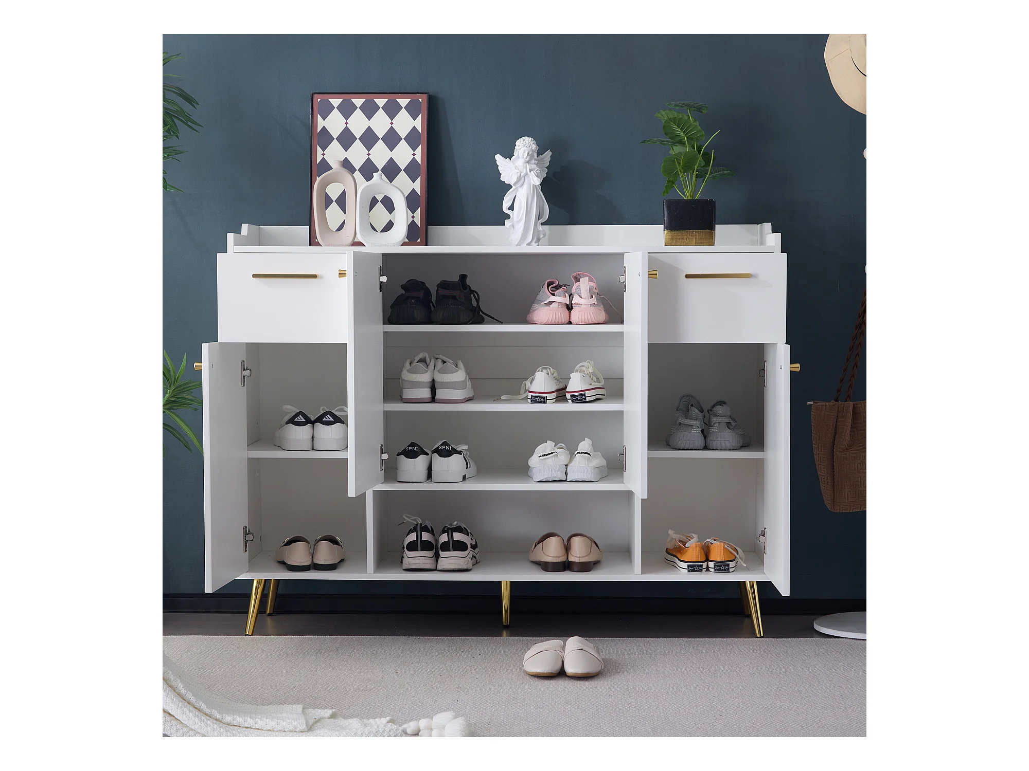 Meuble à chaussures avec 2 tiroirs et 4 portes, avec pieds en métal, blanc (130x37x100 cm)