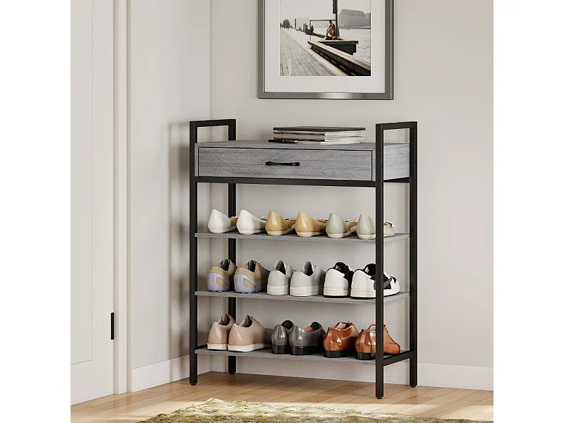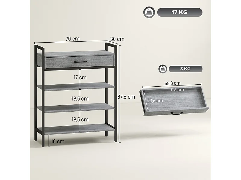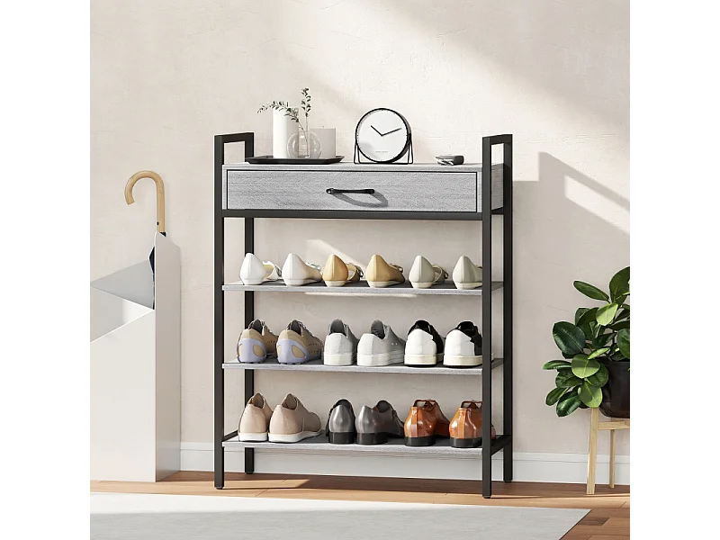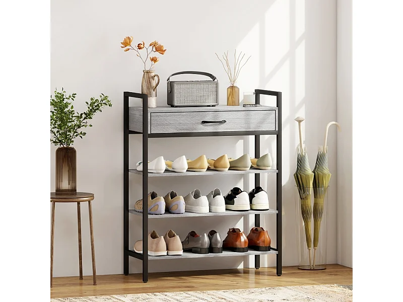 Meuble à chaussures avec 4 étagères, métal et bois, 6 paires de chaussures, gris, (70x30x87.6 cm)