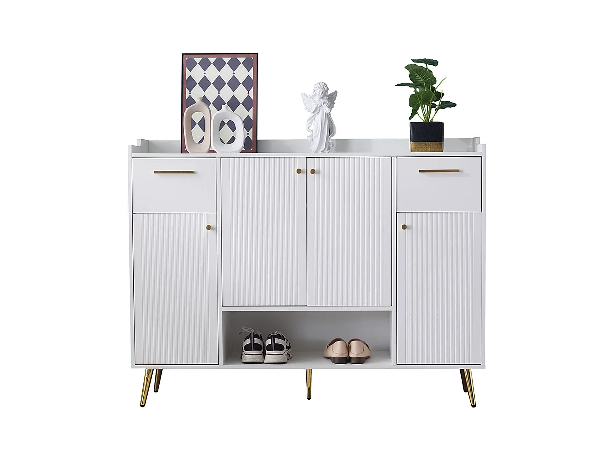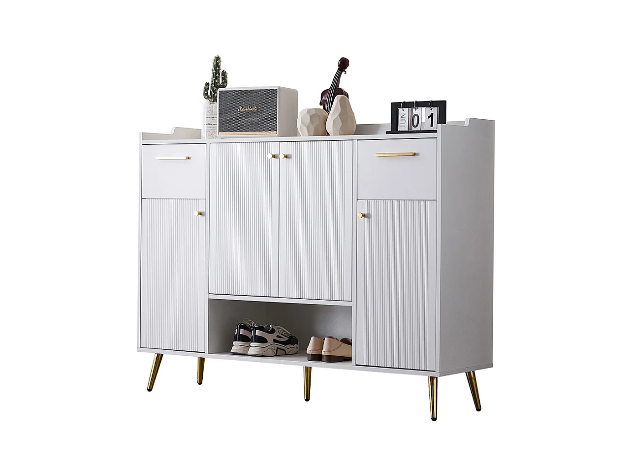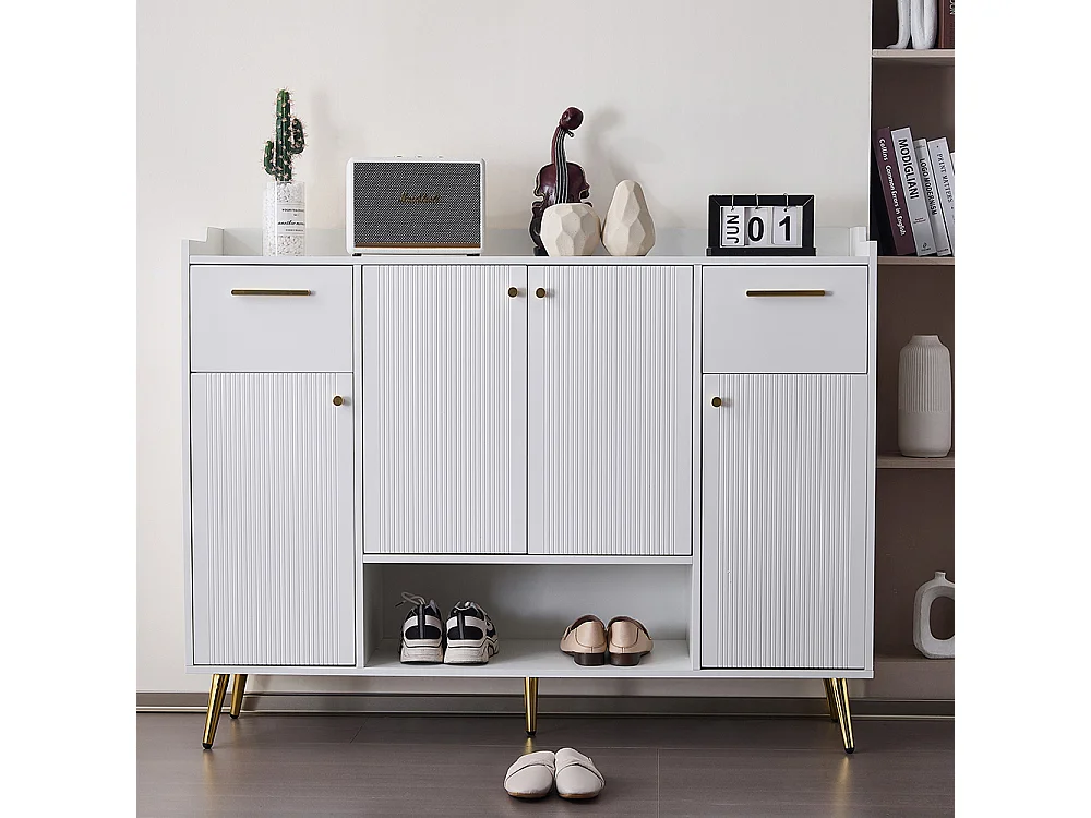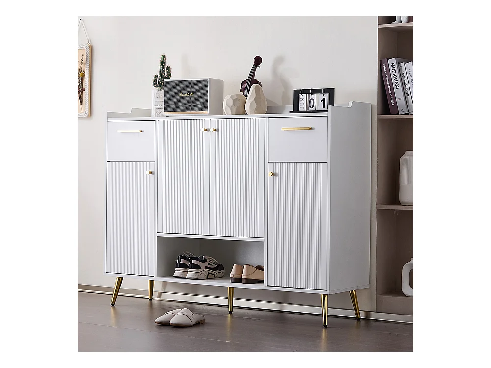Meuble à chaussures blanc armoire étagère 2 tiroirs 4 portes pieds métal