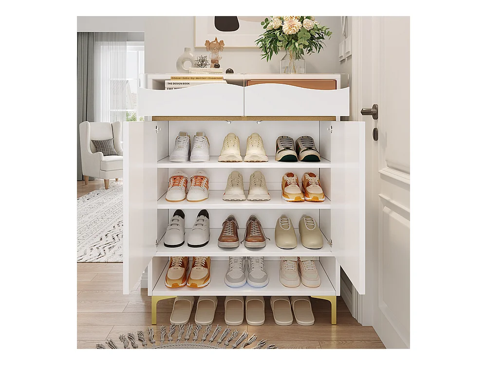 Meuble à chaussures blanc armoire étagère 2 tiroirs 4 portes pieds métal