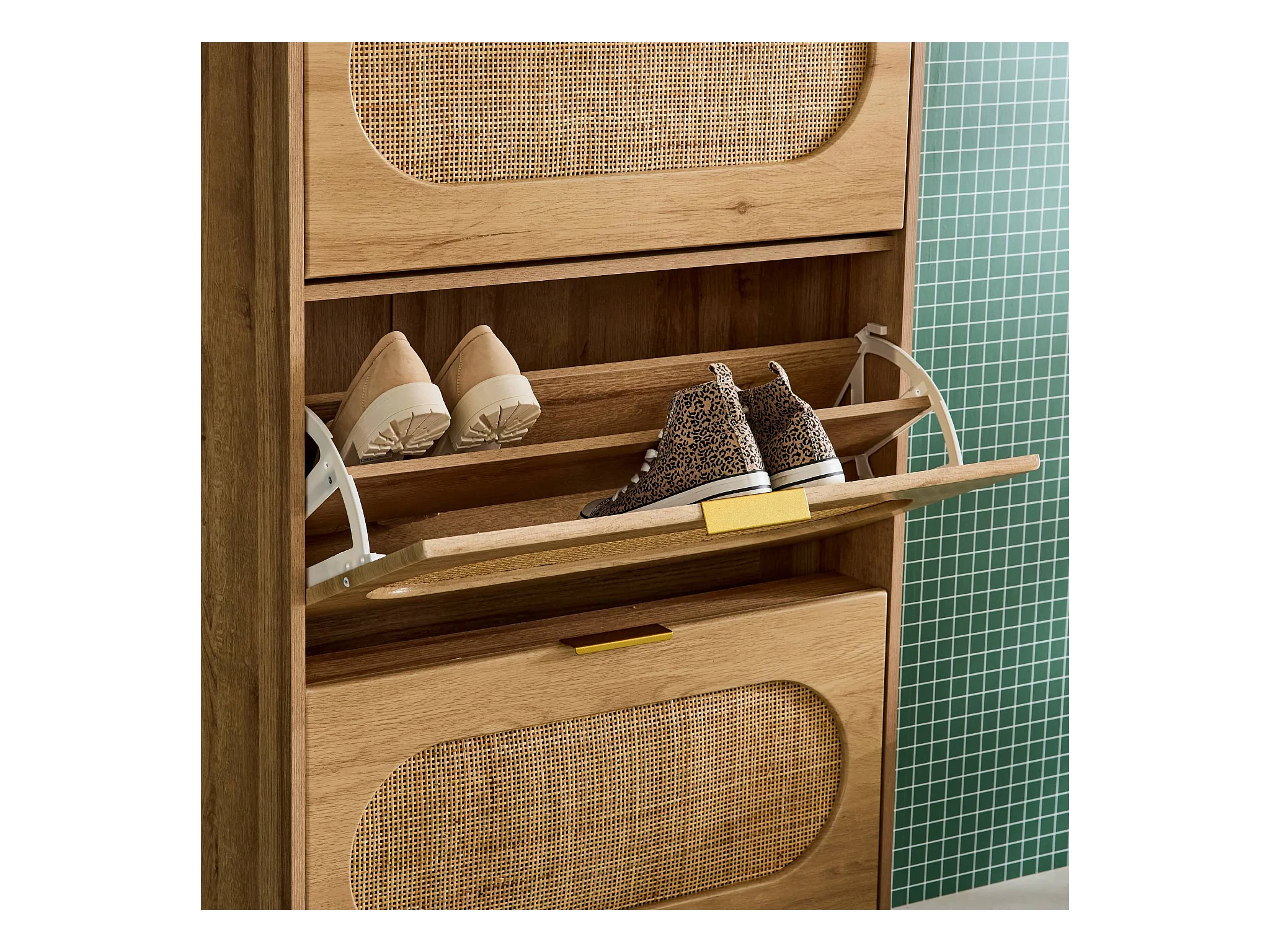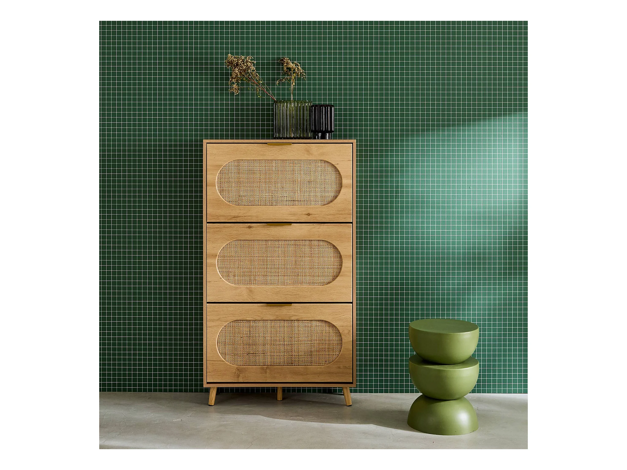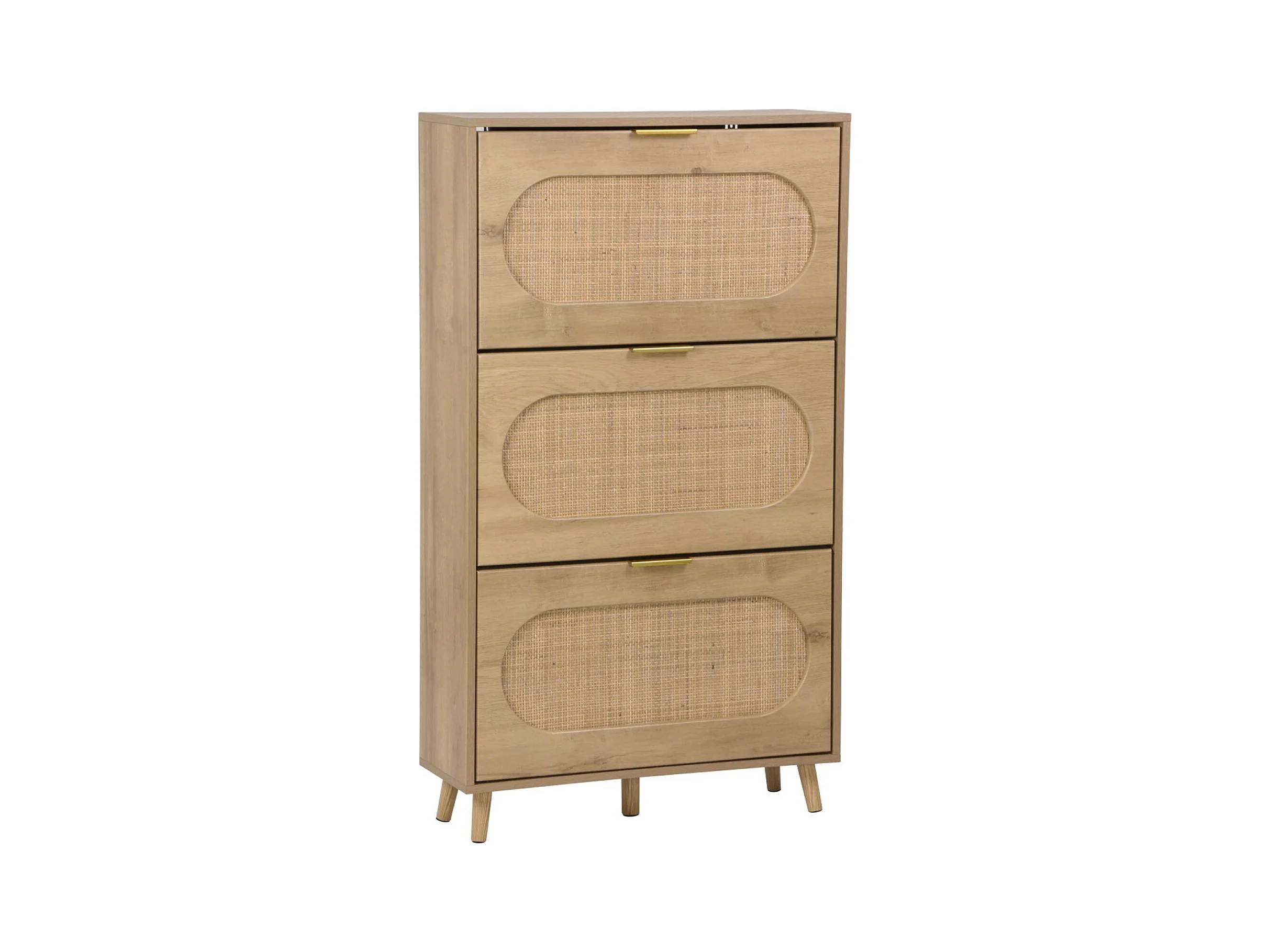 Meuble à chaussures décor bois et cannage 3 tiroirs. poignées en métal - L 75 x P 26 x H 131 cm - Eva
