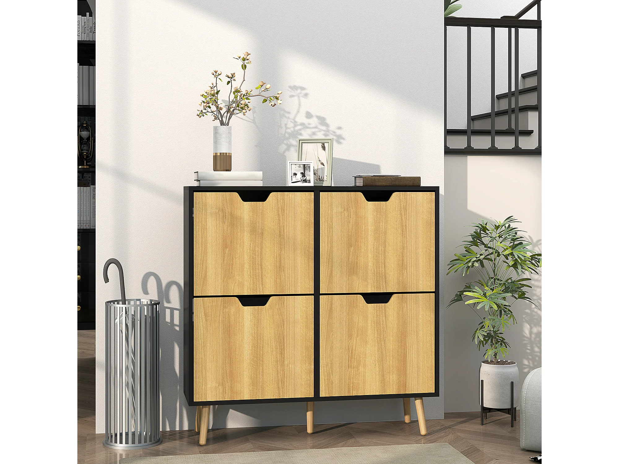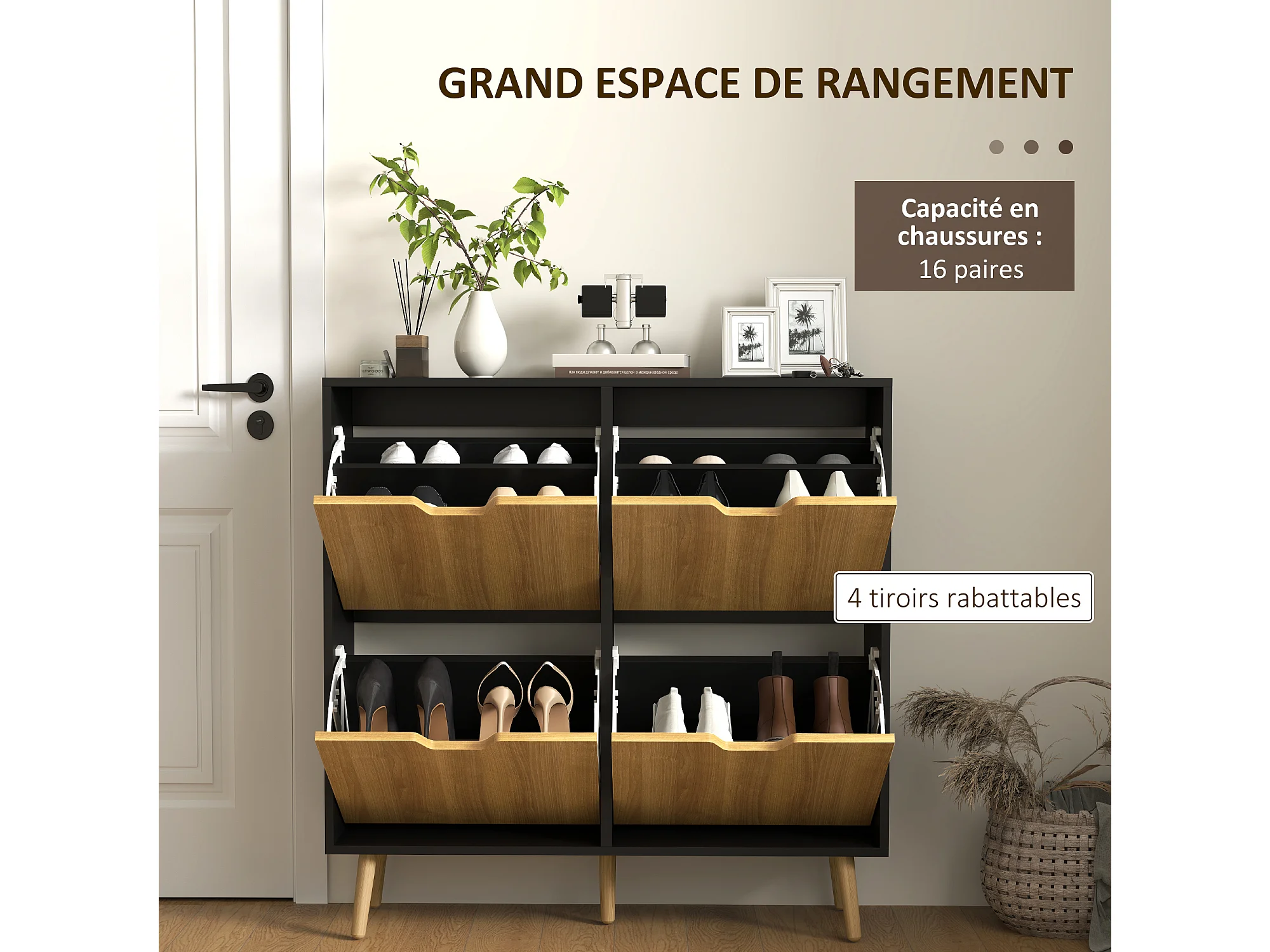 Meuble à chaussures design scandinave 4 portes abattantes 4 étagères réglables bois pin panneaux bois noir