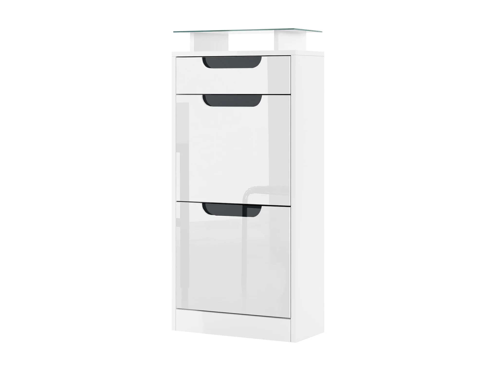 Meuble à chaussures Fiesta V2, Corps en Blanc mat / Façades en Blanc haute brillance avec un decor en Noir haute brillance