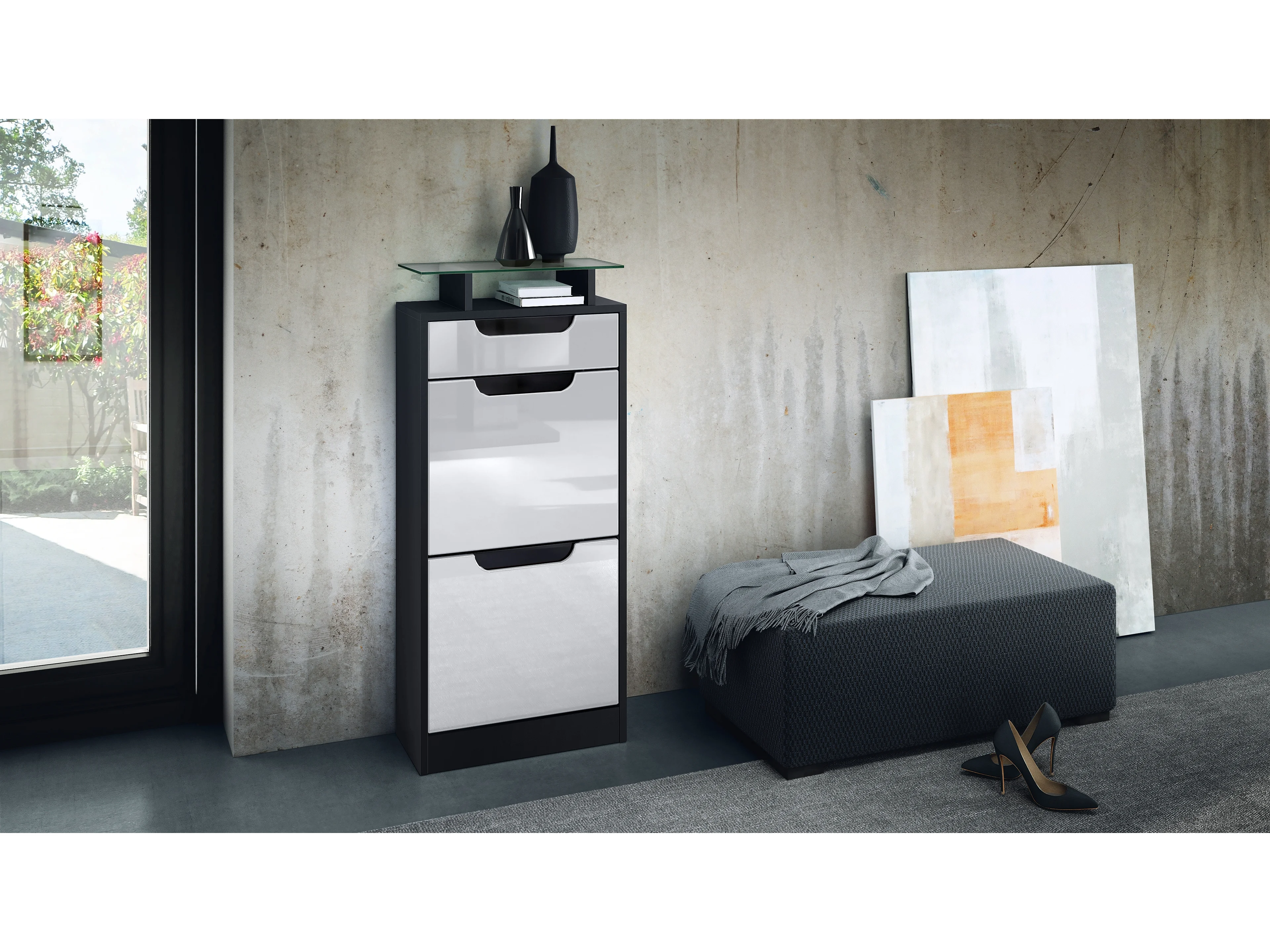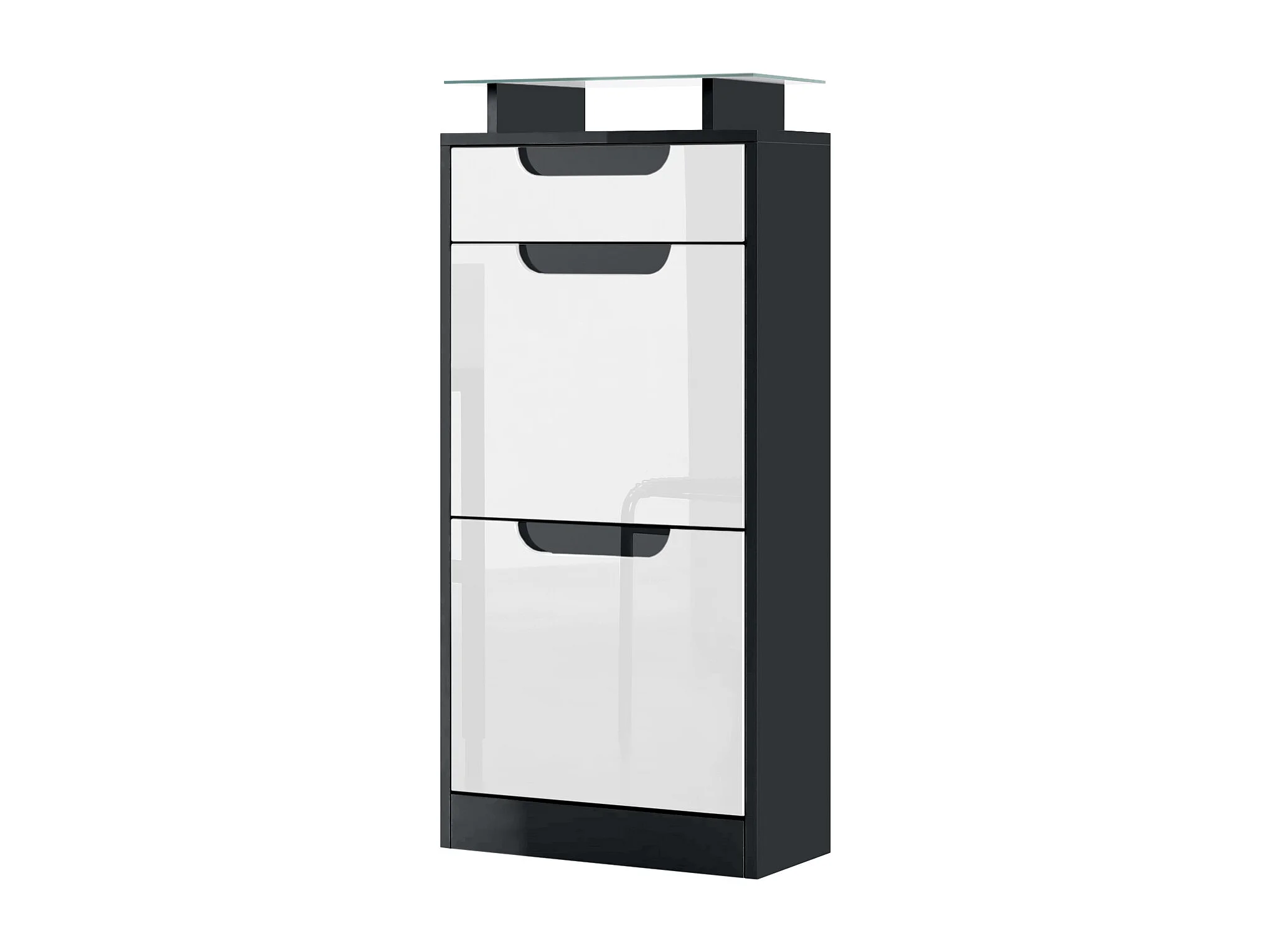 Meuble à chaussures Fiesta V2, Corps en Noir mat / Façades en Blanc haute brillance avec un decor en Noir haute brillance