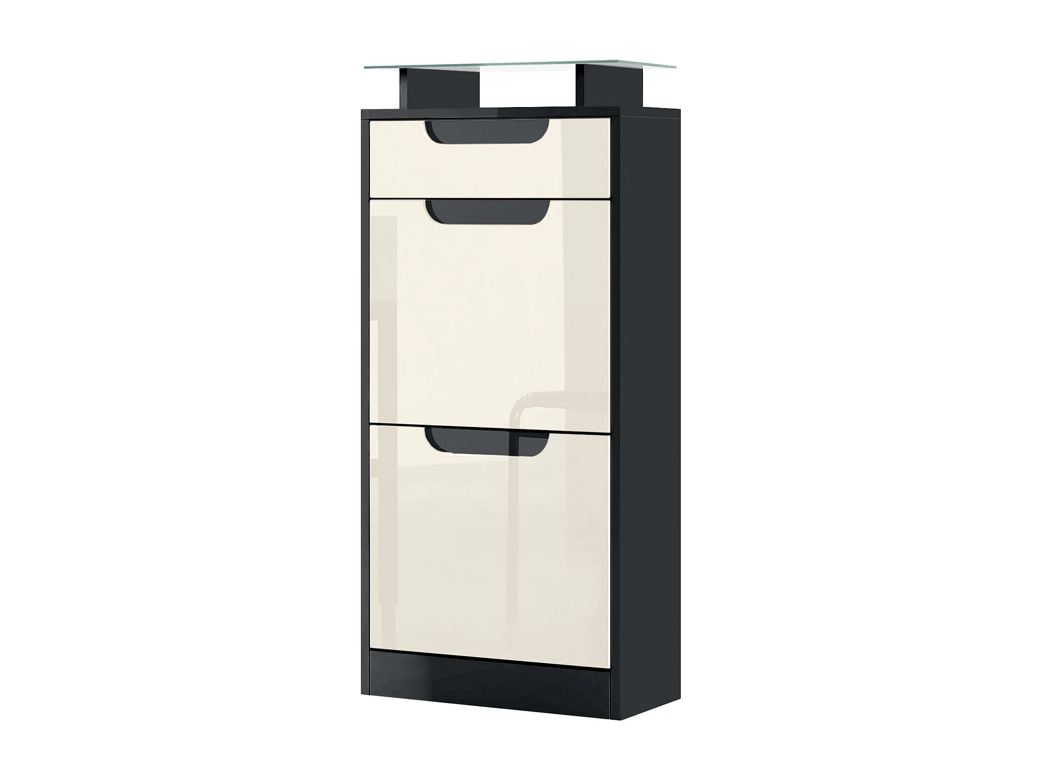 Meuble à chaussures Fiesta V2, Corps en Noir mat / Façades en Crème haute brillance avec un decor en Noir haute brillance