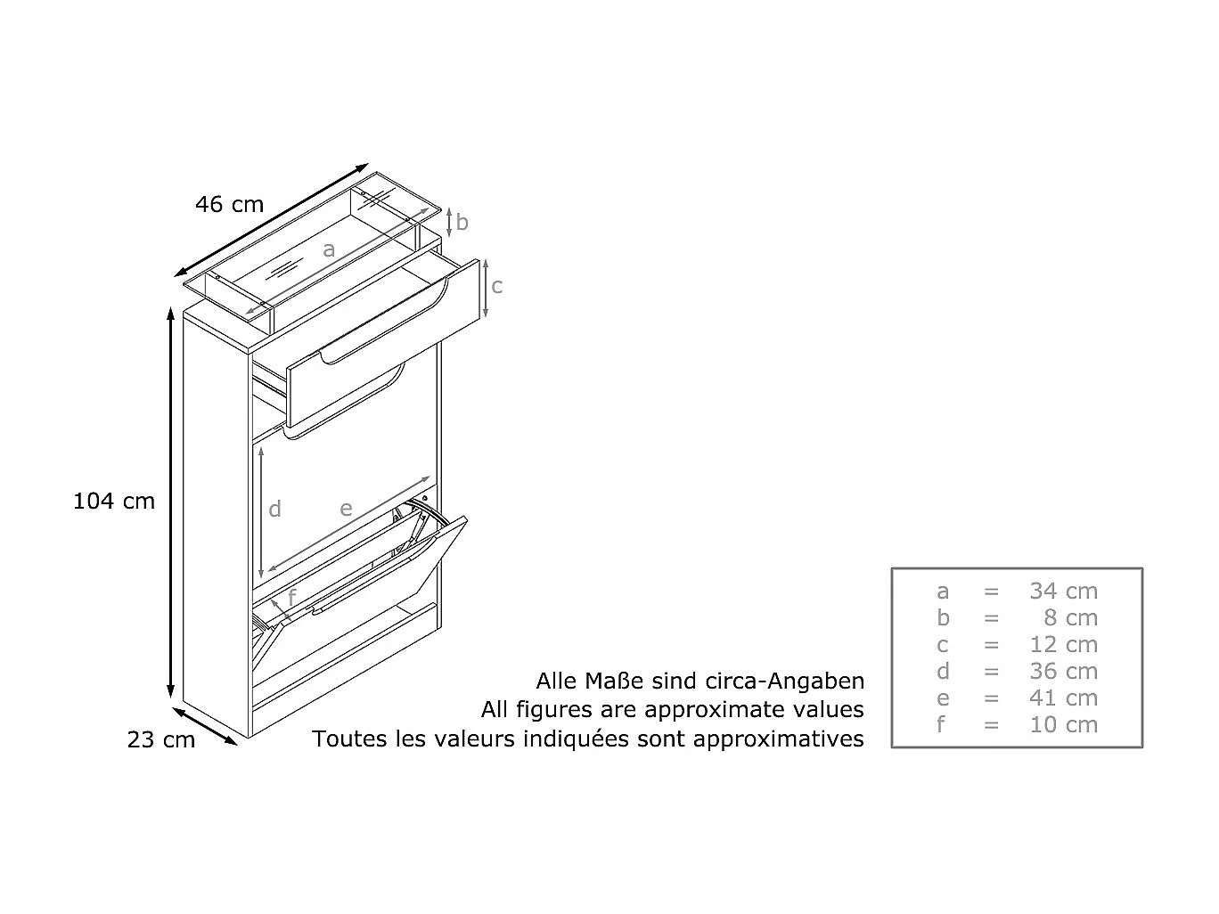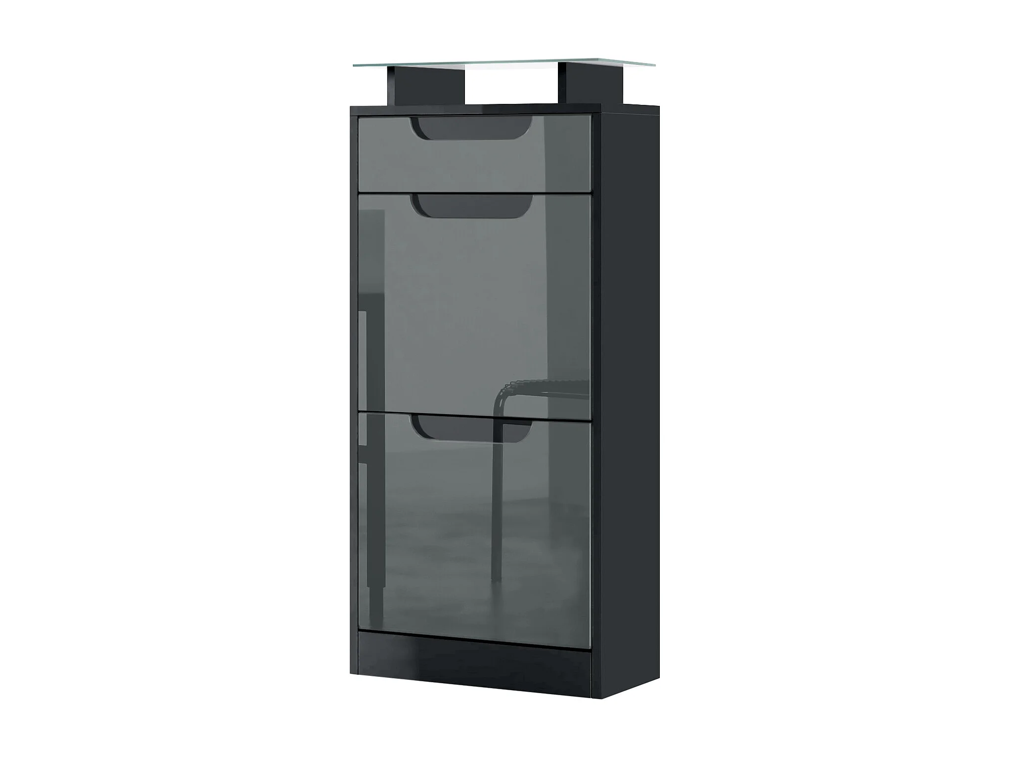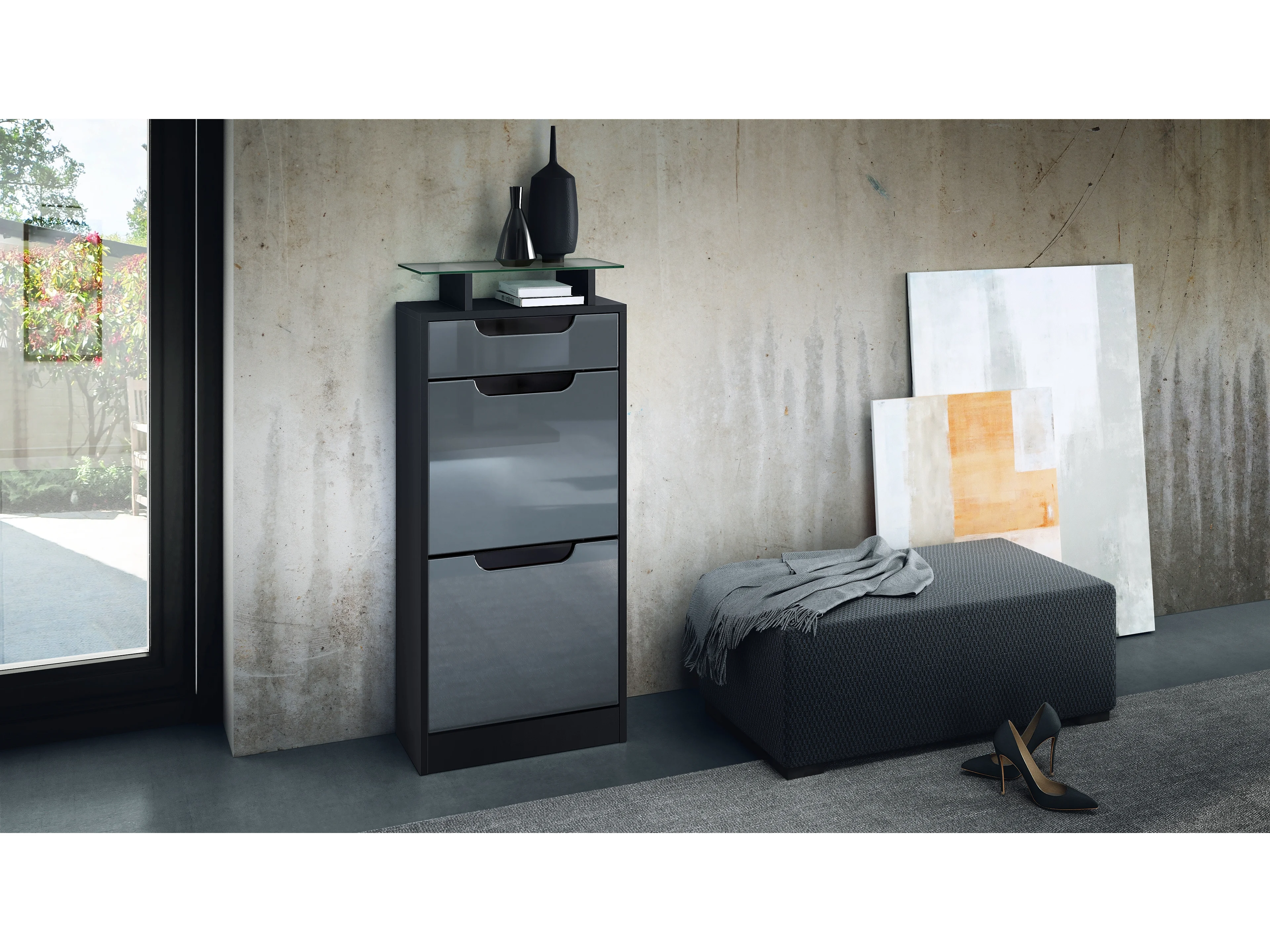 Meuble à chaussures Fiesta V2, Corps en Noir mat / Façades en Gris haute brillance avec un decor en Noir haute brillance