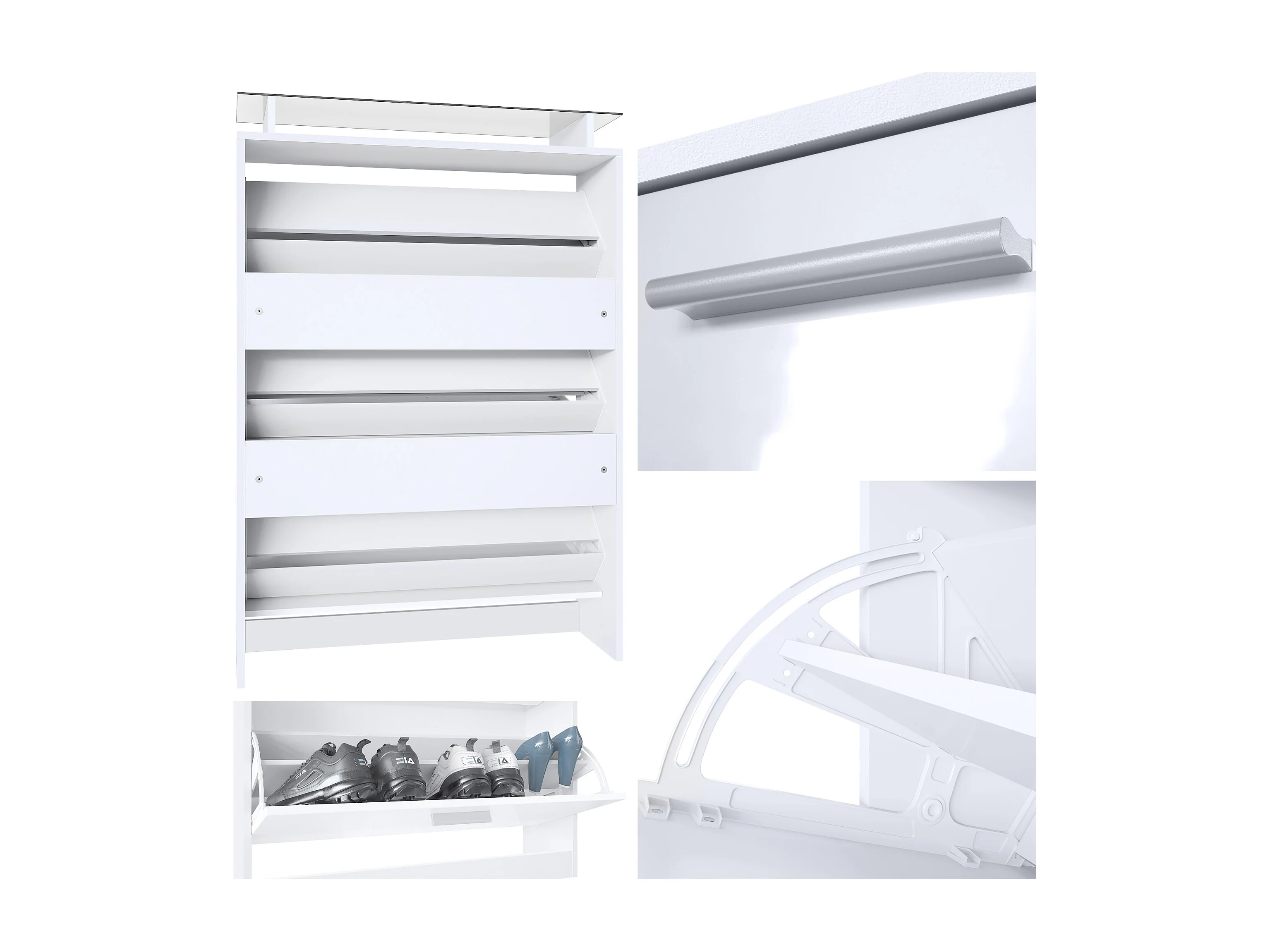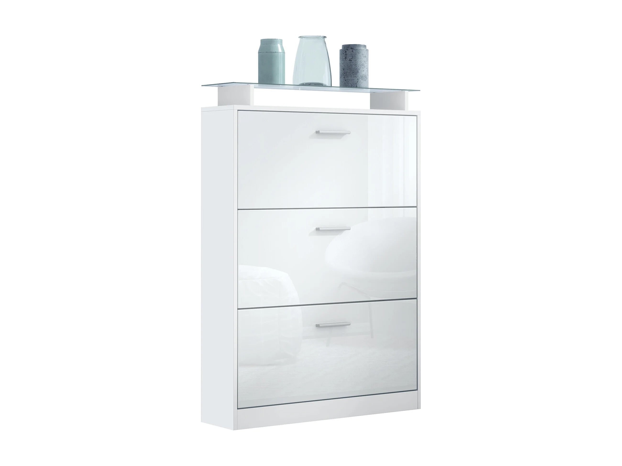 Meuble à chaussures Lavia, basculant pour 24 paires de chaussures avec 3 clapets et étagère en verre, Blanc mat/Blanc haute brillance (89 x 128 x 23 cm)
