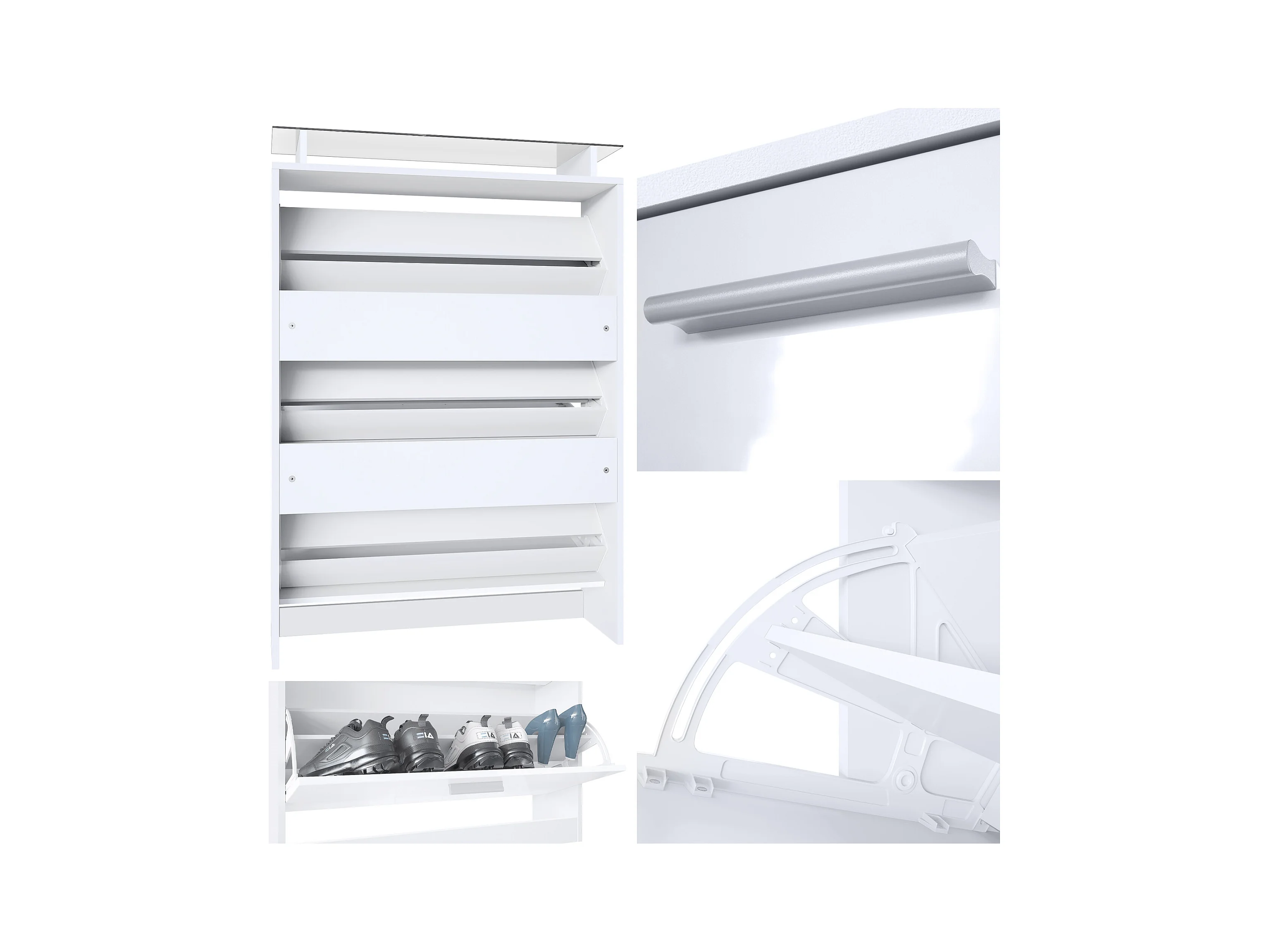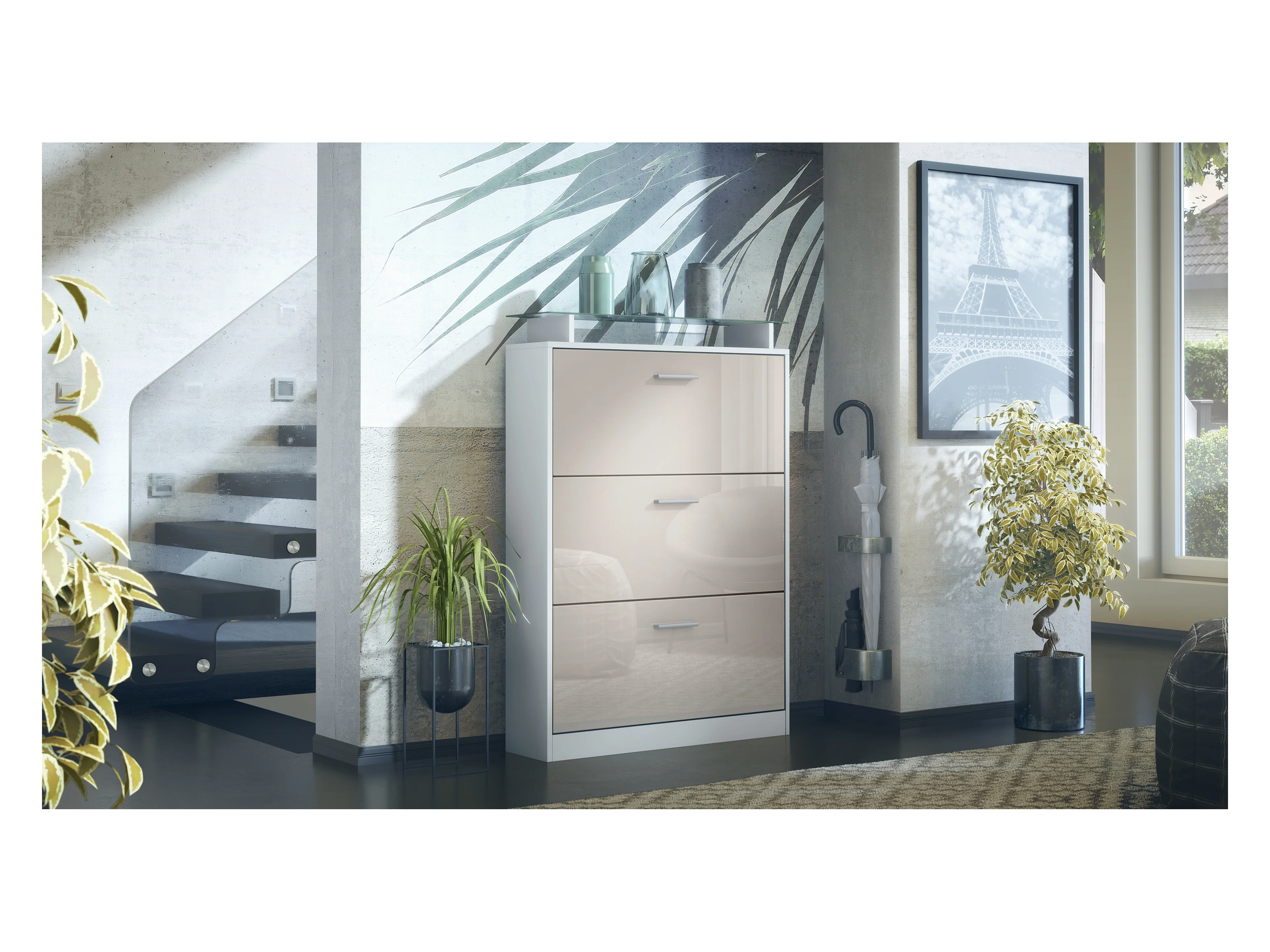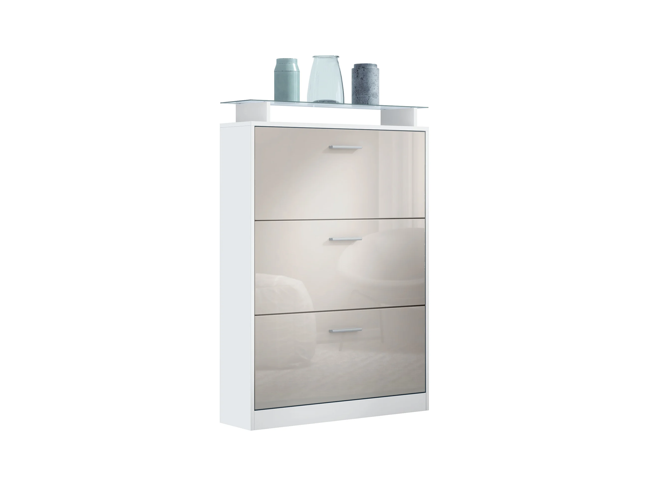 Meuble à chaussures Lavia, basculant pour 24 paires de chaussures avec 3 clapets et étagère en verre, Blanc mat/Gris sable haute brillance (89 x 128 x 23 cm)